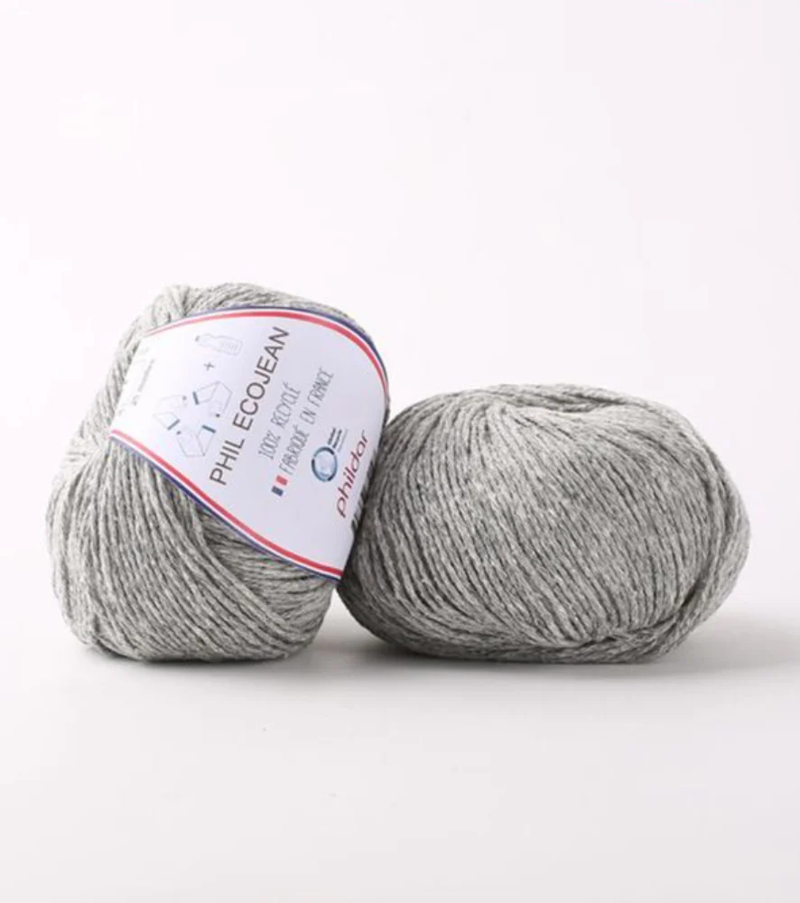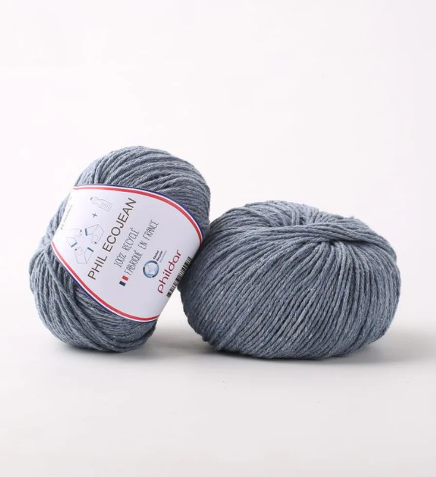 Phil Ecojean, es una fibra de algodón 100% reciclado, tiene certificación GRS y proviene del reciclado de jeans más fibras PET. Fabricado en Francia.