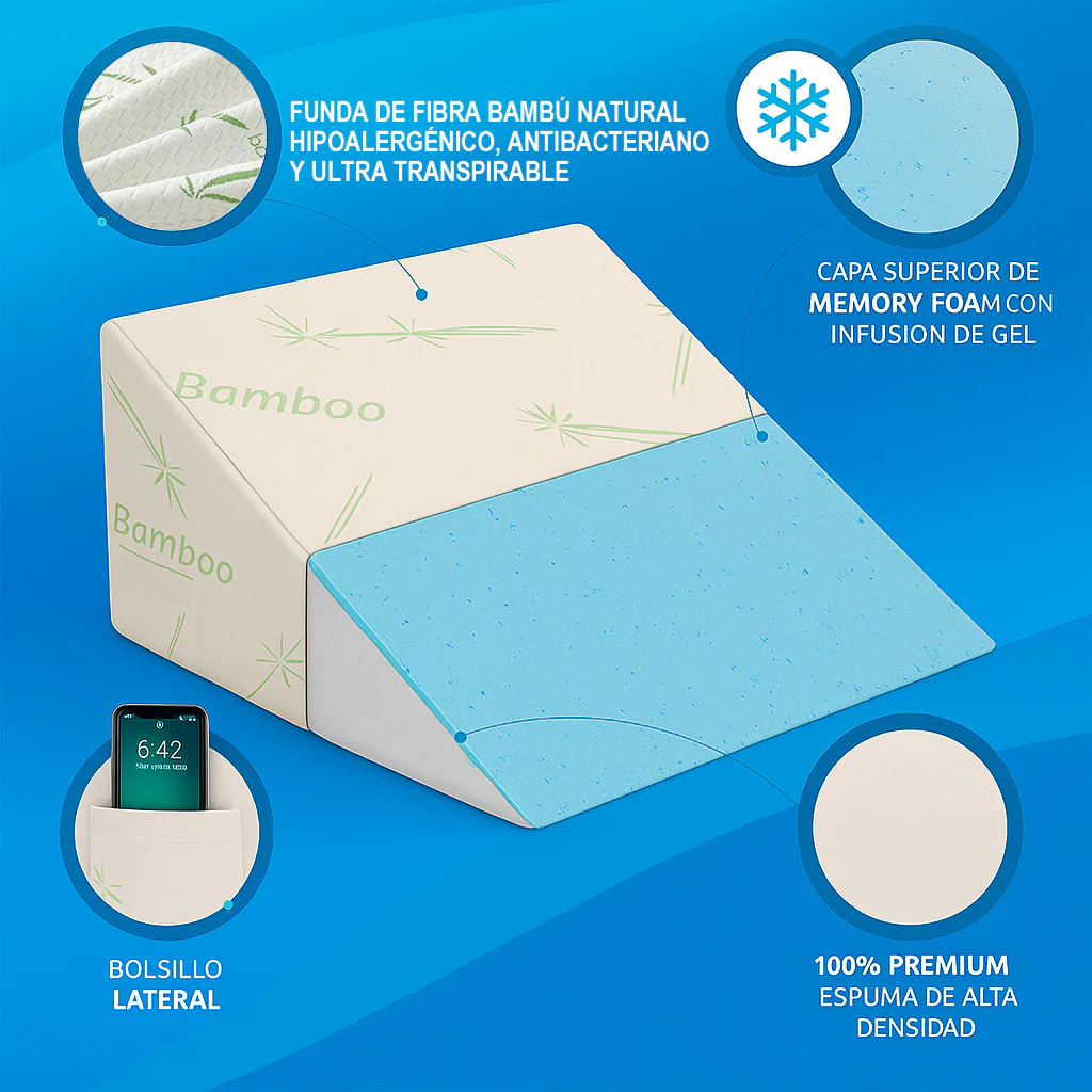 Descansa profundamente y despierta sin molestias con nuestra Almohada Antireflujo con funda de fibra de bambú, diseñada para brindarte un descanso saludable y una postura ideal durante el sueño o la recuperación.