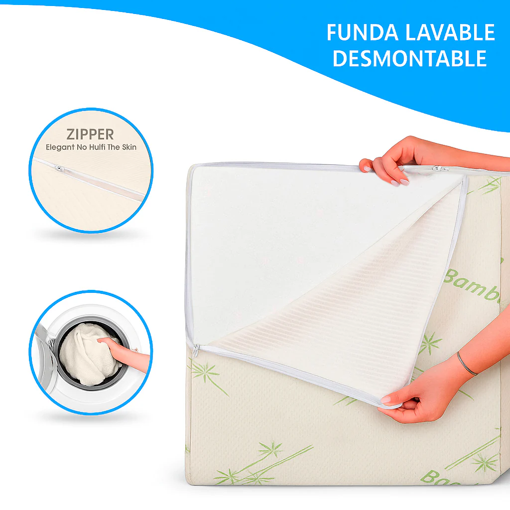 • Funda de fibra de bambú natural: tejido hipoalergénico, antibacteriano y ultra transpirable que regula la temperatura corporal, absorbe la humedad y proporciona una sensación fresca y seca durante toda la noche.