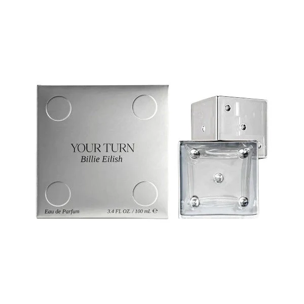 «Your Turn» es el tercer lanzamiento de Billie Eilish en el mundo de la perfumería. Esta fragancia rompe con los moldes tradicionales: es moderna, minimalista, metálica y andrógina, tanto en su presentación como en su composición. El frasco cuadrado translúcido con acabado espejo refleja el concepto de dualidad, equidad y juego entre dos personas, como lo indica su nombre.