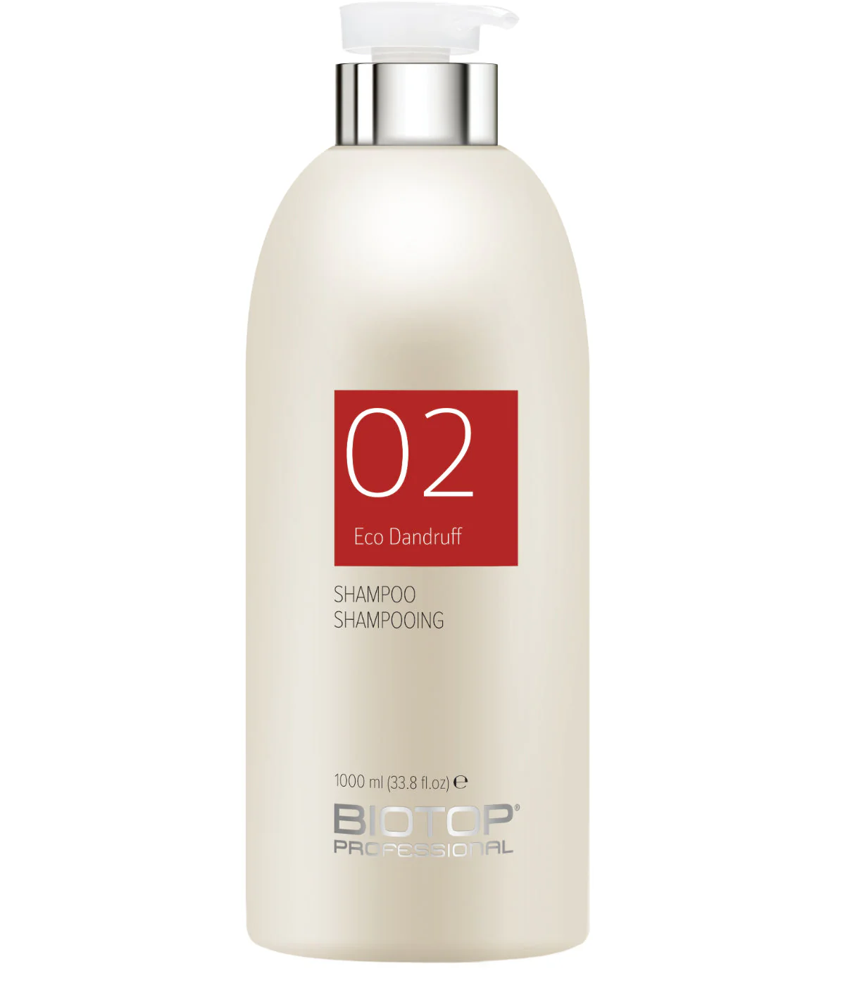Biotop 02 Eco Dandruff Shampoo 1L un champú enriquecido con Manzanilla, Piritiona de Zinc y Provitamina B5, que nutre y calma el cuero cabelludo a la vez que proporciona una prevención duradera de la caspa.