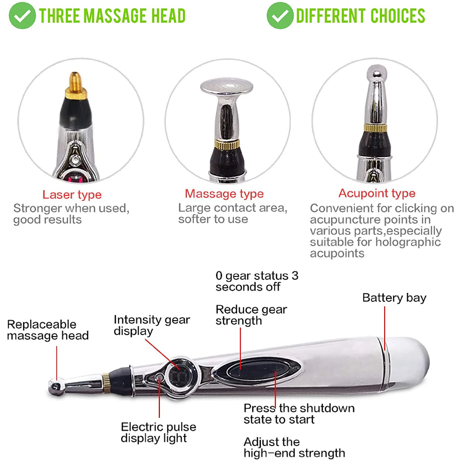 El Bolígrafo de acupuntura es una estimulación sin dolor, tipo acupuntura que utiliza un pulso eléctrico para activar los tejidos, la flacidez firme y el envejecimiento de la piel, promover la circulación sana de la sangre, desintoxicar los meridianos y ayudar a reducir el dolor muscular. Es completamente seguro para uso personal. Viene con 3 cabezales únicos y tiene 9 niveles de intensidad ajustables para satisfacer tus necesidades.
