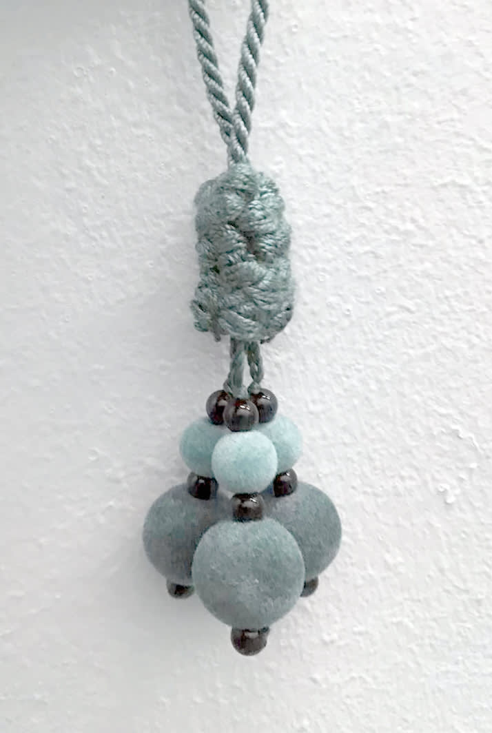 Borla decorativa para llavero, cajones, closets y muebles elegantes. Hechas de algodón trenzado, miden 6,5 cm sin considerar el lazo y mezcla el bolitas de vidrio con las de algodón estilo terciopelo. Son muy codiciadas por los decoradores.