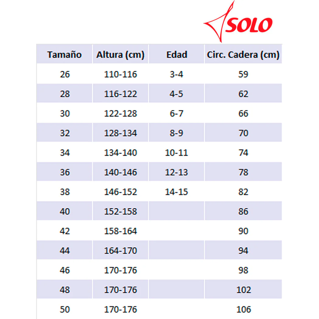 | Talla | Talla 26, Talla 28, Talla 30, Talla 32, Talla 34, Talla 36, Talla 38, Talla 40, Talla 42 |