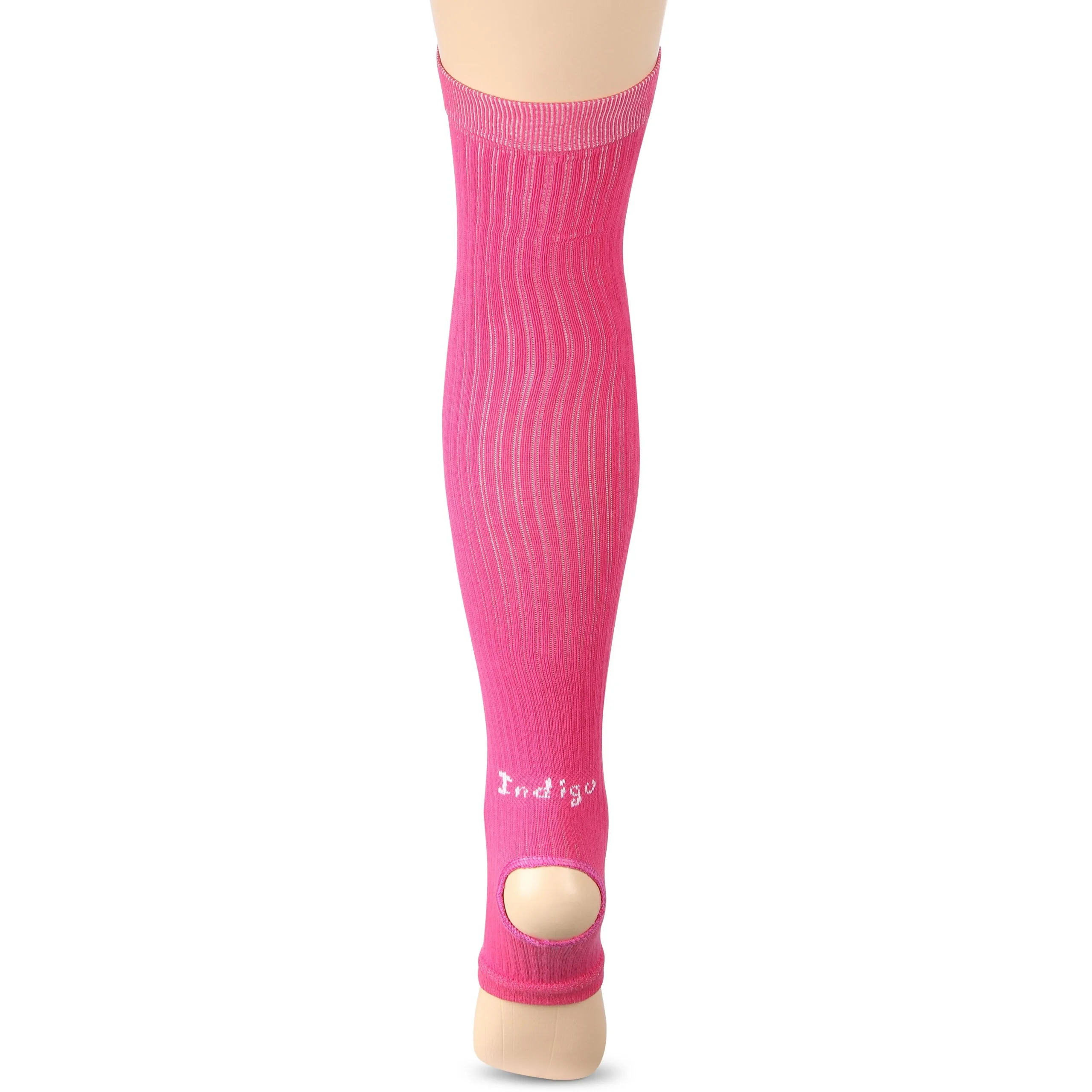 Calentadores de piernas de compresión INDIGO para gimnasia y danza con abertura en el talón. Estos calentadores están diseñados para calentar músculos y tendones durante los entrenamientos de gimnasia rítmica y danza. Previenen distensiones y lesiones. Una banda elástica tejida sujeta la pierna firmemente. Ayudan a prevenir lesiones durante ensayos y entrenamientos.