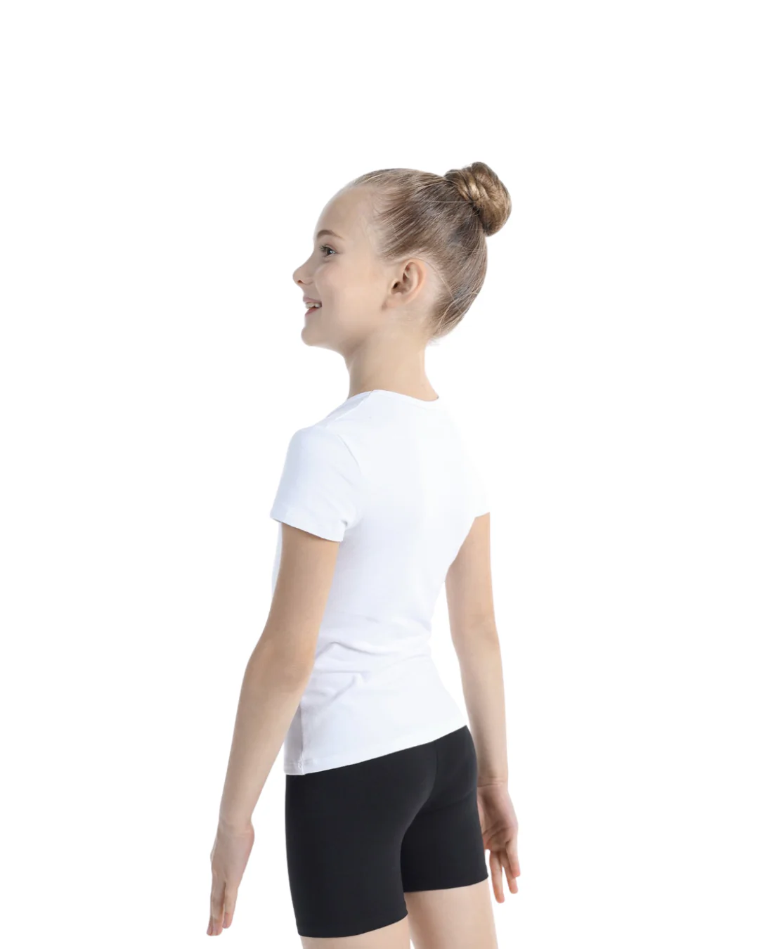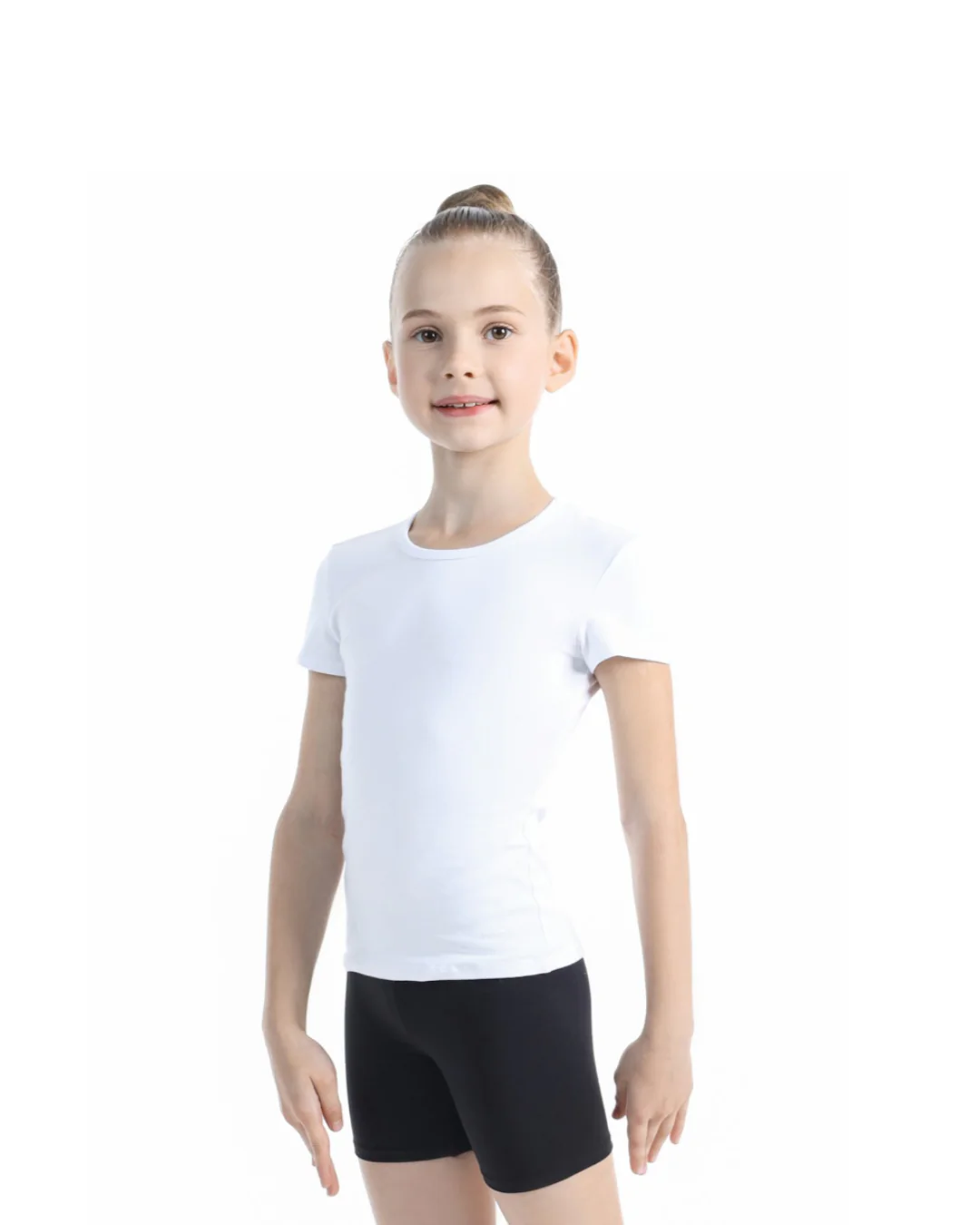 Camiseta de color blanco de silueta contigua para deportes y bailes con mangas cortas montadas.