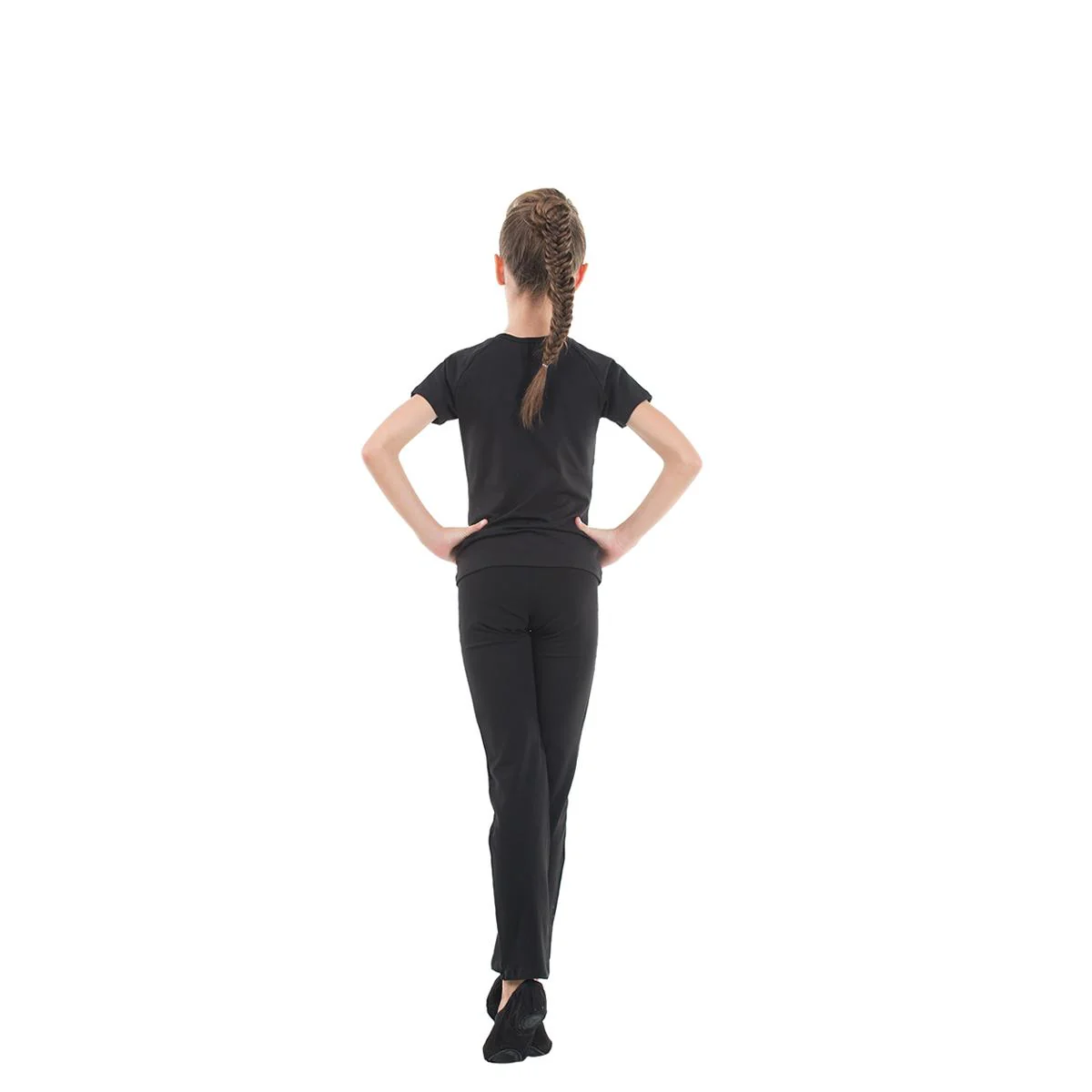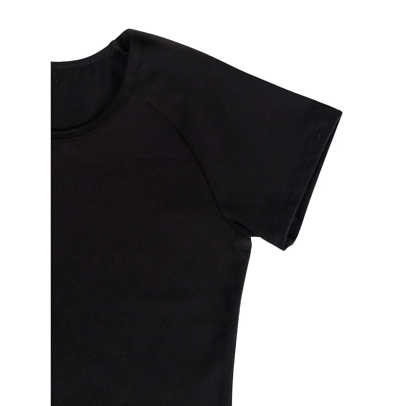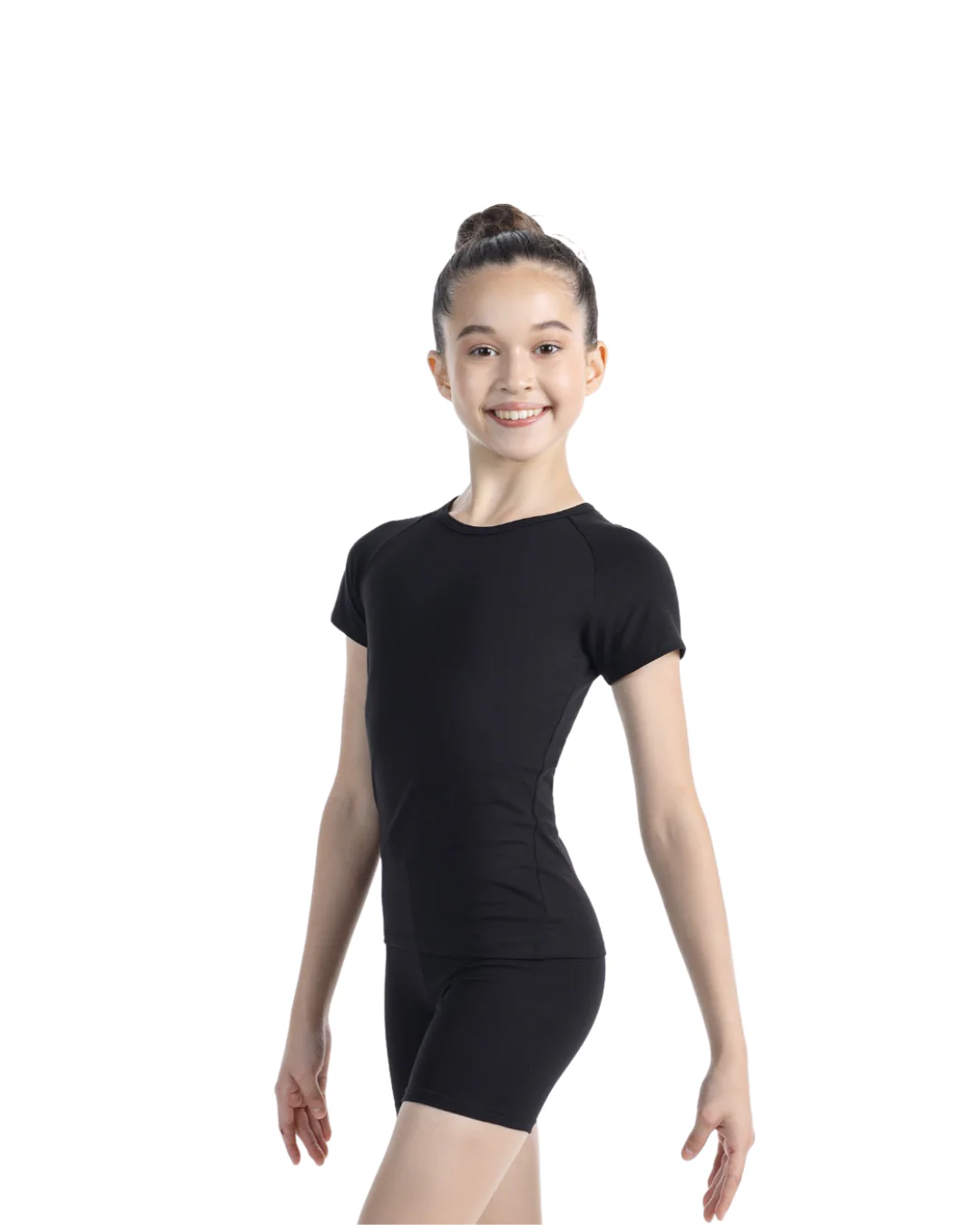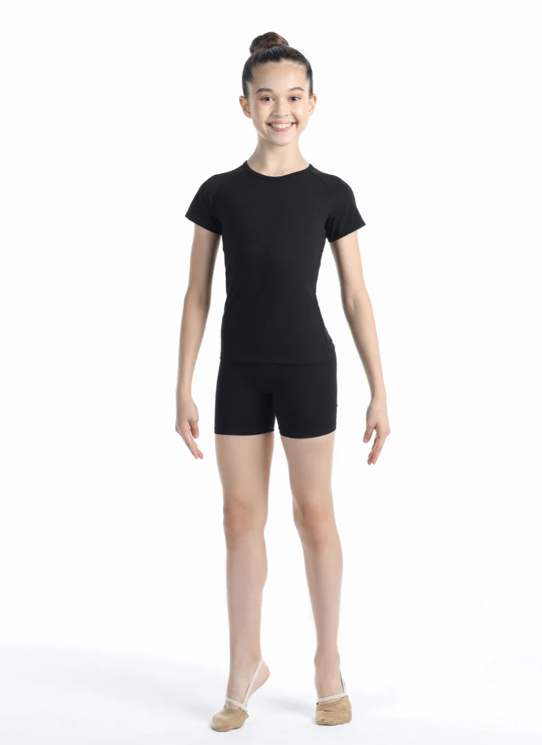 Camiseta de color negro de silueta contigua para deportes y bailes con mangas raglán.