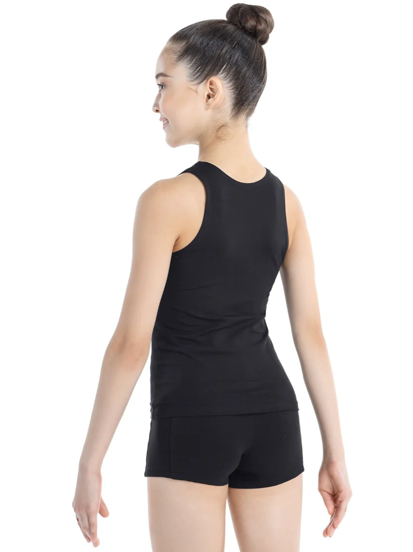 Camiseta sin mangas de algodón en color negro. Silueta entallada, espalda cerrada, tirantes de unos 3 cm. de ancho. Material: algodón con lycra, ideal para hacer deporte y bailar