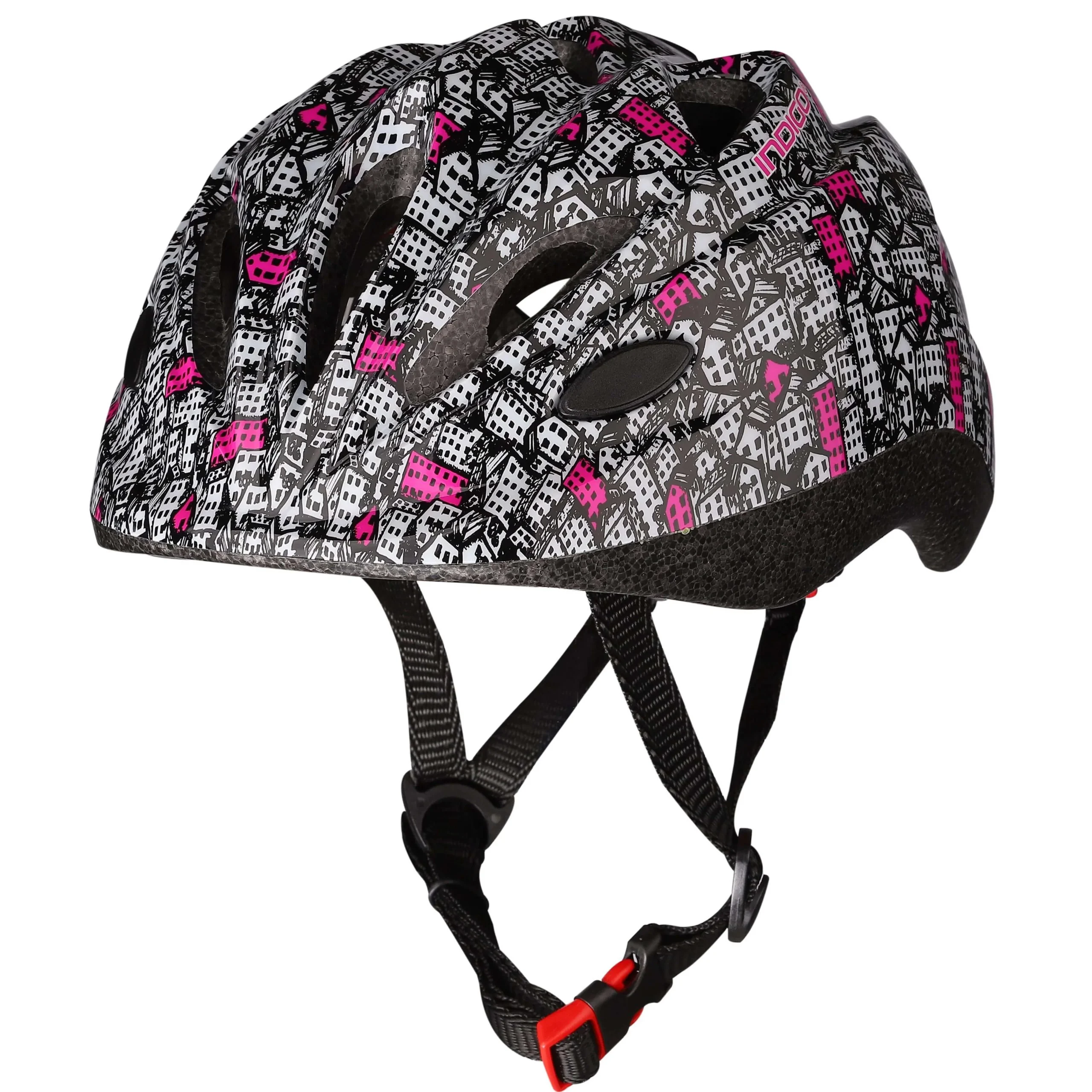 El casco de bicicleta infantil INDIGO forma parte de un equipo diseñado para proteger la cabeza de impactos durante caídas y accidentes, y es imprescindible para los conductores jóvenes en bicicletas de equilibrio, patines y bicicletas. Las ranuras de ventilación garantizan una buena ventilación de la cabeza. Hay un anillo de ajuste en la parte posterior de la cabeza para ajustar el tamaño, y además correas que proporcionan mayor ajuste.