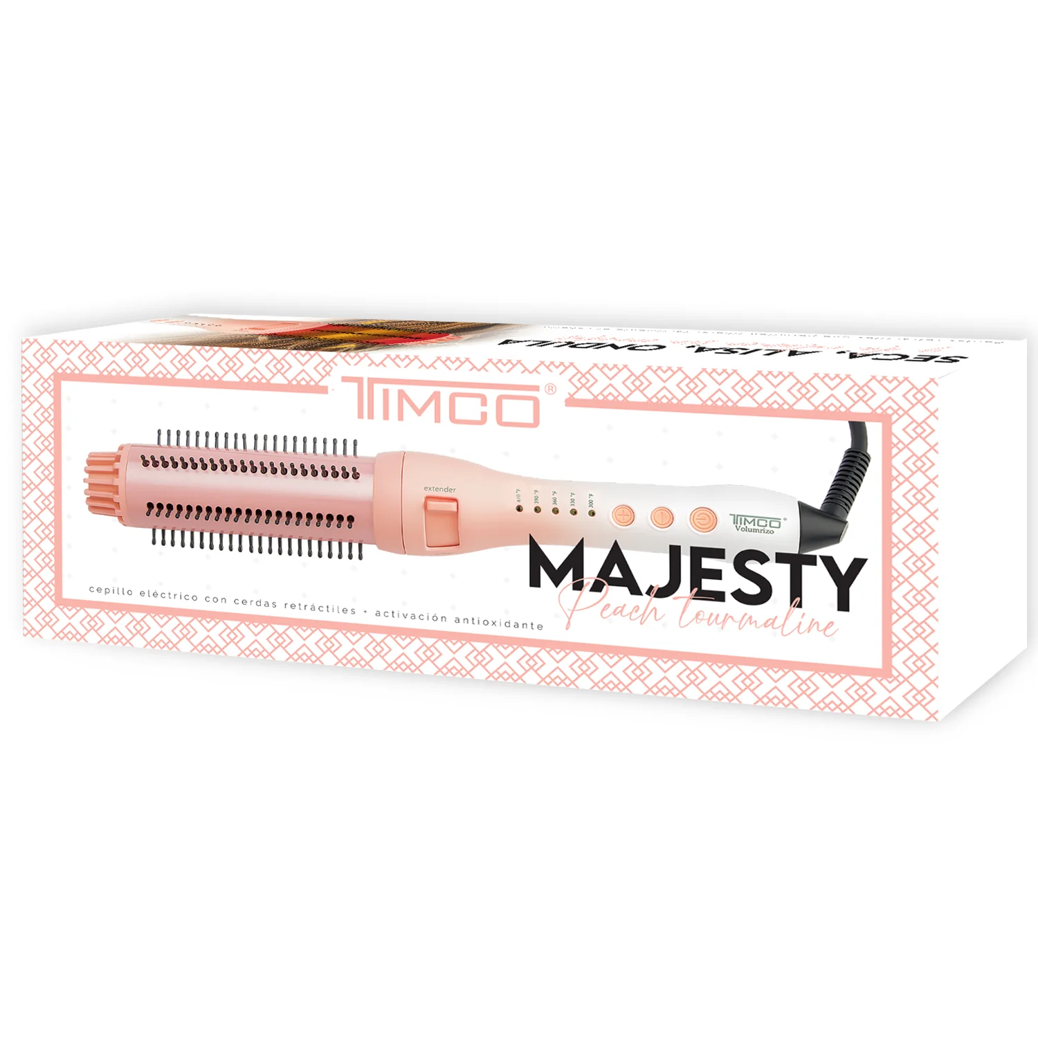 ¿Buscas un peinado deslumbrante y, al mismo tiempo, proteger tu cabello del daño diario? El Cepillo Eléctrico TIMCO CEF228, de la colección MAJESTY PEACH TOURMALINE, es la herramienta que necesitas. Este cepillo innovador no es de aire, pero combina la tecnología más avanzada con un diseño práctico para un cabello sano y radiante. ¡Es hora de lucir una melena espectacular! 💖