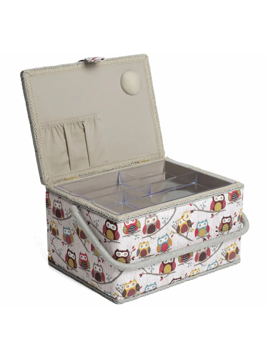 Compartimiento superior removible con secciones para productos pequeños. En la tapa interior tiene almohadilla para agujas y alfileres y distintos compartimientos elasticados y bolsillos.