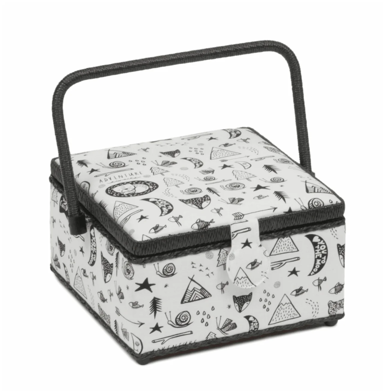 Costurero forrado en algodón con compartimientos en dos niveles, bolsillos y almohadilla en la tapa, mango en PVC. No lavar, sólo desmanchar. Medidas: 24 x 24 x 13 cm
