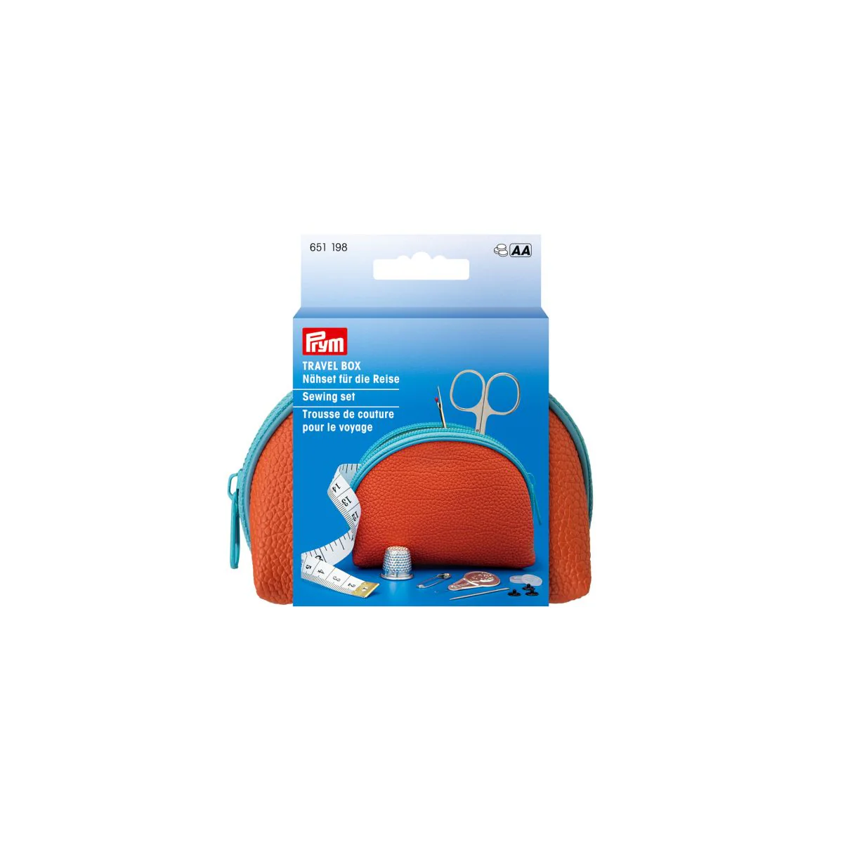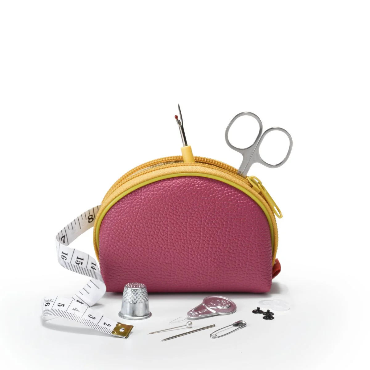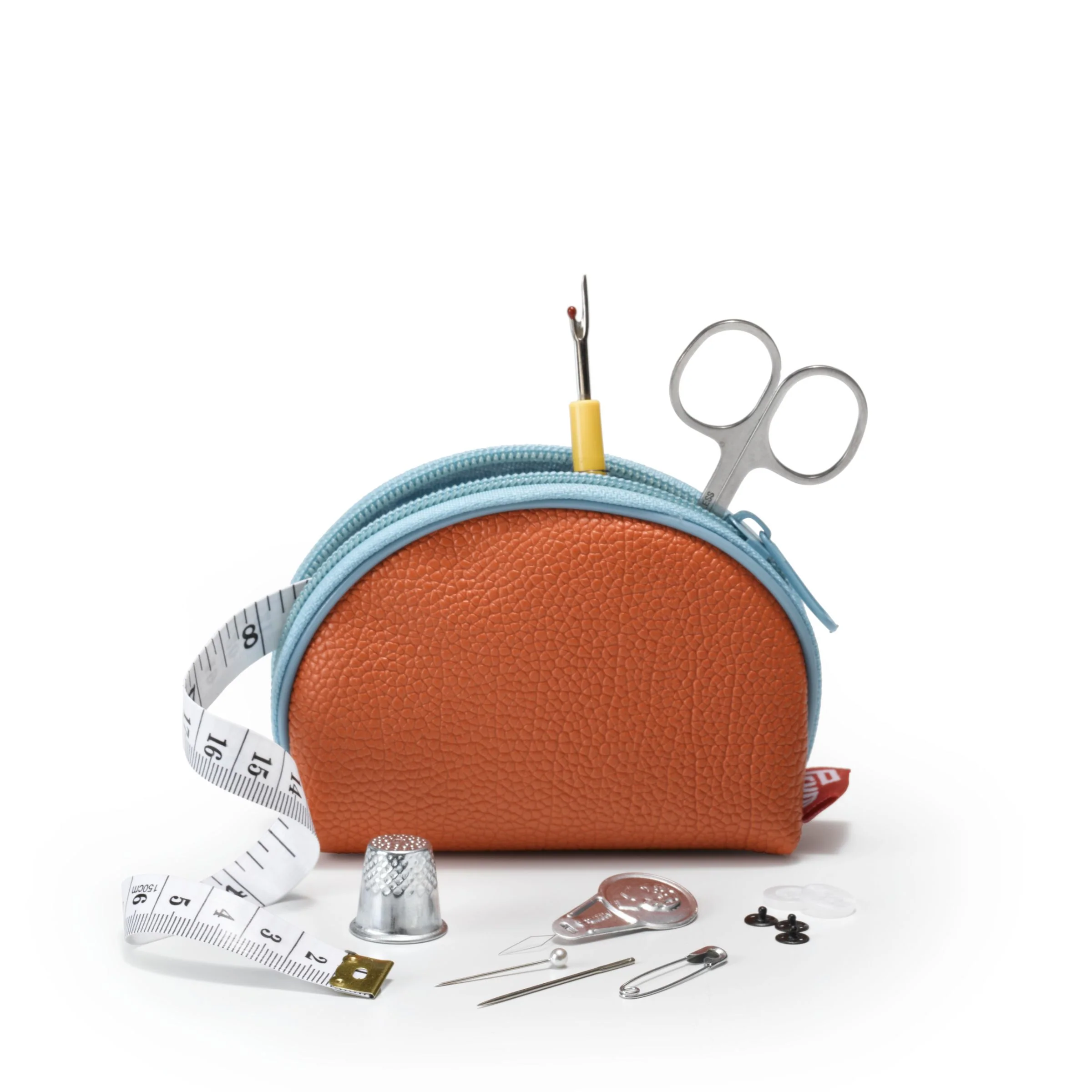 Costurero de viaje o cartera para reparaciones de emergencia. Contiene: 6 alfileres gancho, 6 botones, 1 enhebrador, 16 agujas, 20 alfileres, 1 dedal, 8 bobinas de hilo en diferentes colores, 1 descosedor, 1 huincha y 1 tijera de acero.
