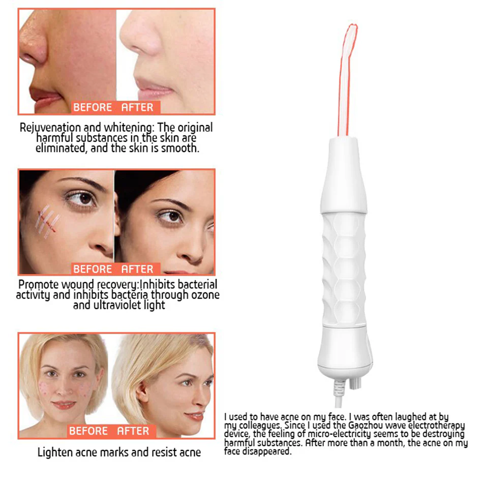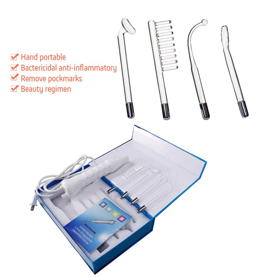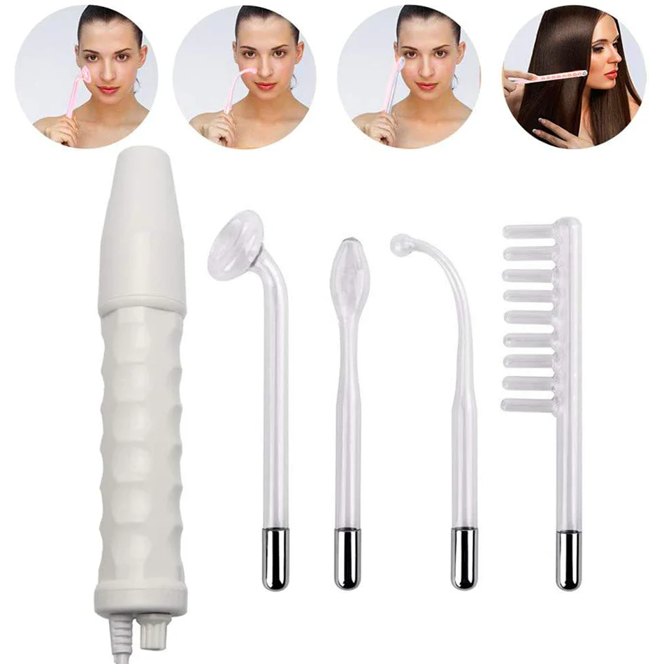- Cuatro electrodos para adaptarse a tus necesidades: puedes elegir los diferentes electrodos para resolver cualquier problema: tubo de hongo para área amplia; tubo de lengua para zonas sensibles, como círculos oscuros debajo de los ojos; tubo de flexión para zonas puntuales acné, granos; tubo de peine para estimular la circulación del cuero cabelludo para crecer nuevo cabello.