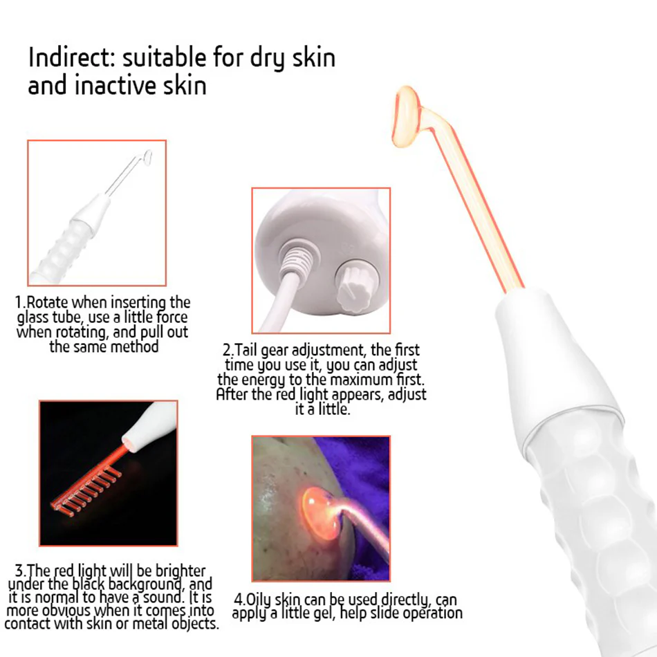 - Fácil de usar: inserta el electrodo de vidrio deseado en la máquina de alta frecuencia, empuja suavemente el electrodo y solo debe encajar en su lugar. A continuación, gira la máquina de alta frecuencia a un nivel cero y enciéndela. Es seguro y portátil.