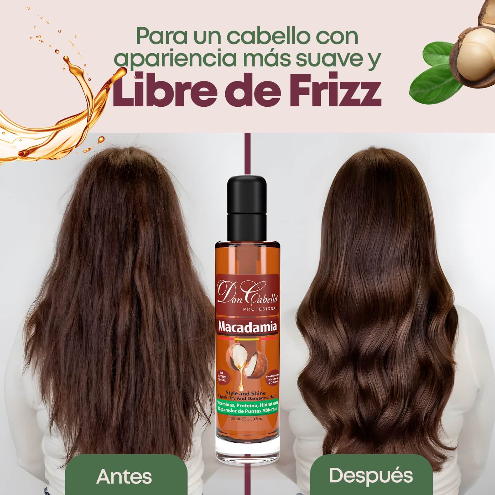 ¿Cabello seco, quebradizo y sin vida? ¡No te resignes! Con el Serum Reparador de Cabello Don Cabello Aceite de Macadamia, podrás transformar tu melena y disfrutar de un cabello suave, fuerte y lleno de vitalidad.