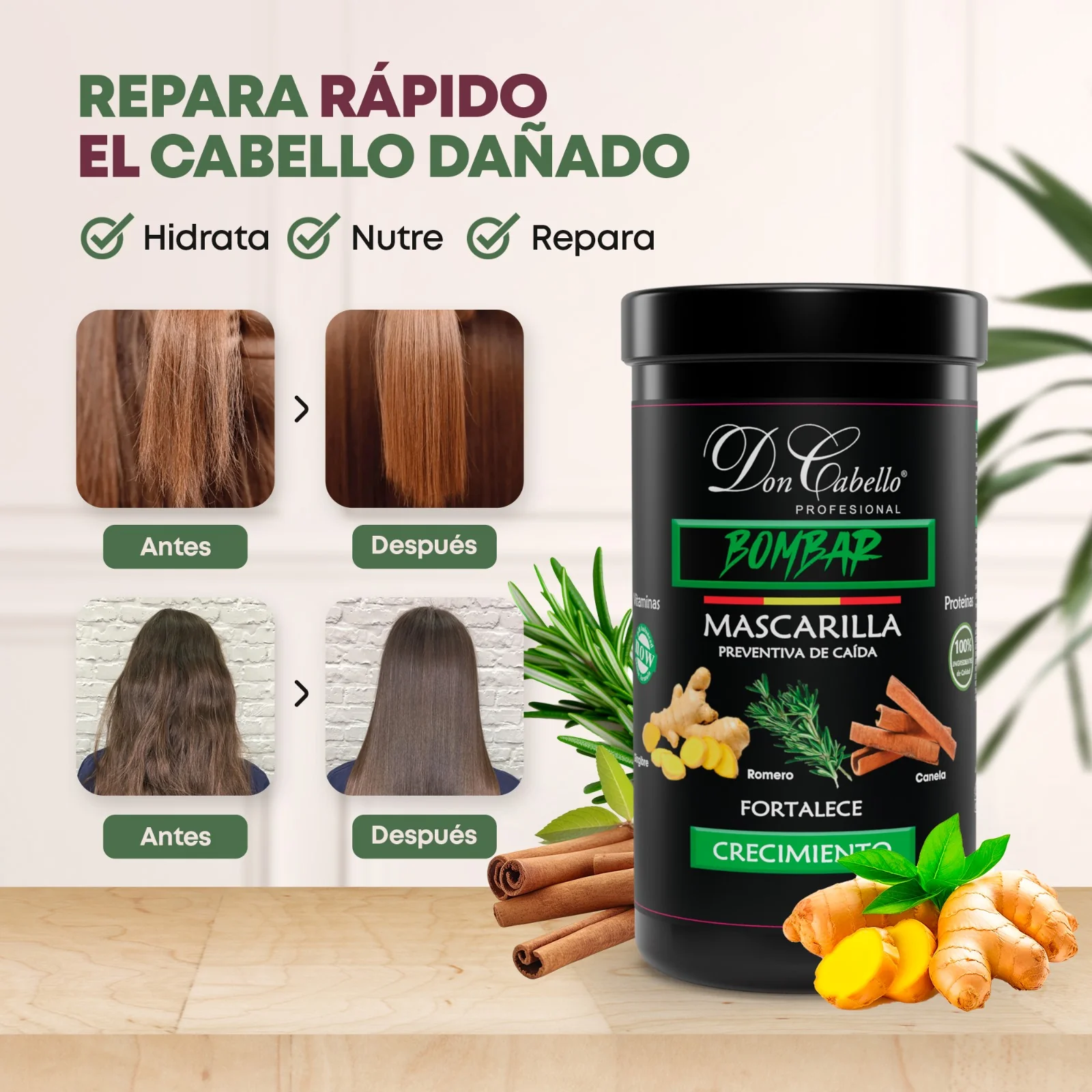 🌿 SOLUCIÓN TOTAL PARA EL CUIDADO DEL CABELLO – Enriquecida con romero, canela y jengibre, esta superhidratante mascarilla penetra profundamente en el cabello, reparando el daño desde el interior y fortaleciendo las hebras débiles para prevenir la rotura y la caída.