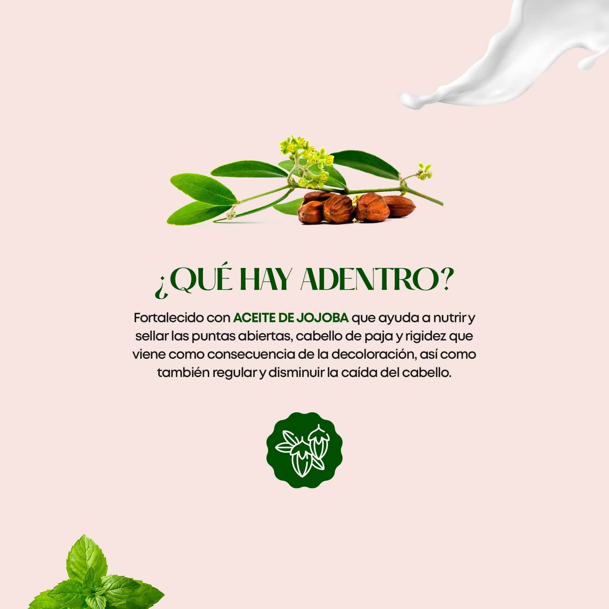 FORMULADO CON ACEITE DE JOJOBA: Fortalecido con aceite de jojoba que ayuda a nutrir y sellar las puntas abiertas, cabello de paja y rigidez que viene como consecuencia de la decoloración, así como también regular y disminuir la caída del cabello. Ayuda a potenciar el color y recuperar la estructura natural del cabello.