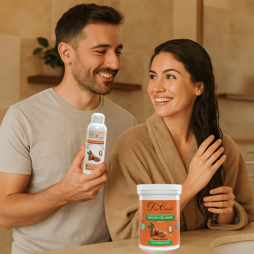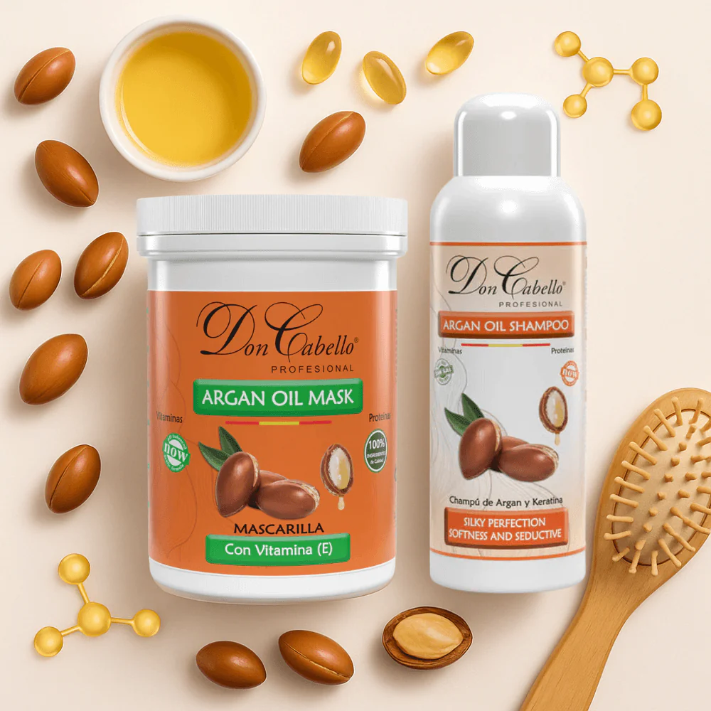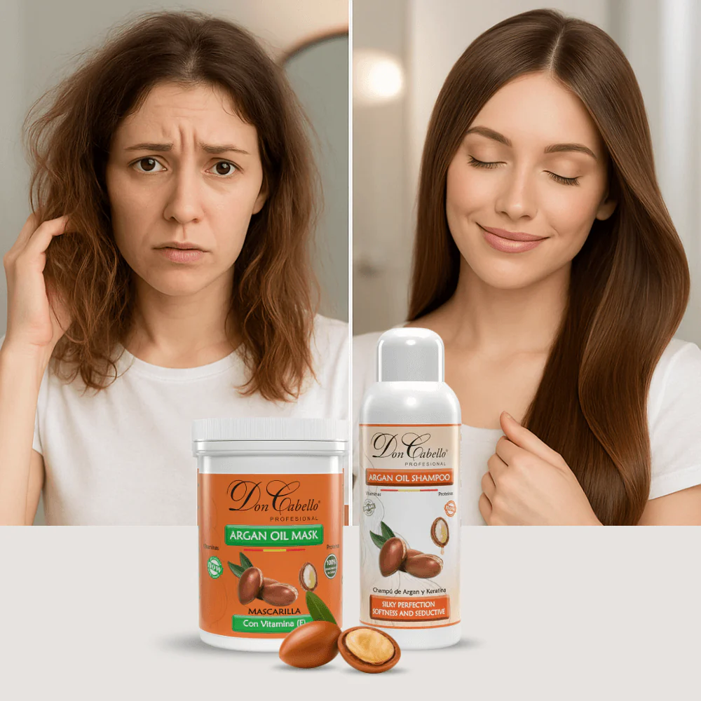 Este pack capilar de Don Cabello está formulado para mejorar la textura, suavidad y resistencia del cabello seco o dañado. Contiene un champú sin sales agresivas y una mascarilla nutritiva que combinan keratina vegetal, aceite de argán y vitamina E.