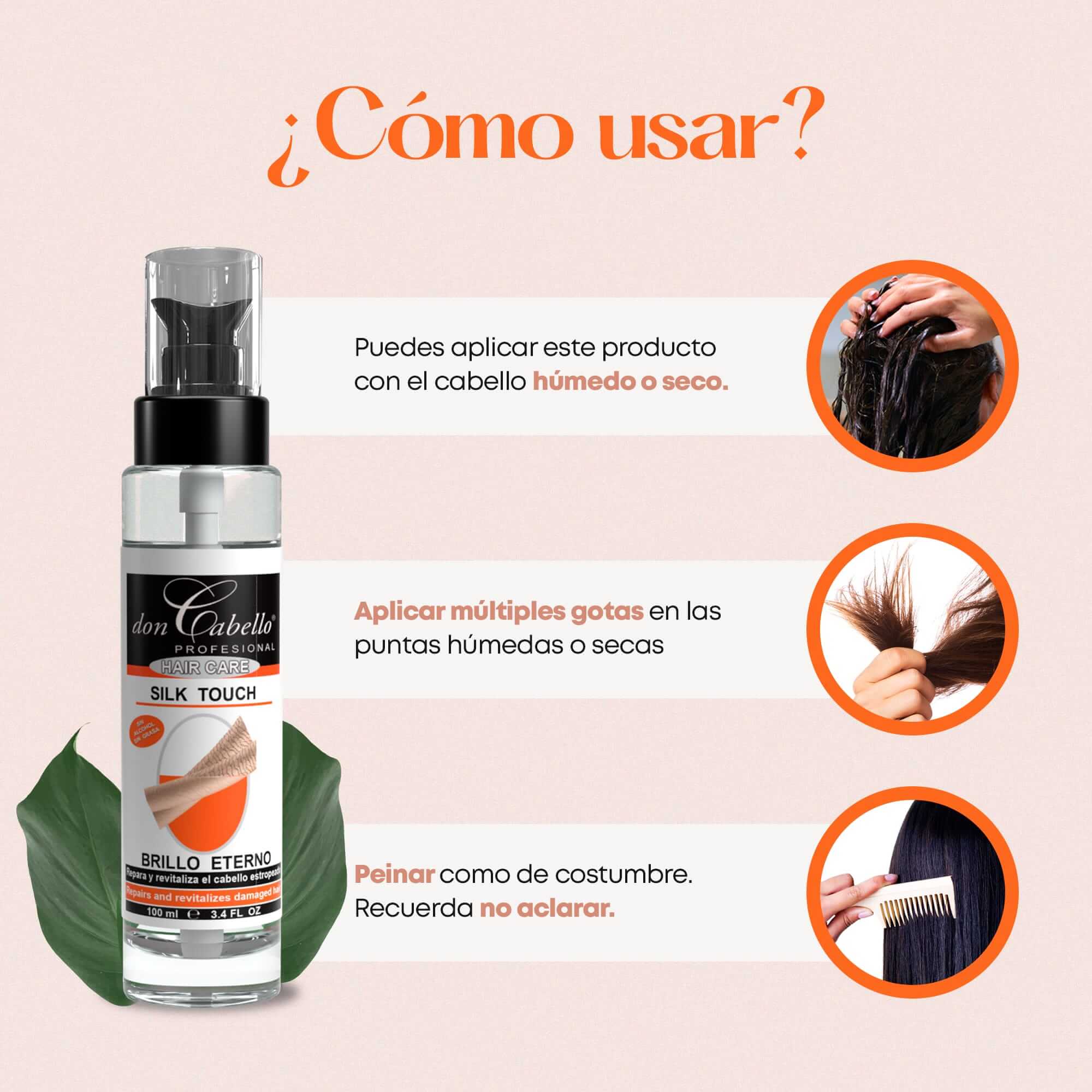 FÁCIL APLICACIÓN: Se debe aplicar en las puntas del cabello antes de peinar, con el cabello húmedo o seco. Si tienes el cabello maltratado y deshidratado. También es ideal para aplicar en la piel para otorgar un efecto jugoso e hidratado. No necesita aclarado.