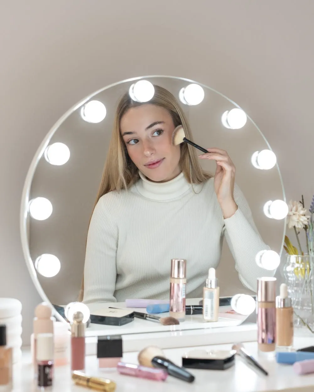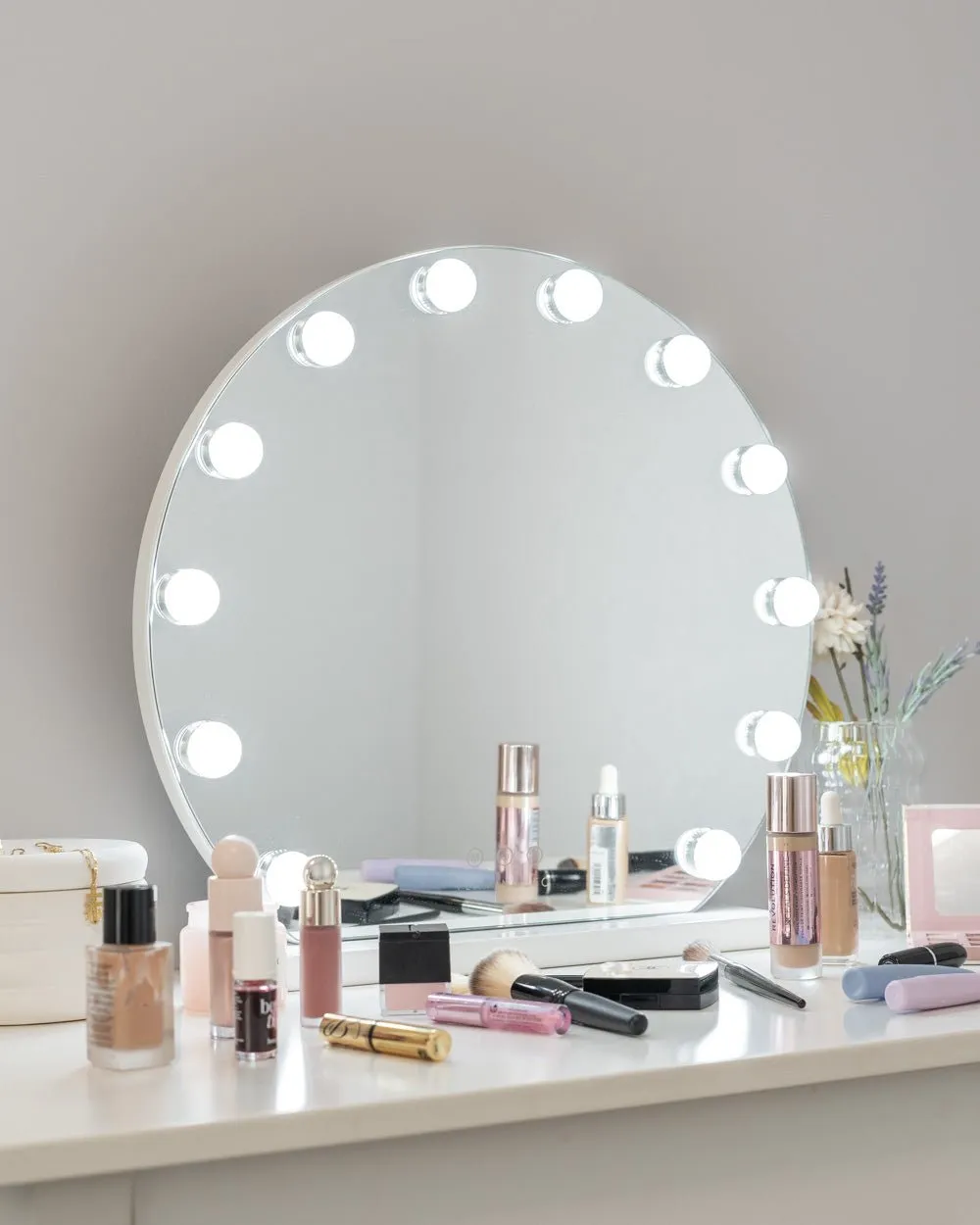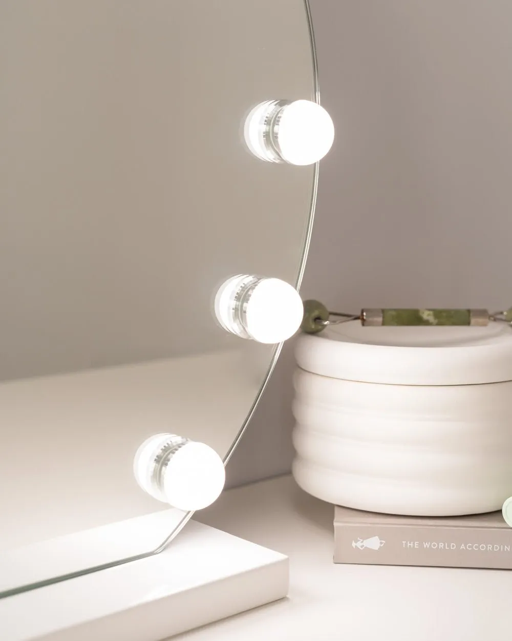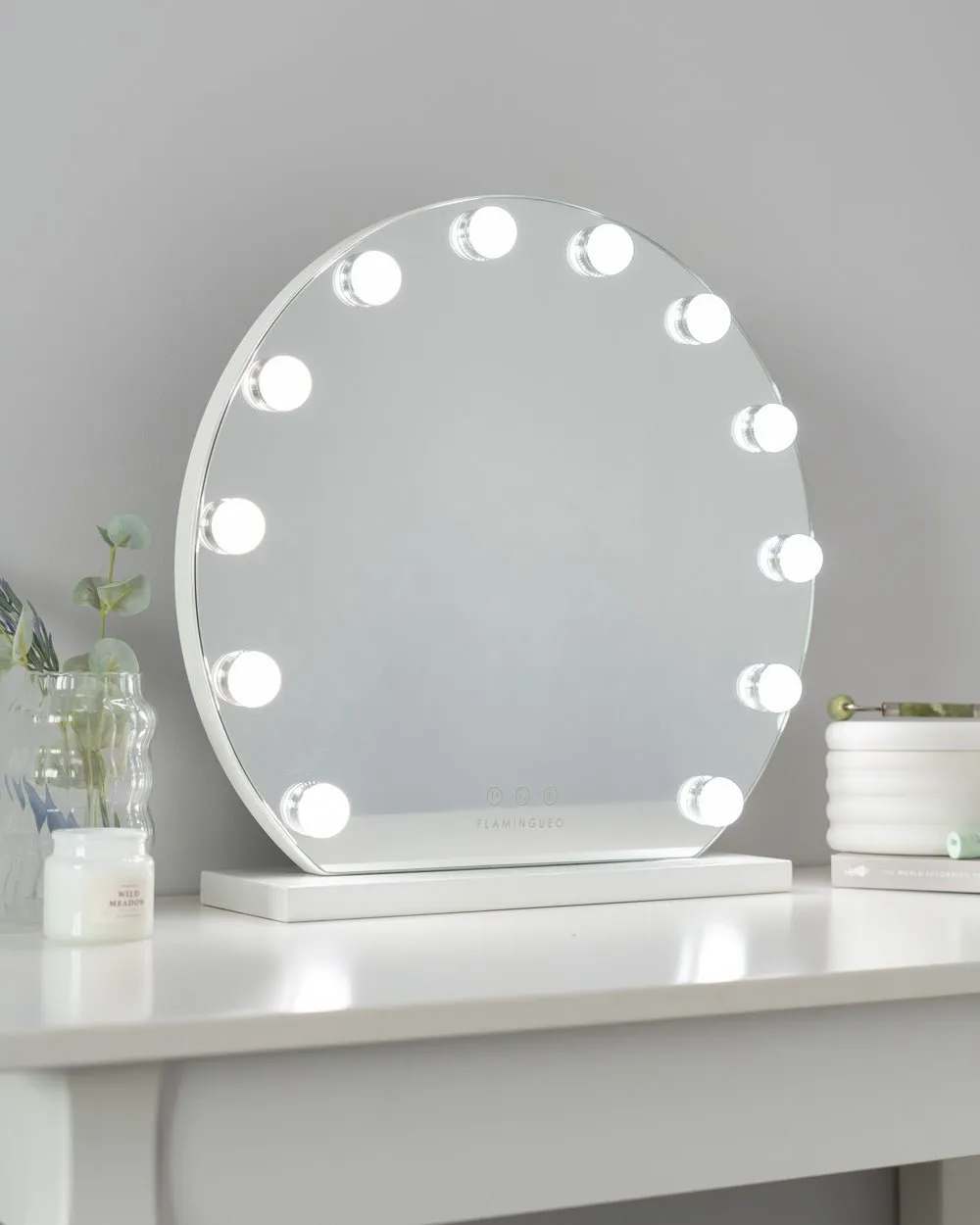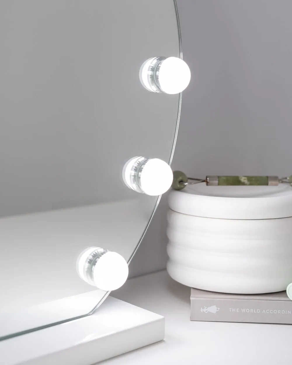 El espejo semicircular con 12 bombillas LED estilo hollywood es perfecto para maquillarte y hacer tus rutinas de belleza y darle un toque elegante a tu tocador. Ajusta el color e intensidad de la luz con los botones táctiles.
