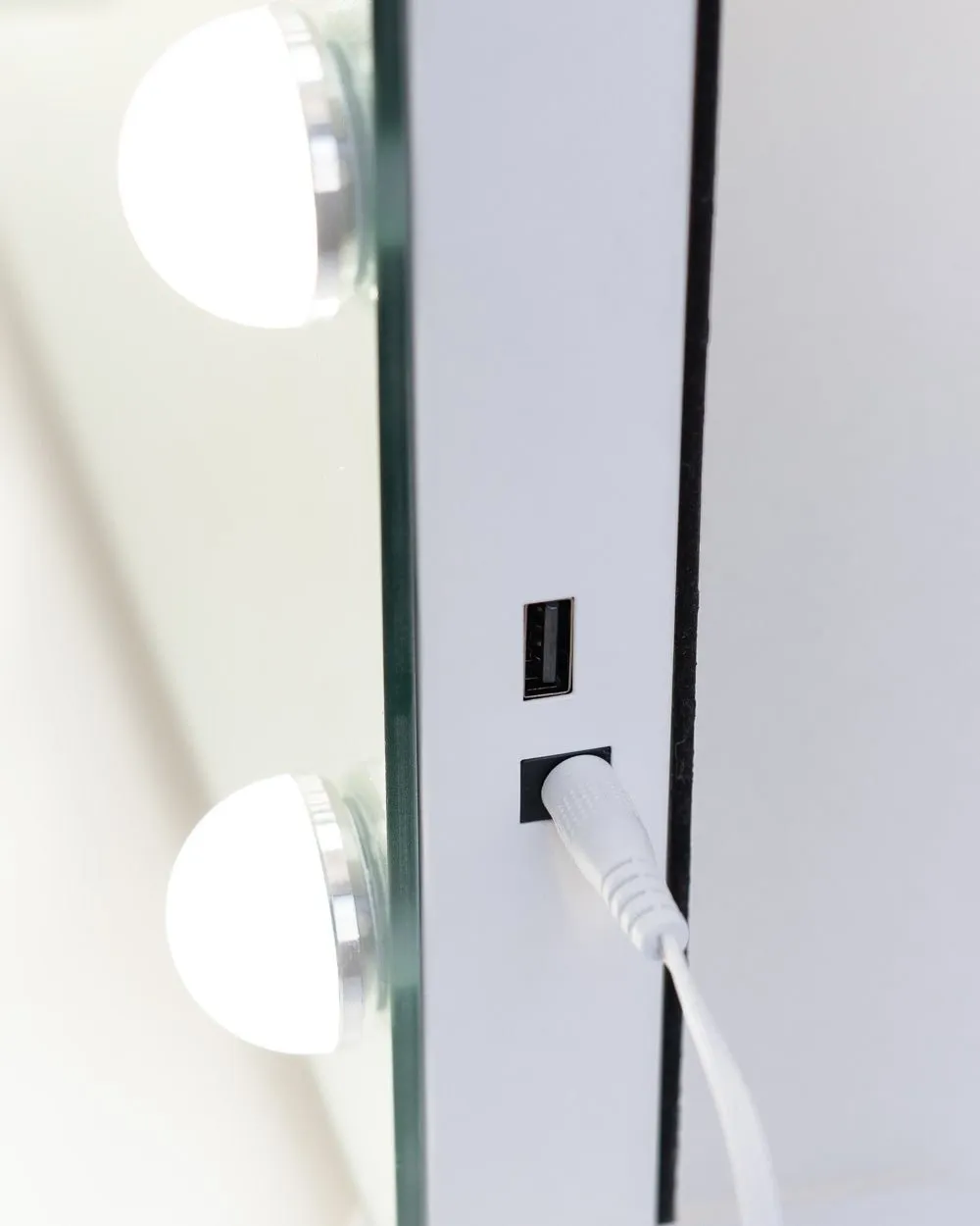 Espejo en color blanco con 15 bombillas LED y base ovalada perfecto para maquillarse y hacerse rutinas de belleza. Puedes ajustar el color y la intensidad de la luz con los botones táctiles. Incluye un espejo de aumento x5. ¡Dale un toque elegante a tu tocador!