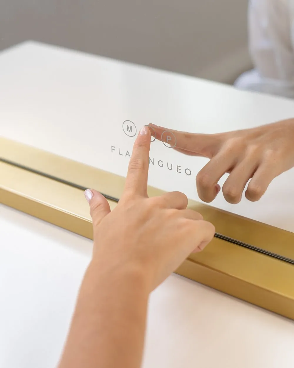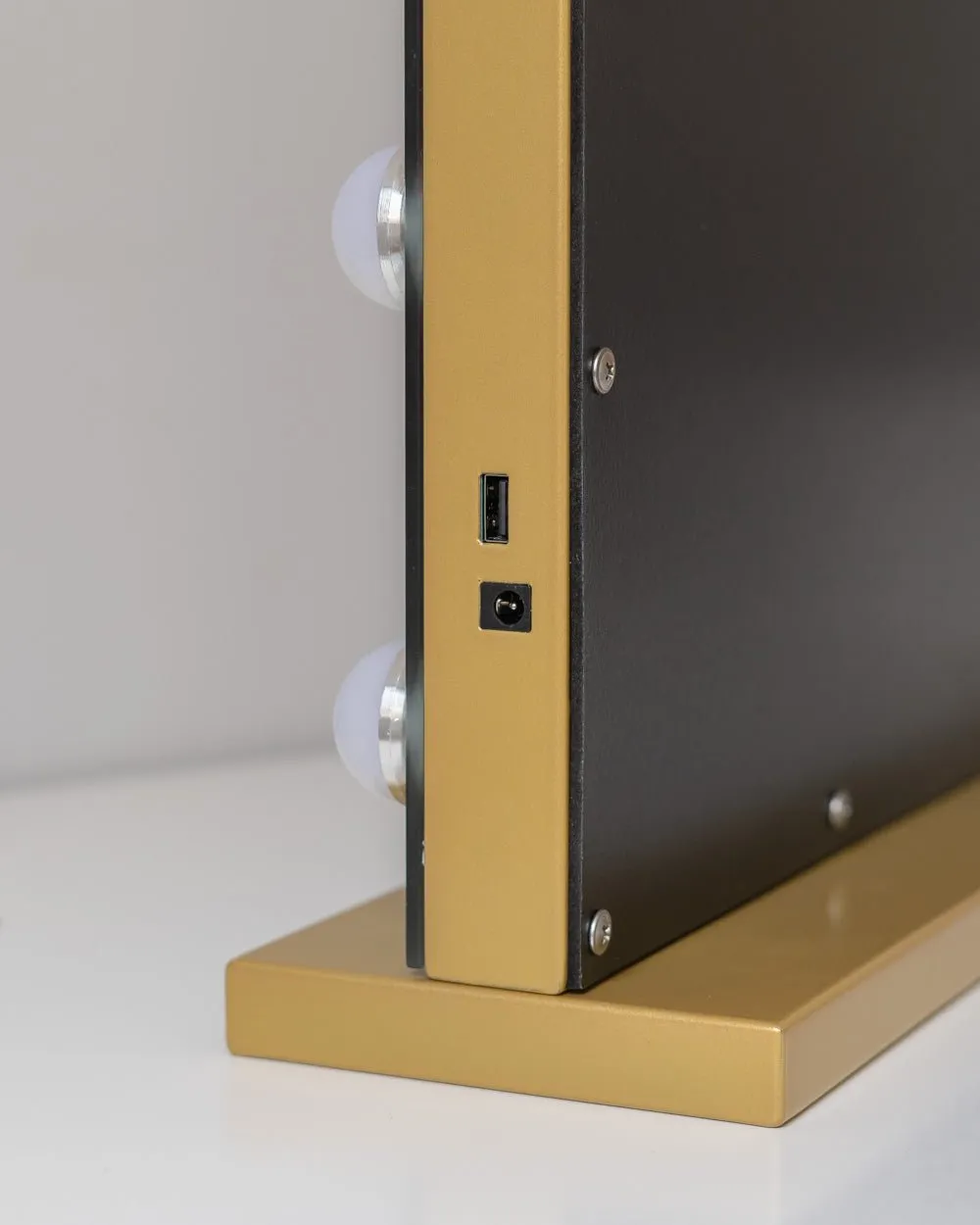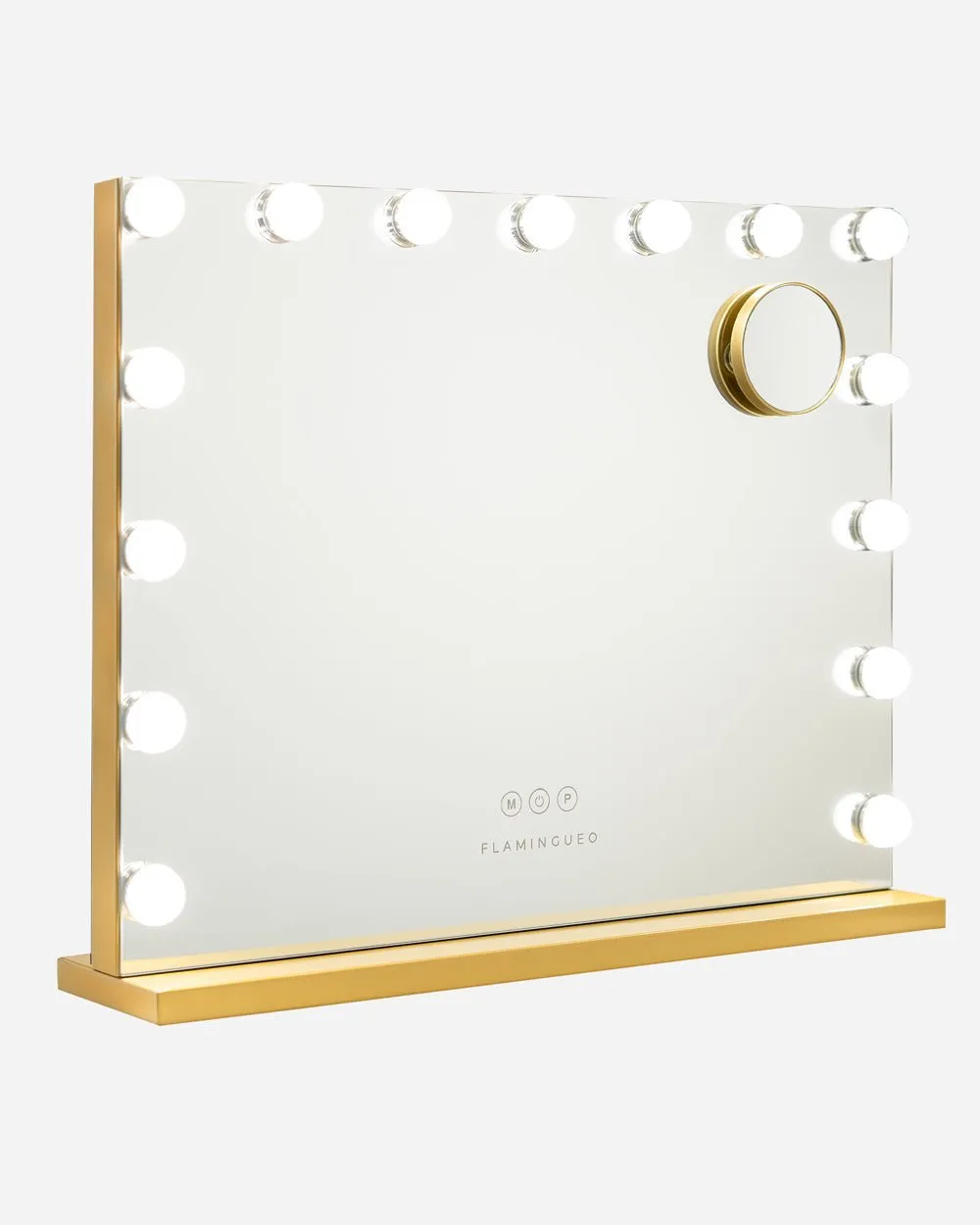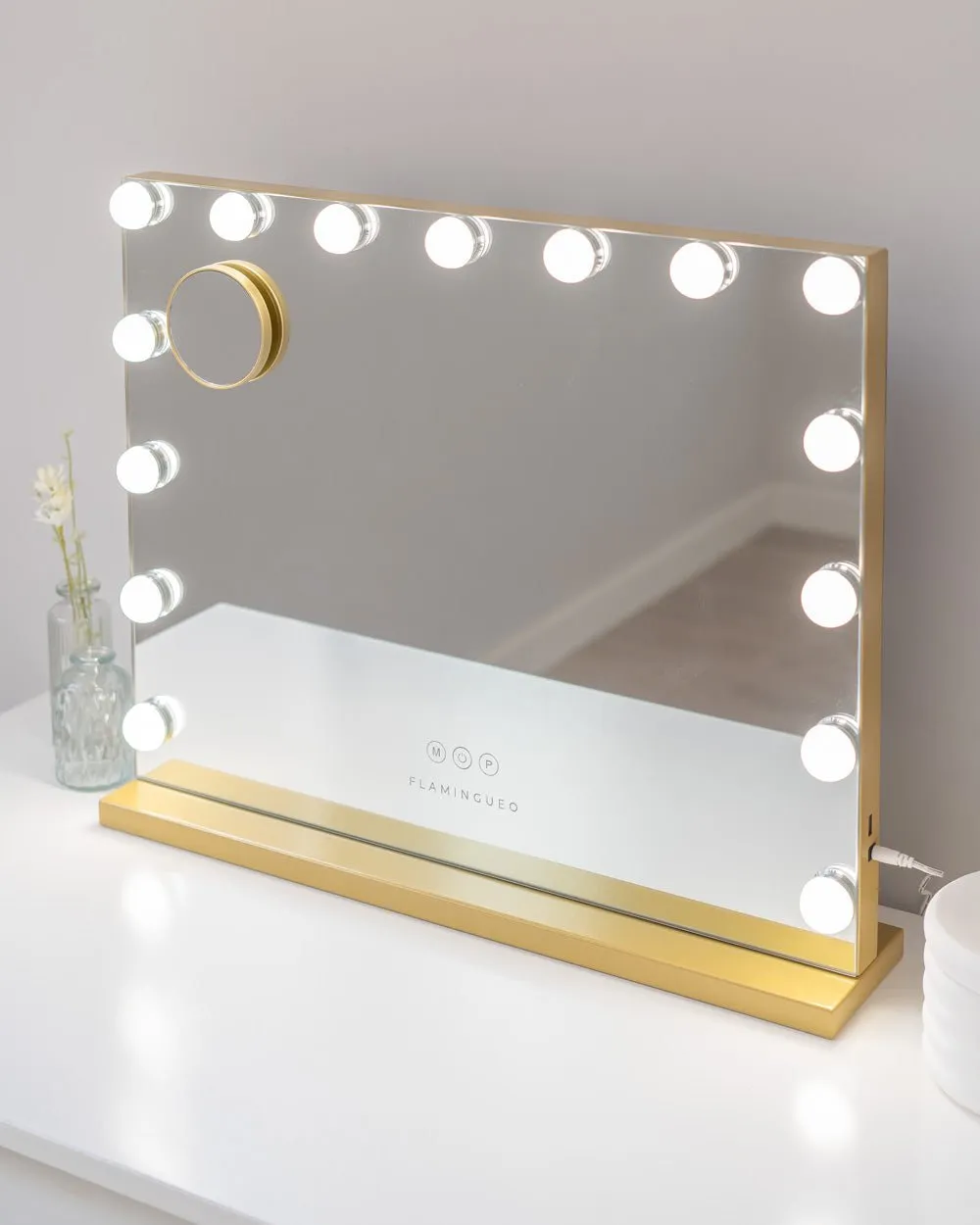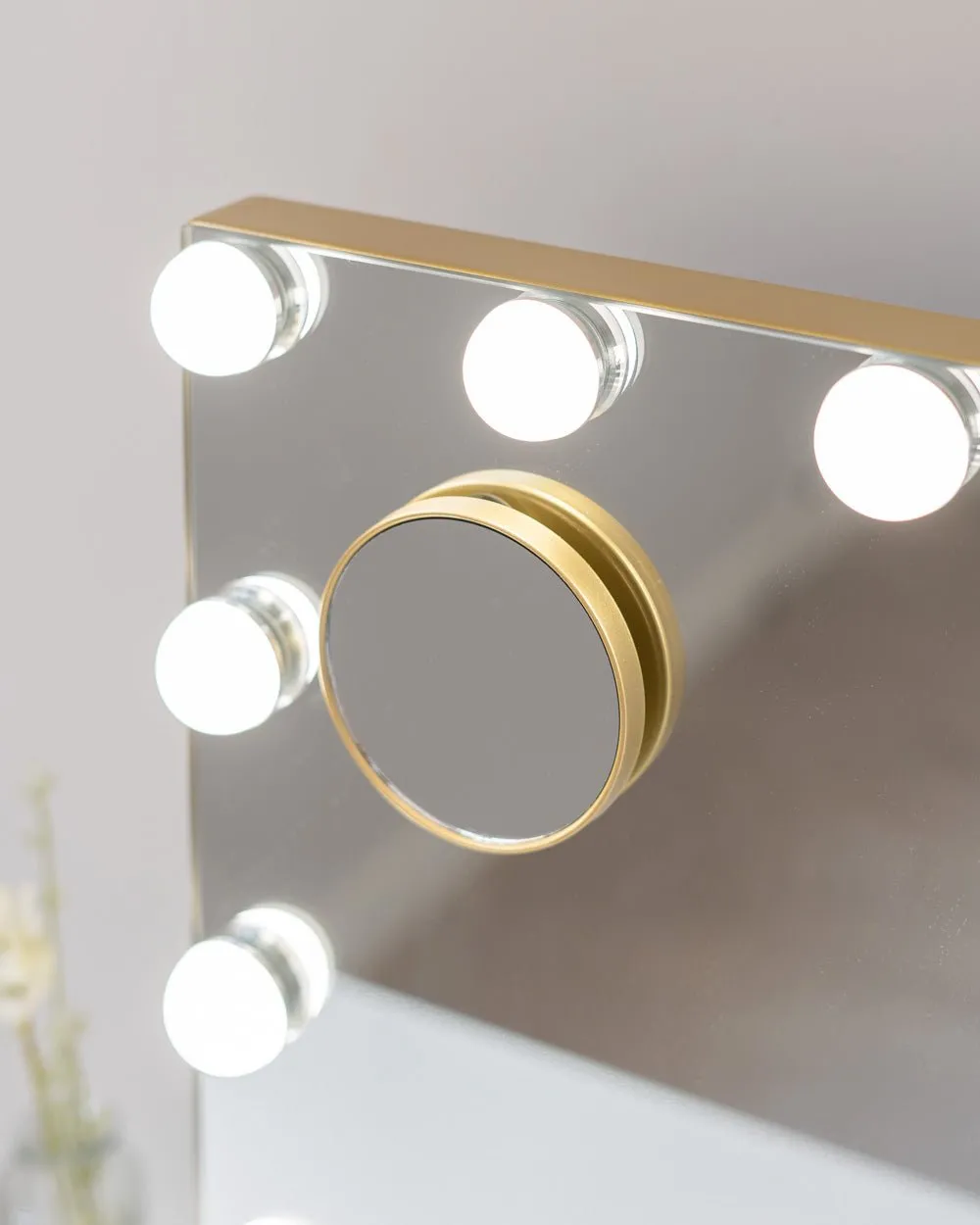 Espejo en color dorado con 15 bombillas LED perfecto para maquillarse y hacerse rutinas de belleza. Puedes ajustar el color y la intensidad de la luz con los botones táctiles. Incluye un espejo de aumento x5. ¡Dale un toque elegante a tu tocador!