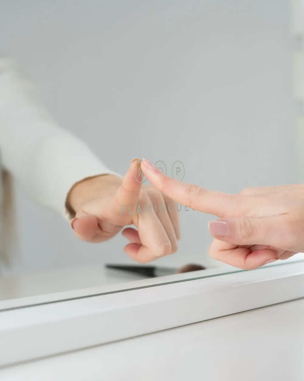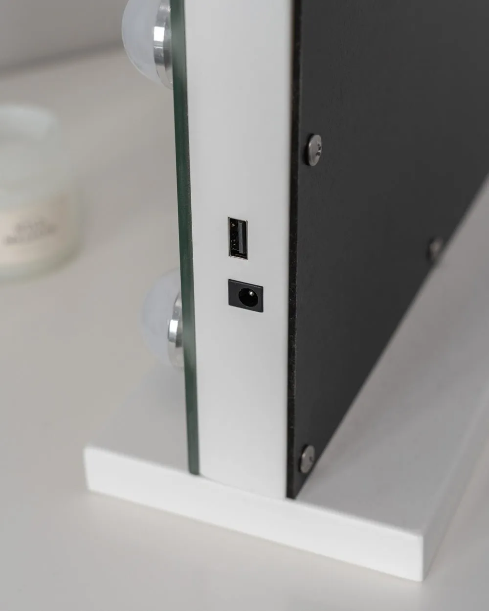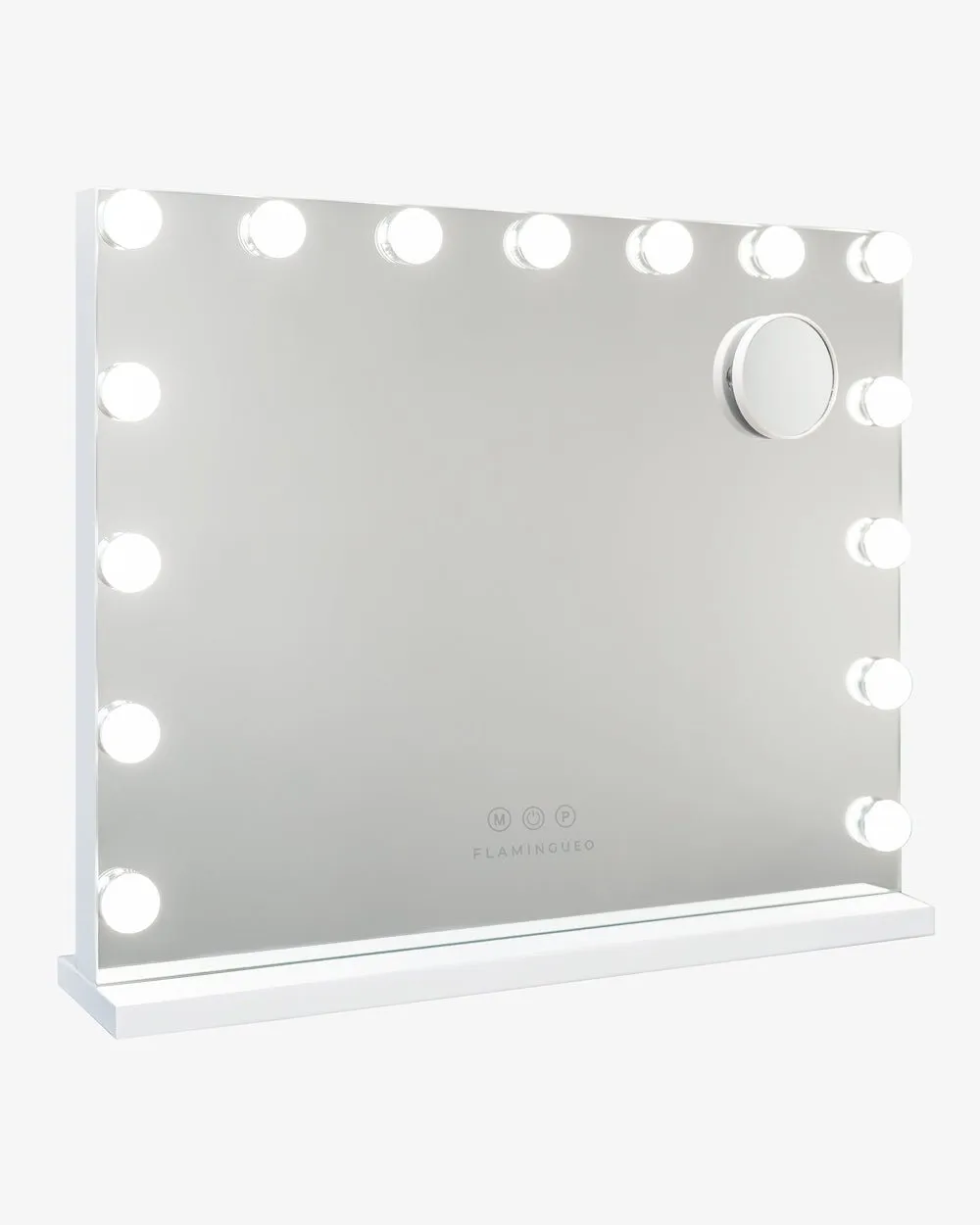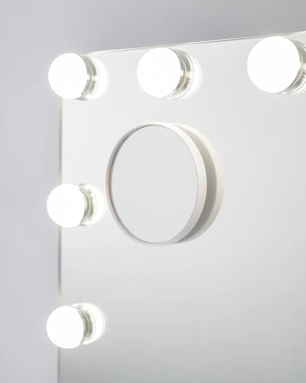 Espejo en color blanco con 15 bombillas LED perfecto para maquillarse y hacerse rutinas de belleza. Puedes ajustar el color y la intensidad de la luz con los botones táctiles. Incluye un espejo de aumento x5. ¡Dale un toque elegante a tu tocador!