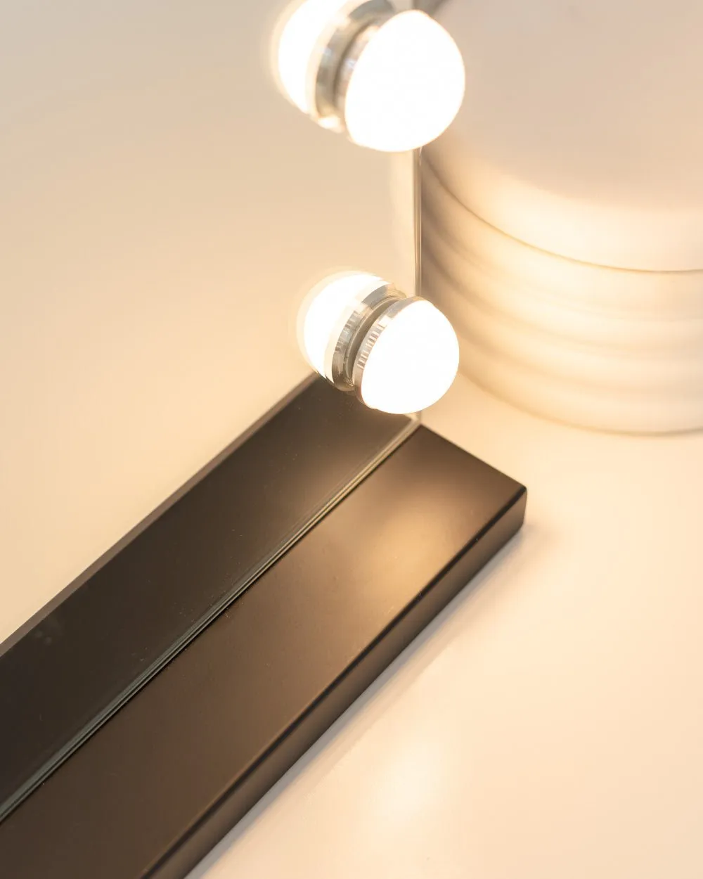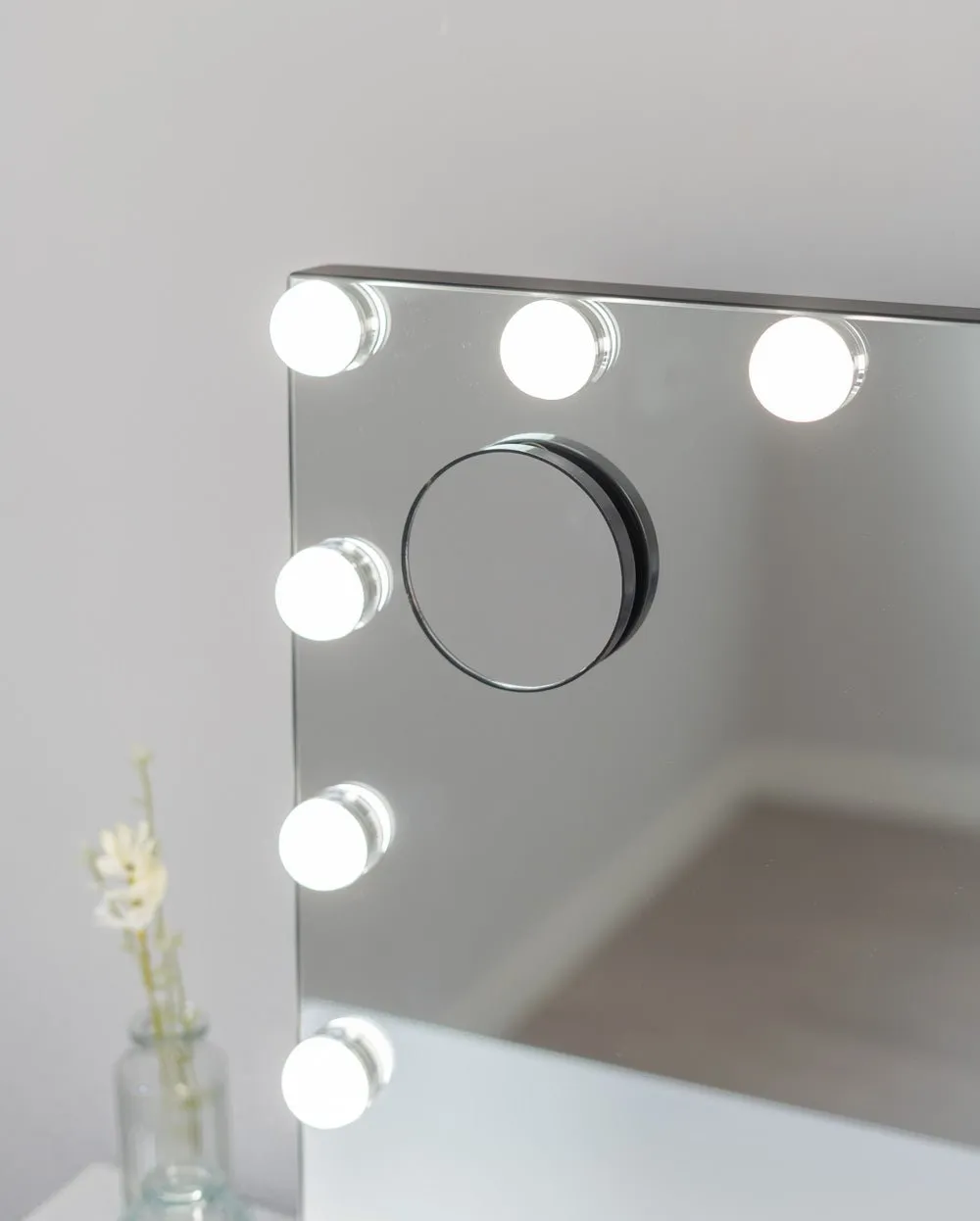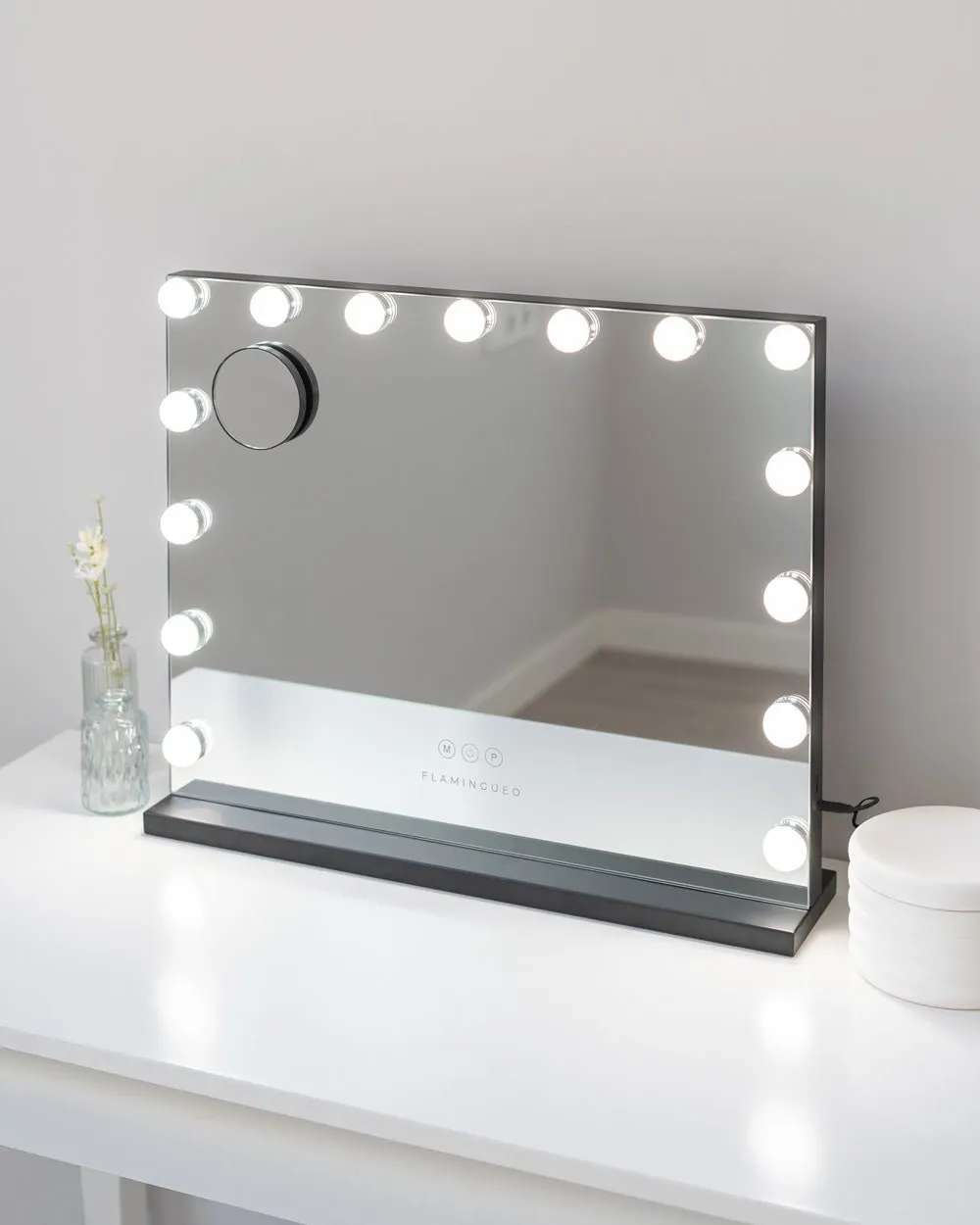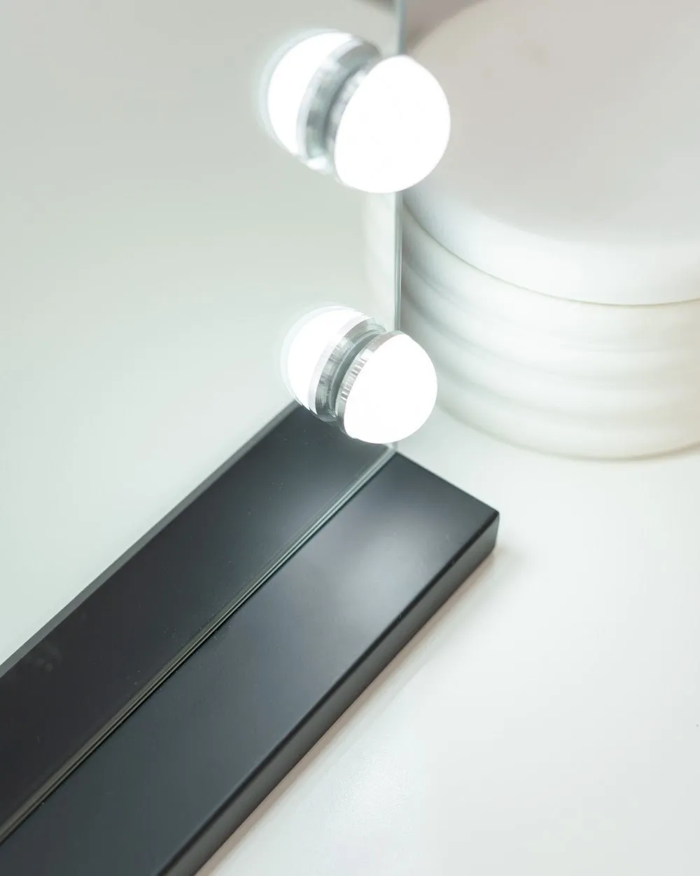 Espejo en color negro con 15 bombillas LED perfecto para maquillarse y hacerse rutinas de belleza. Puedes ajustar el color y la intensidad de la luz con los botones táctiles. Incluye un espejo de aumento x5. ¡Dale un toque elegante a tu tocador!