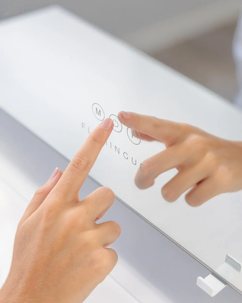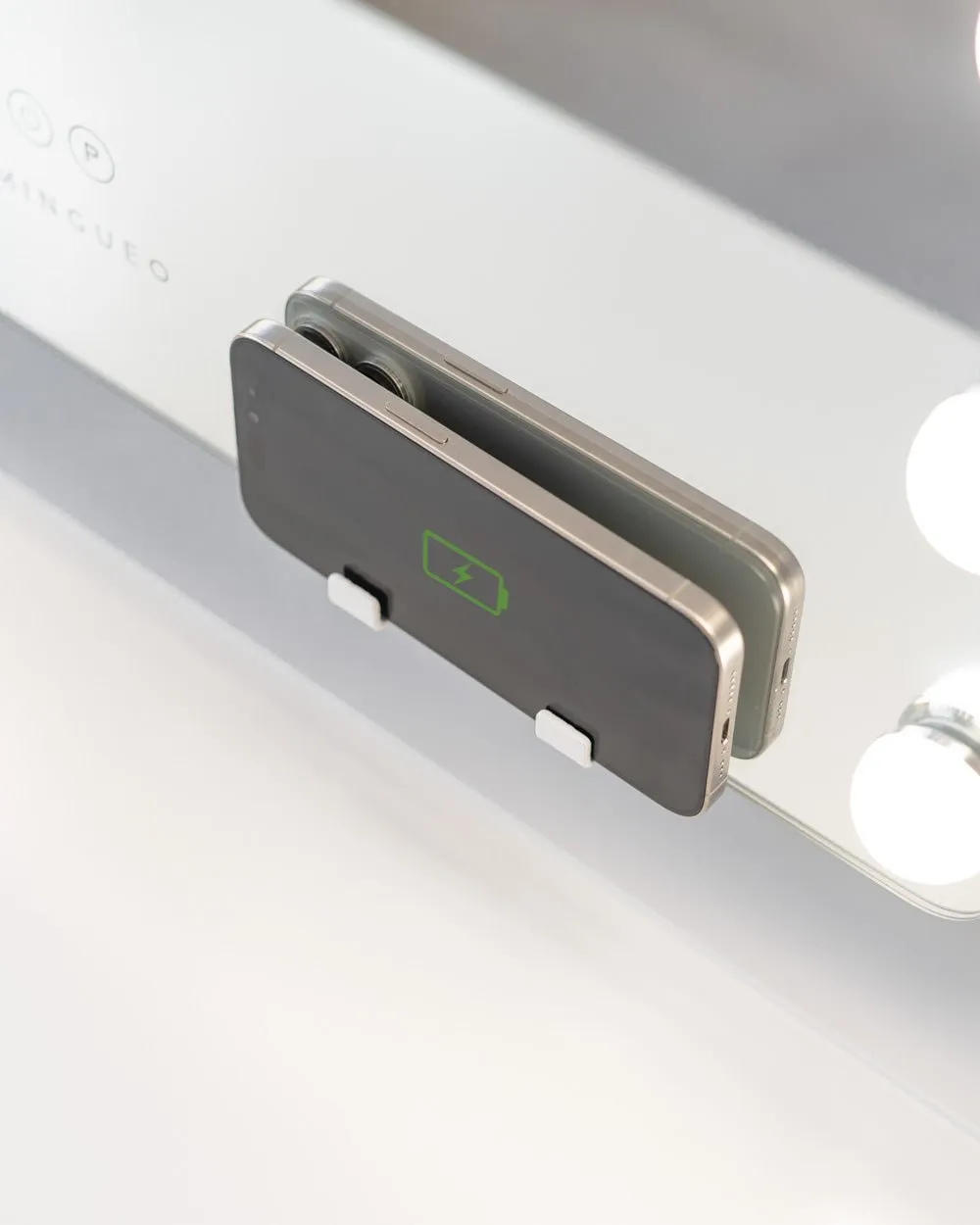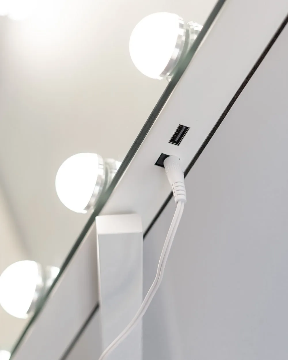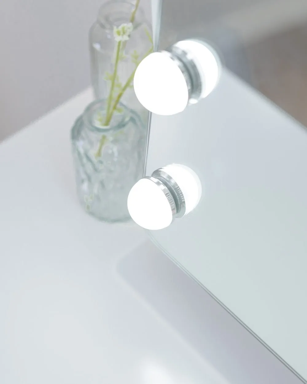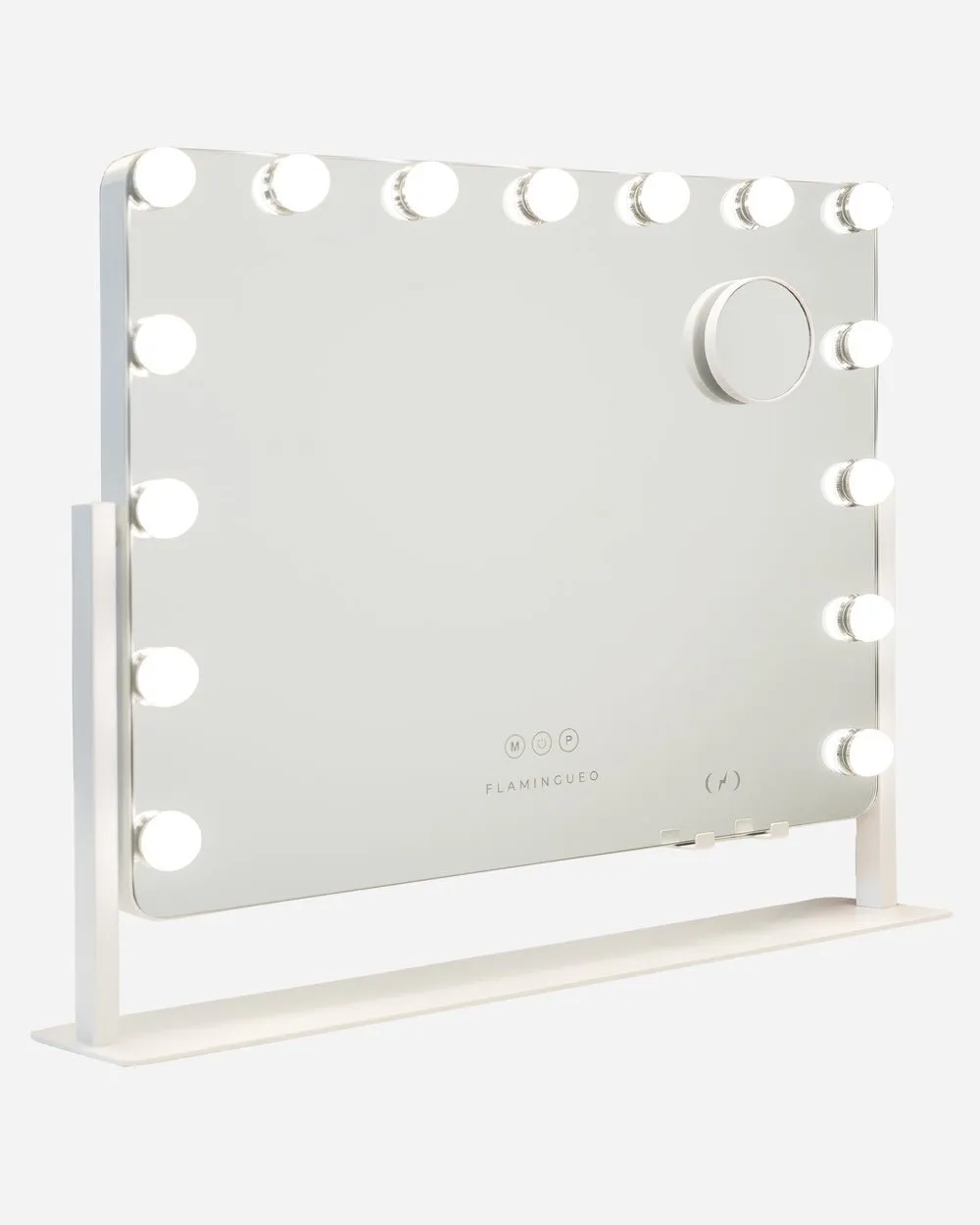 Espejo en color blanco inclinable y con esquinas redondas con 15 bombillas LED perfecto para maquillarse y hacerse rutinas de belleza. Puedes ajustar el color y la intensidad de la luz con los botones táctiles. Incluye un espejo de aumento x5. ¡Dale un toque elegante a tu tocador!