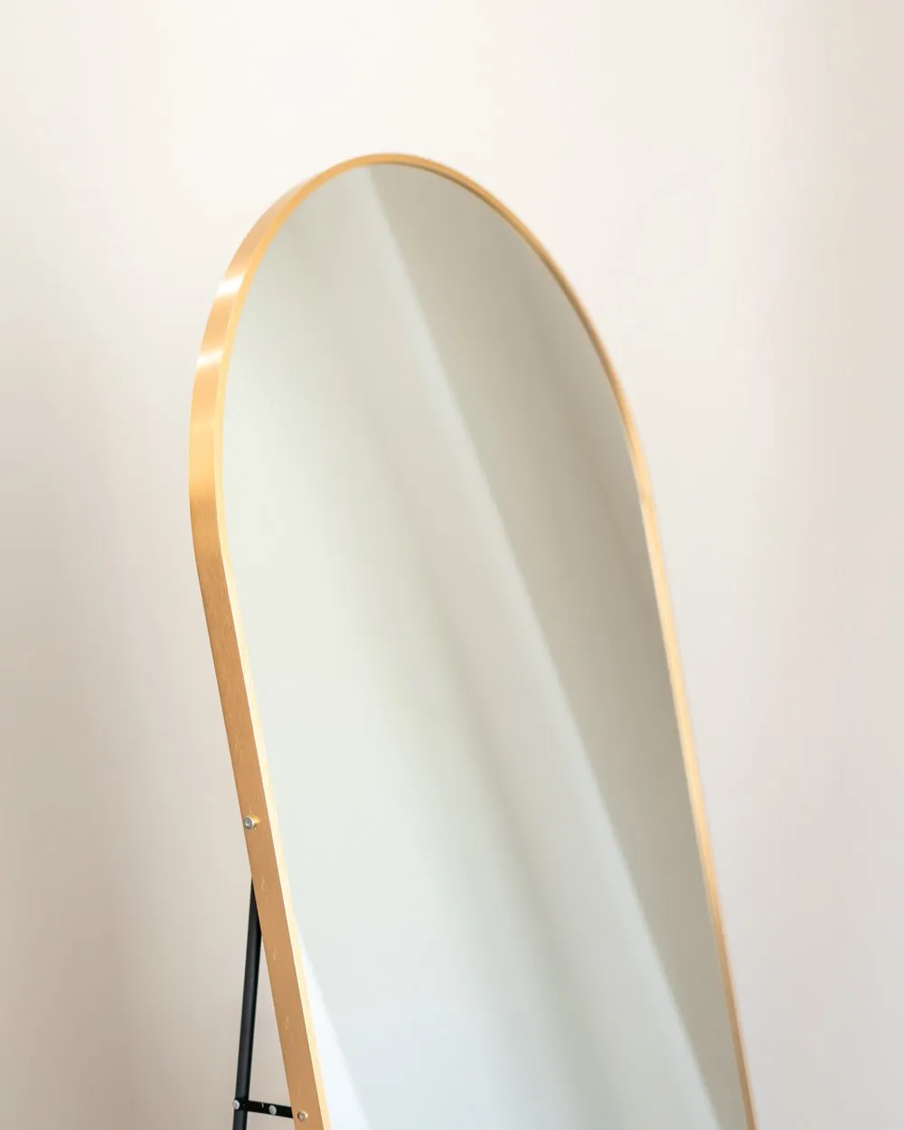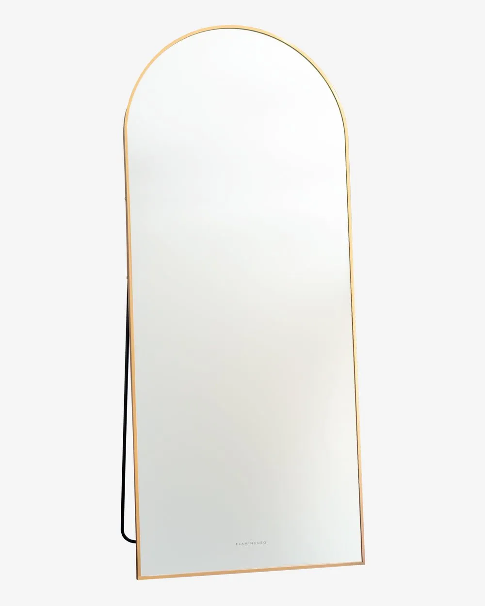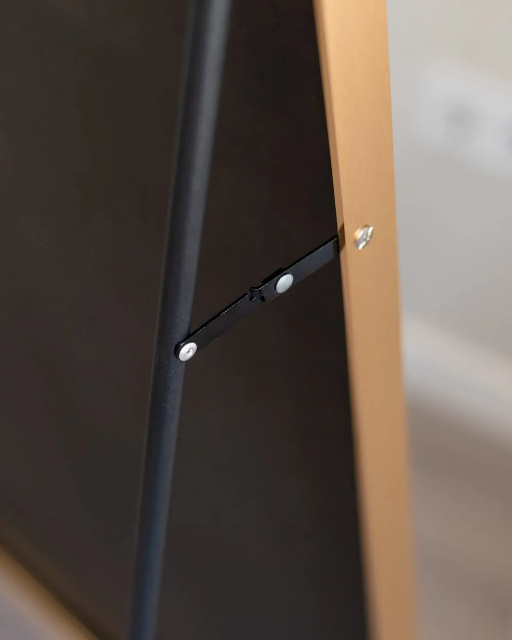 Espejo multi posición con marco de aluminio dorado. Su diseño simple y moderno permite poder combinarlo con cualquier estilo de decoración. Dispone de un gancho trasero para poder colgarlo en la pared, o si lo prefieres puedes apoyarlo en el suelo sobre su propia pata retráctil.