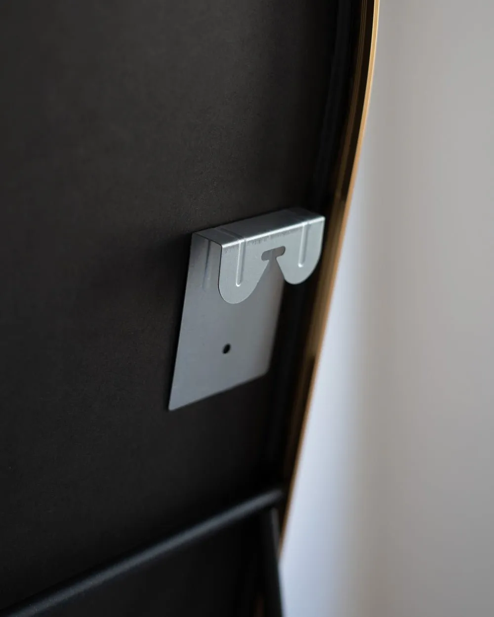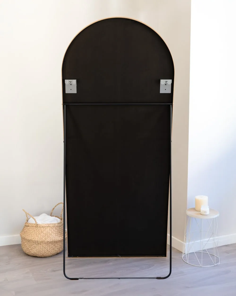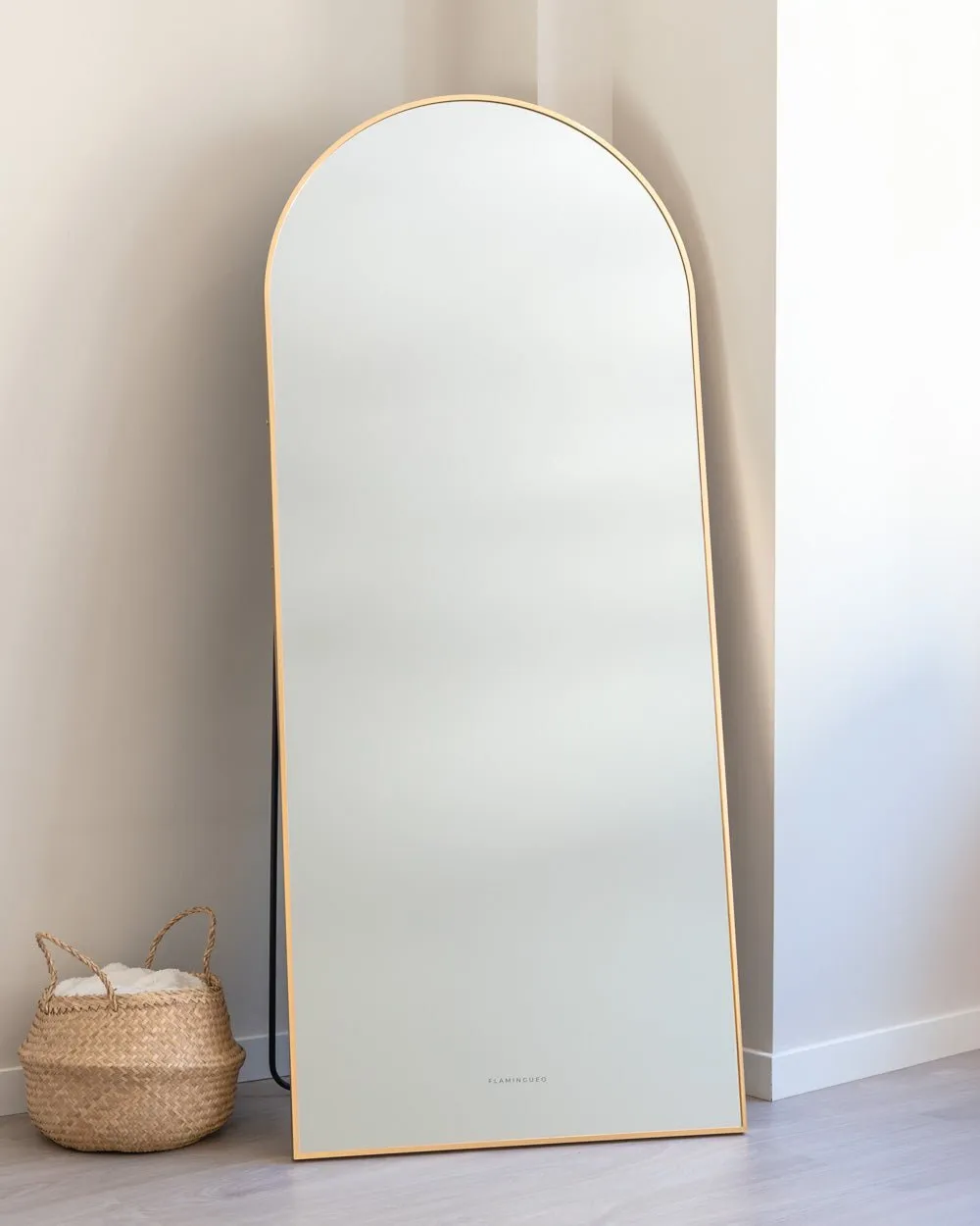 Espejo multi posición con marco de aluminio dorado. Su diseño simple y moderno permite poder combinarlo con cualquier estilo de decoración. Dispone de un gancho trasero para poder colgarlo en la pared, o si lo prefieres puedes apoyarlo en el suelo sobre su propia pata retráctil.