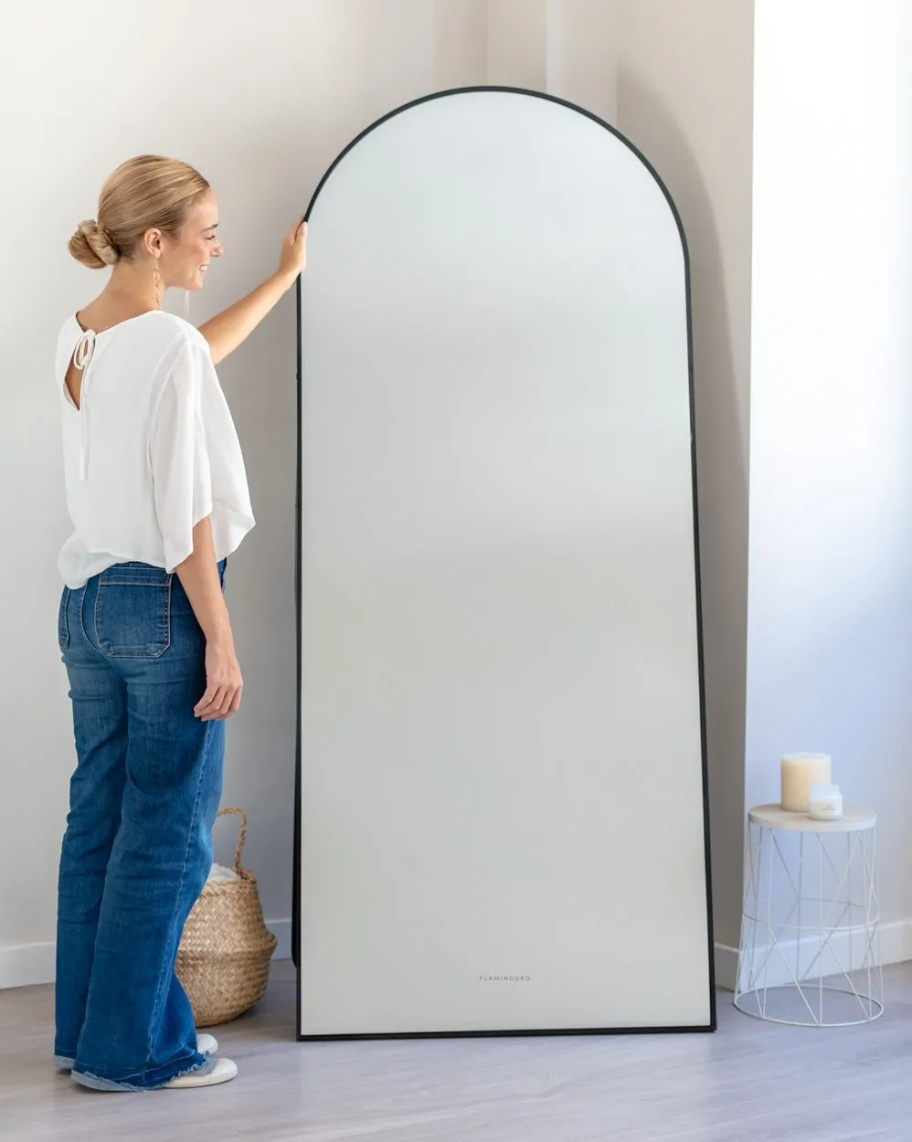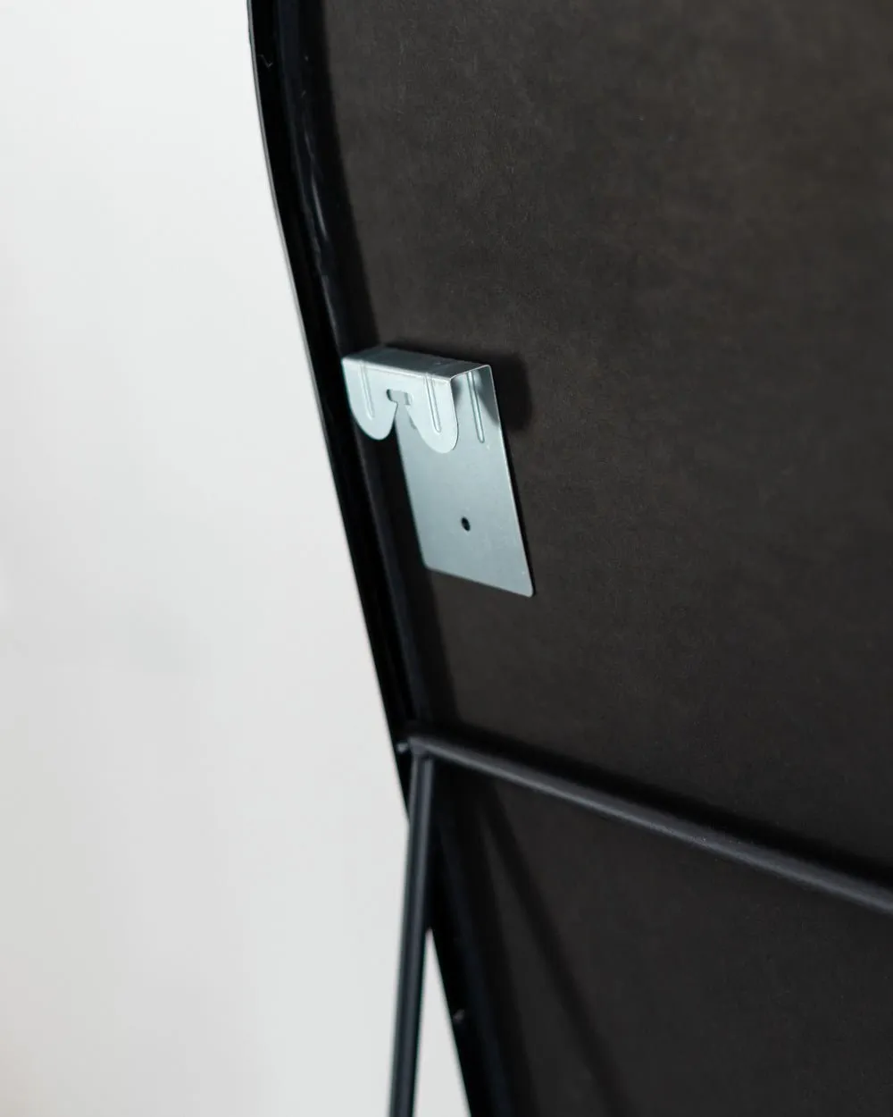 Espejo multi posición con marco de aluminio negro. Su diseño simple y moderno permite poder combinarlo con cualquier estilo de decoración. Dispone de un gancho trasero para poder colgarlo en la pared, o si lo prefieres puedes apoyarlo en el suelo sobre su propia pata retráctil.