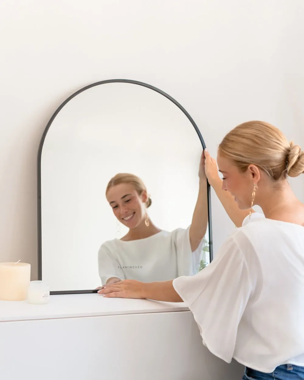 Espejo multi posición con marco de aluminio negro. Su diseño simple y moderno permite poder combinarlo con cualquier estilo de decoración. Dispone de un gancho trasero para poder colgarlo en la pared, o si lo prefieres puedes dejarlo apoyado en tu tocador