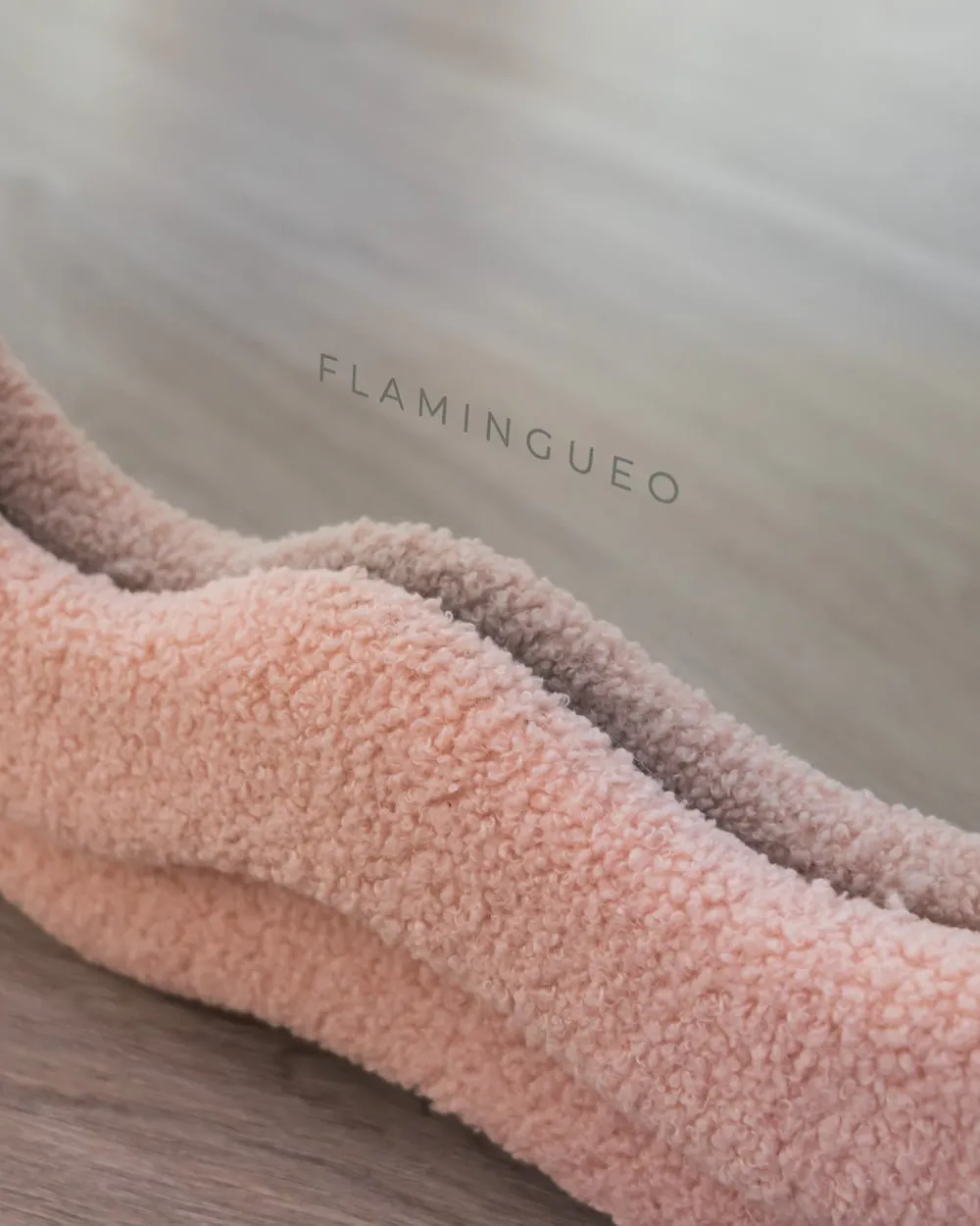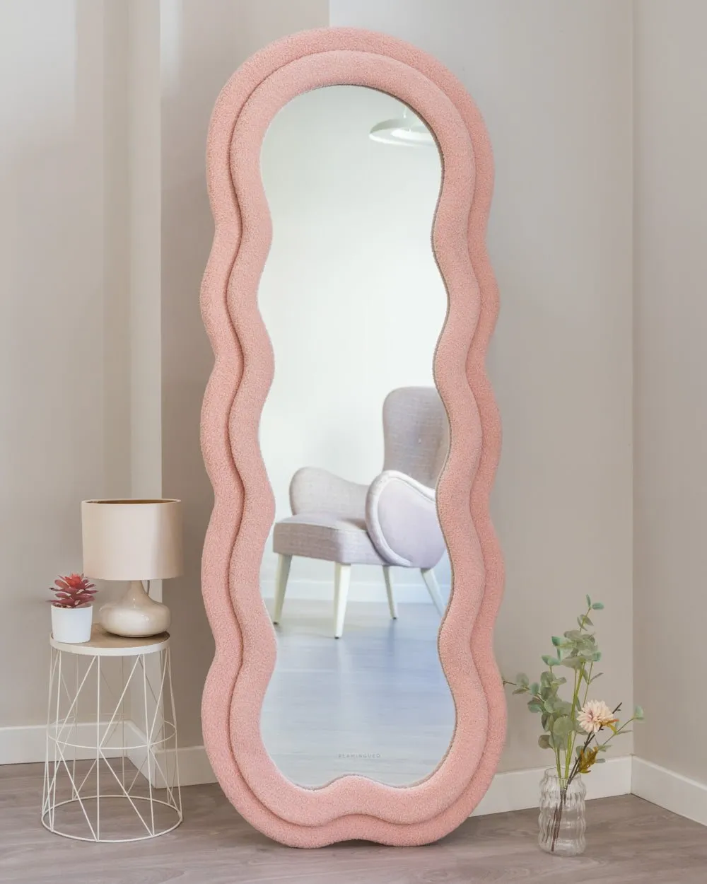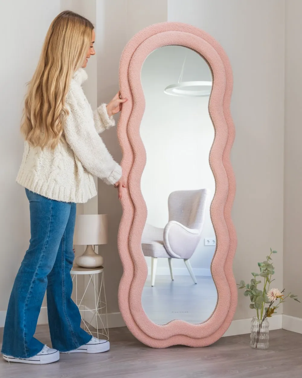 Espejo asimétrico en tejido teddy rosa pastel con diseño único y en tendencia que le dará el toque más especial a cualquier habitación de tu hogar. Puedes apoyarlo en el suelo o colgarlo en la pared gracias a los dos ganchos traseros.