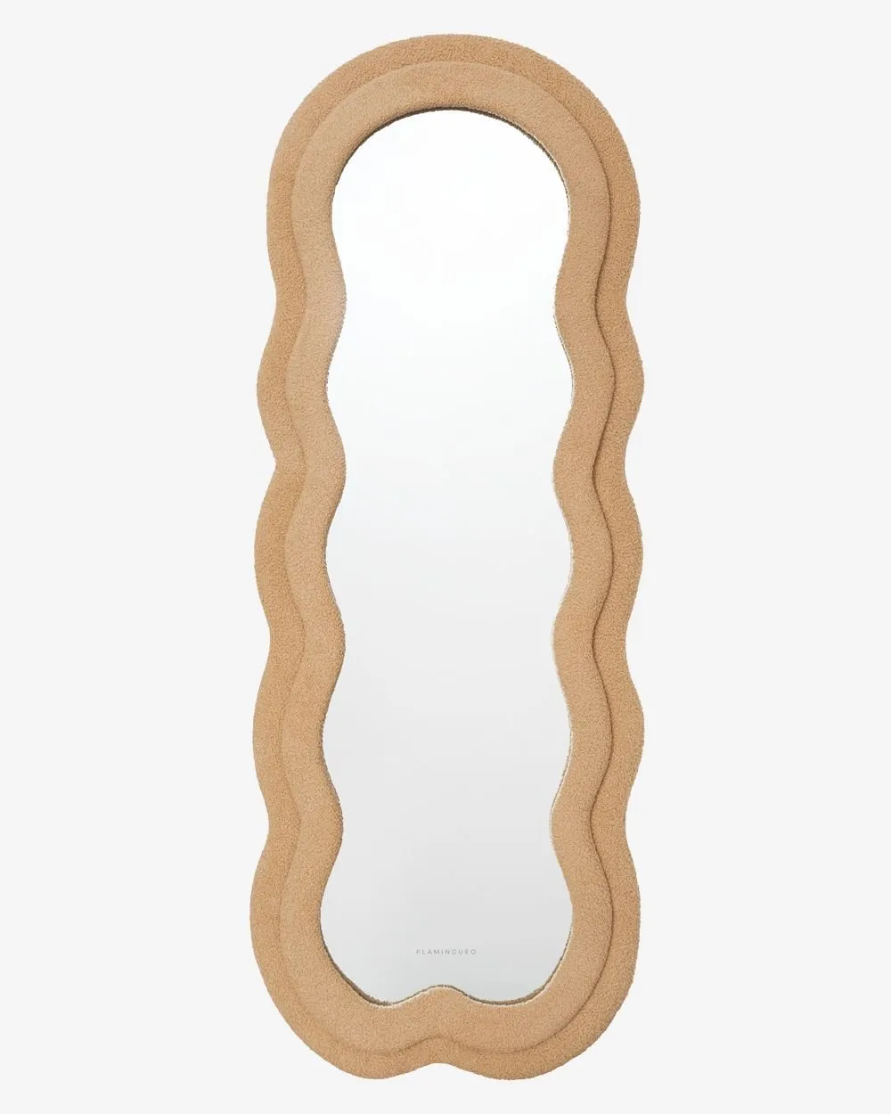 Espejo asimétrico en tejido teddy marrón con diseño único y en tendencia que le dará el toque más especial a cualquier habitación de tu hogar. Puedes apoyarlo en el suelo o colgarlo en la pared gracias a los dos ganchos traseros.