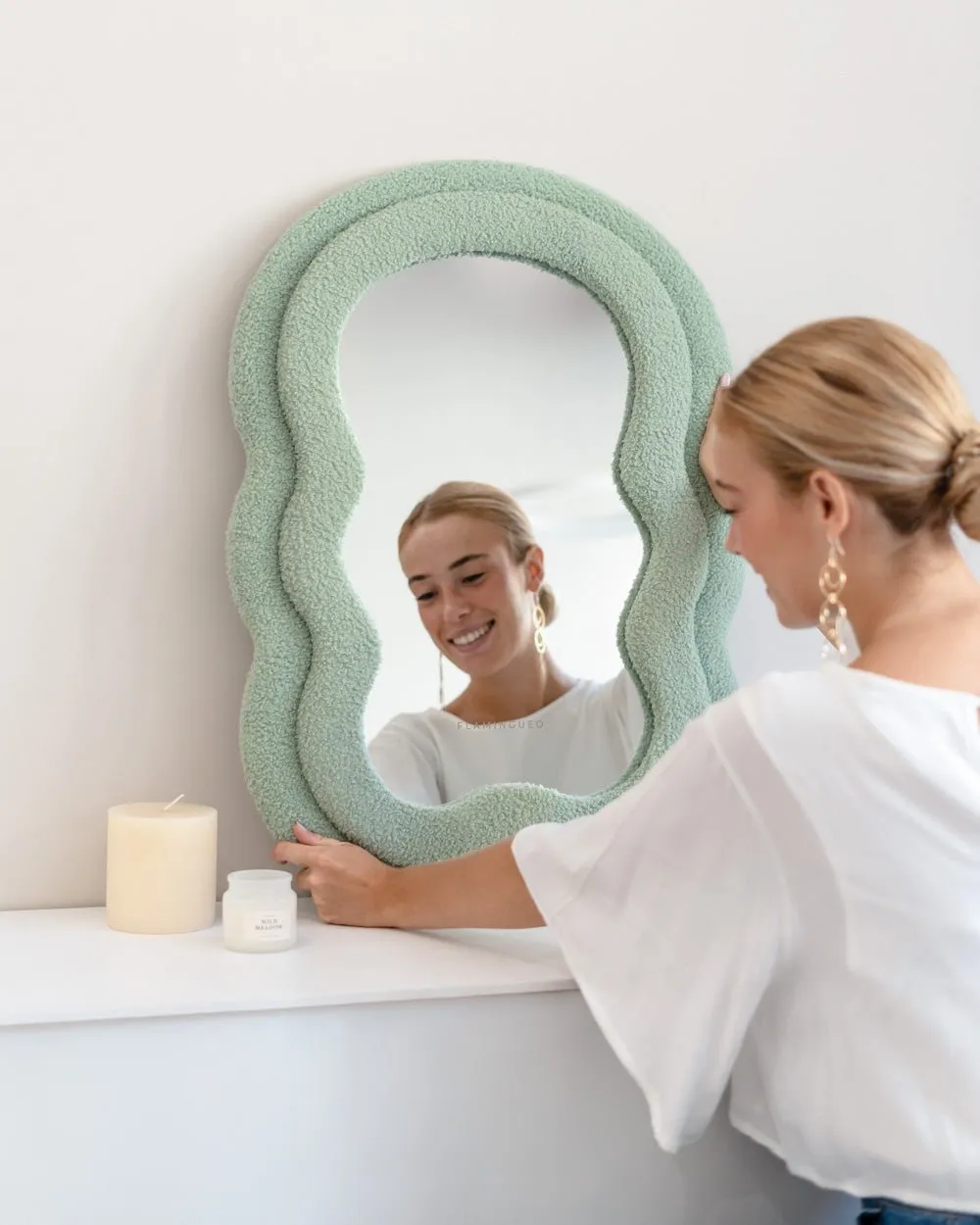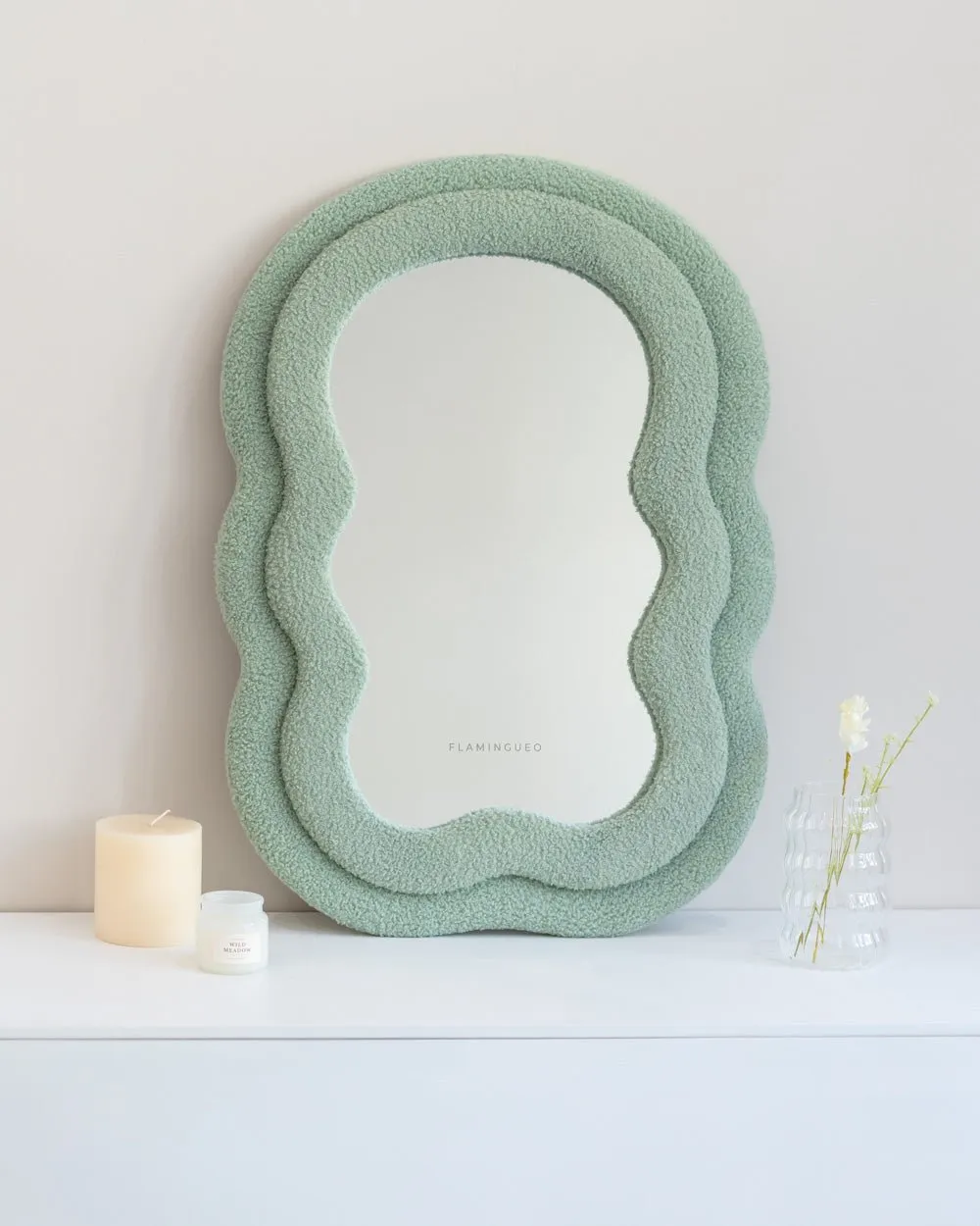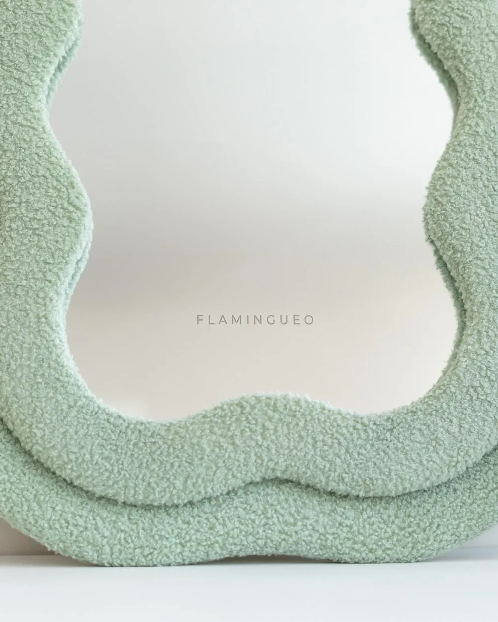 Espejo asimétrico color verde pastel en tejido teddy con diseño único y en tendencia que le dará el toque más especial a cualquier tocador de tu hogar. Puedes apoyarlo en el suelo o colgarlo en la pared gracias a los dos ganchos traseros.