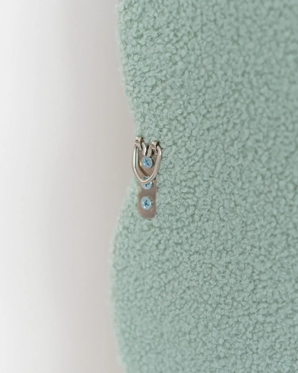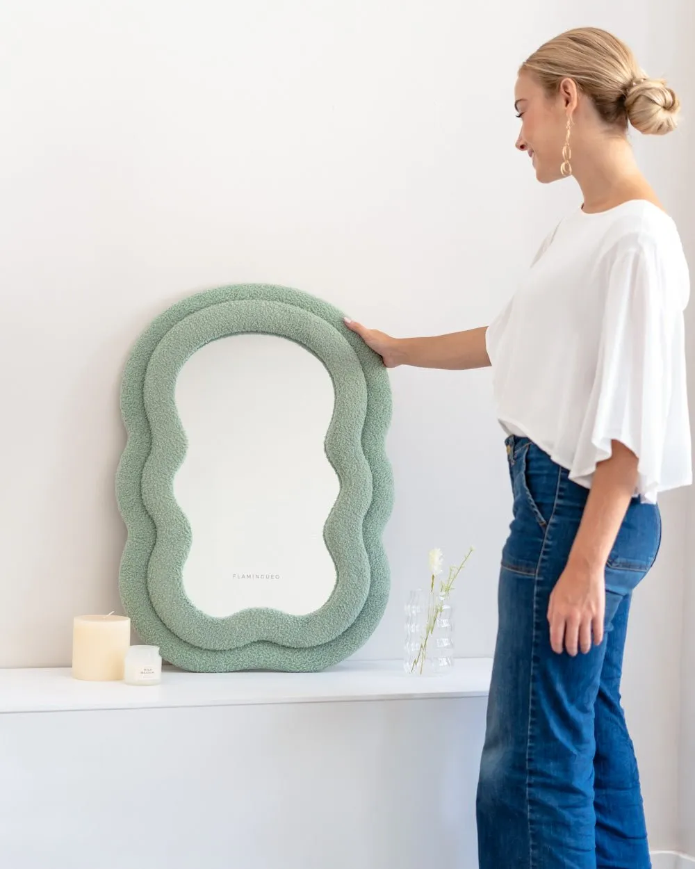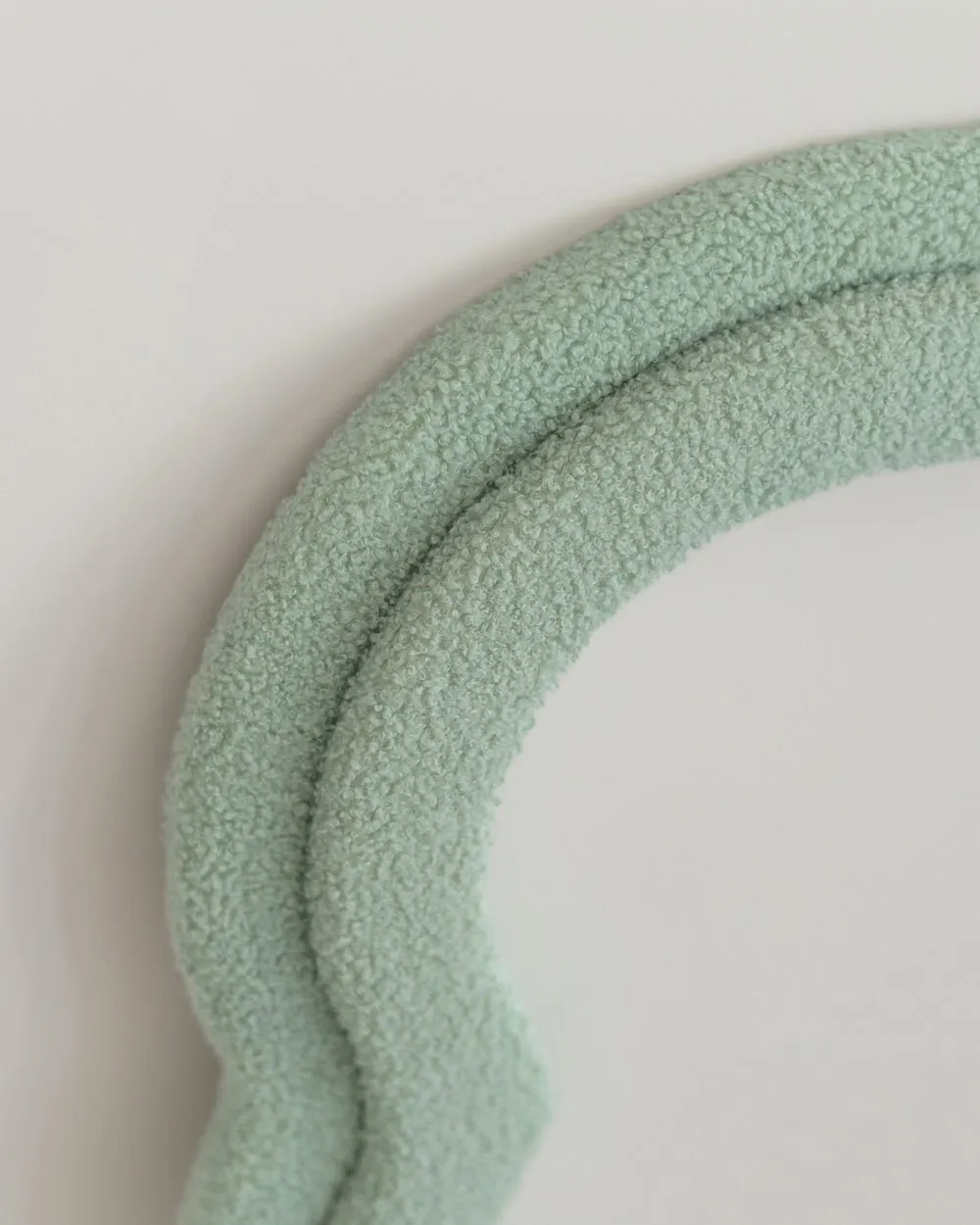 Espejo asimétrico color verde pastel en tejido teddy con diseño único y en tendencia que le dará el toque más especial a cualquier tocador de tu hogar. Puedes apoyarlo en el suelo o colgarlo en la pared gracias a los dos ganchos traseros.
