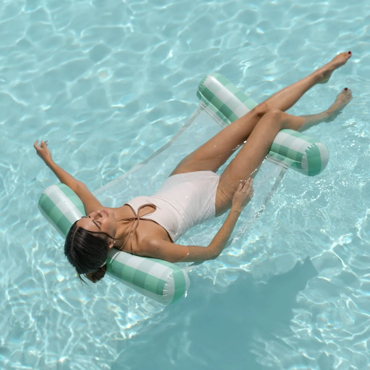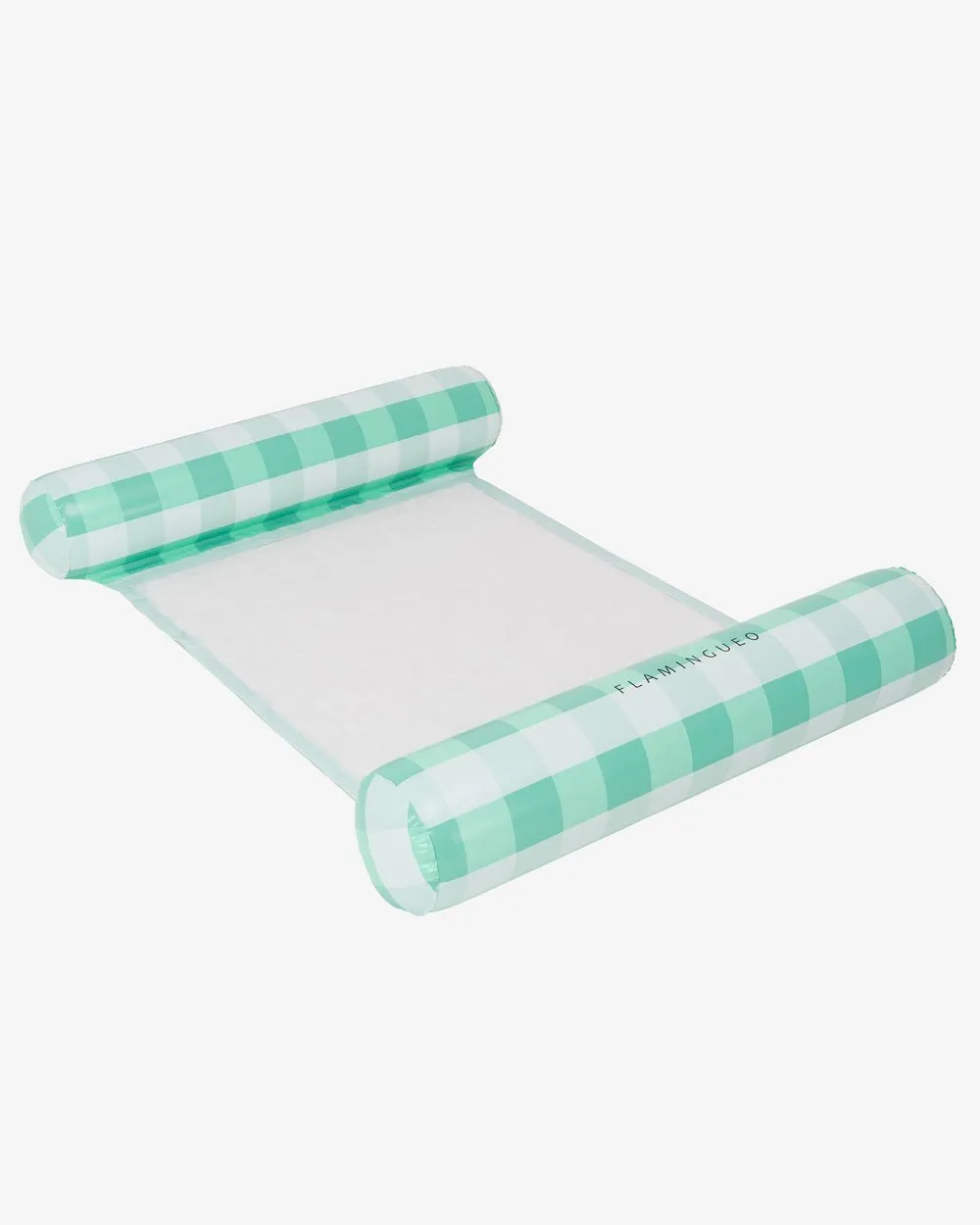 Nuestro nuevo flotador hamaca con diseño a cuadros vichy verde es ideal para recostarse y disfrutar de la piscina o de la playa. Tiene dos almohadillas a cada extremo y malla en el centro para poder utilizarse como asiento o tumbona.