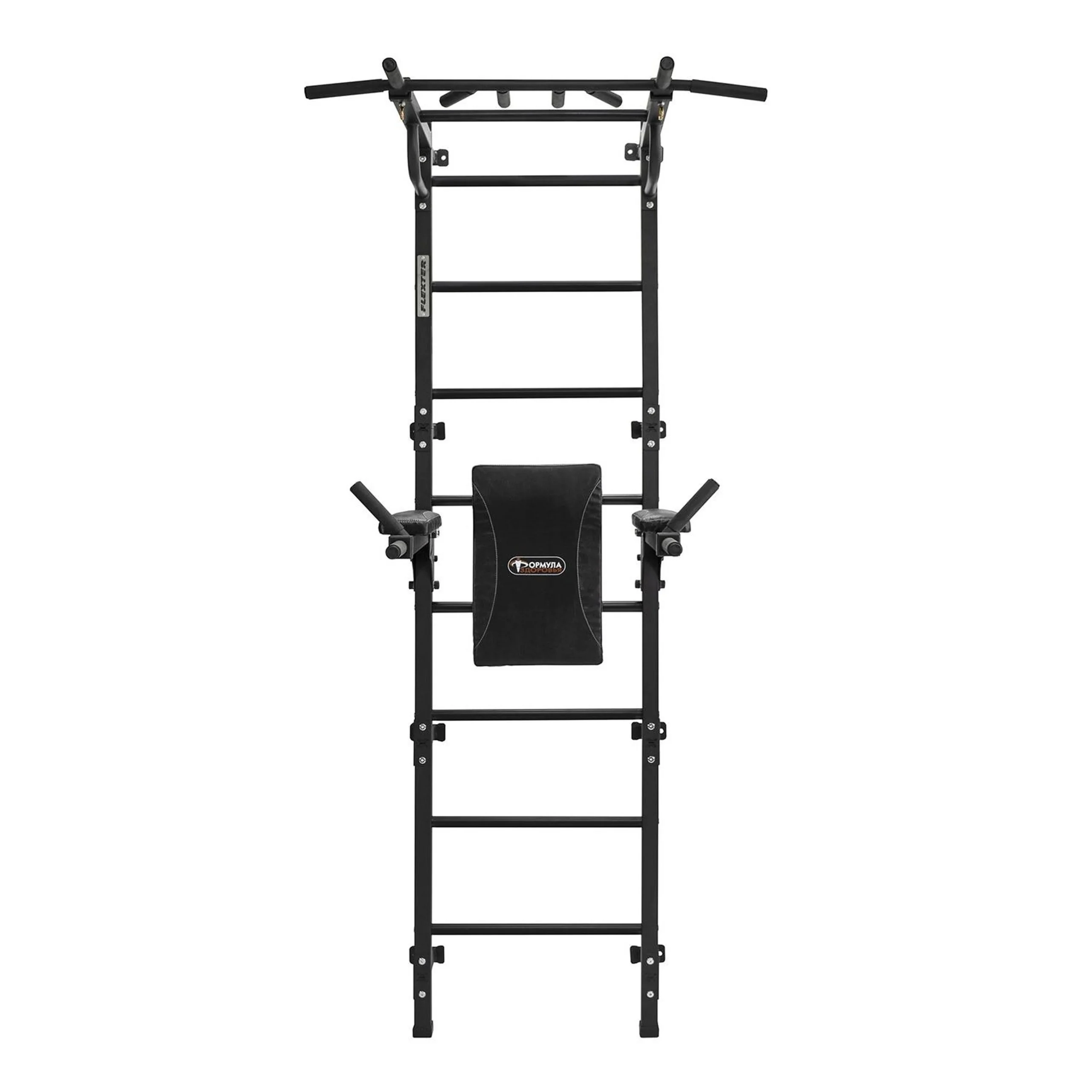 La barra horizontal tiene anillos especiales para colgar equipos: un saco de boxeo, bucles TRX y un columpio para niños. Las barras plegables son un equipo para hacer flexiones de mayor dificultad: son brazos fuertes y hombros fuertes. Equipado con asas adicionales para trabajar los músculos abdominales. Las vigas se fijan al marco con soportes plegables: si es necesario, se pliegan y se fijan al marco para ahorrar espacio. Plegados son compactos, la distancia a la pared es de 25 cm.