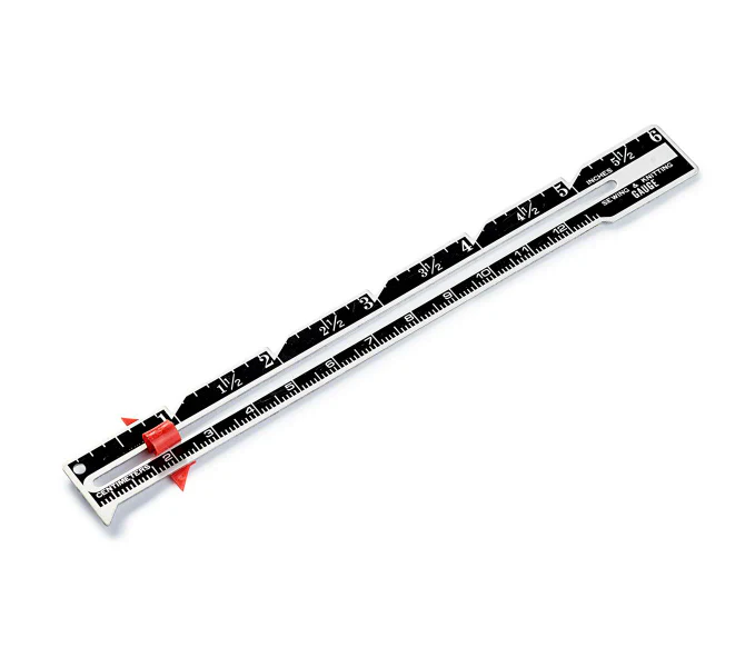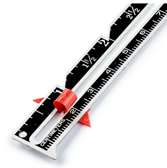 El agujero superior permite fijar la regla para usarla como compás para determinar curvas y círculos. Muestra escala de medidas en centímetro y pulgadas.