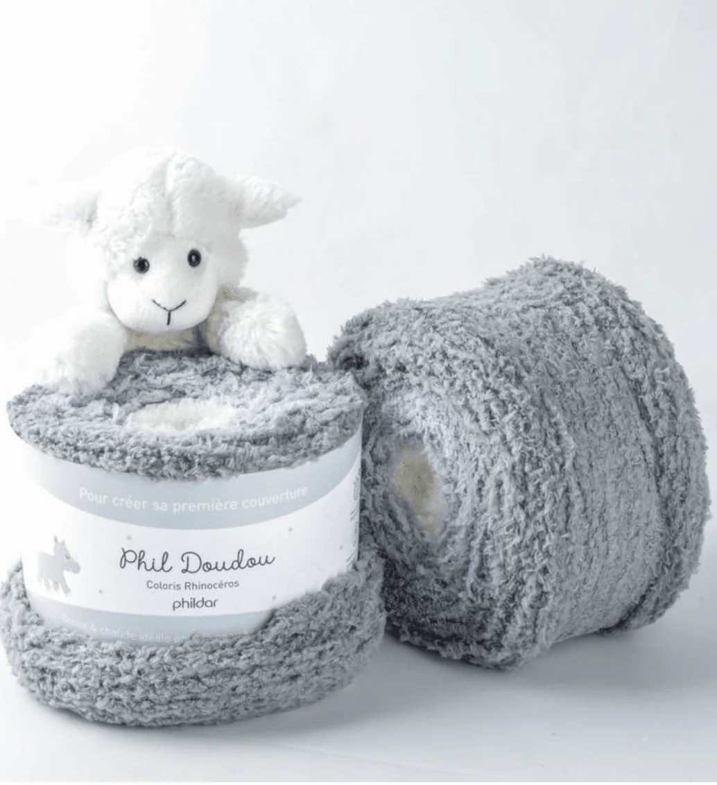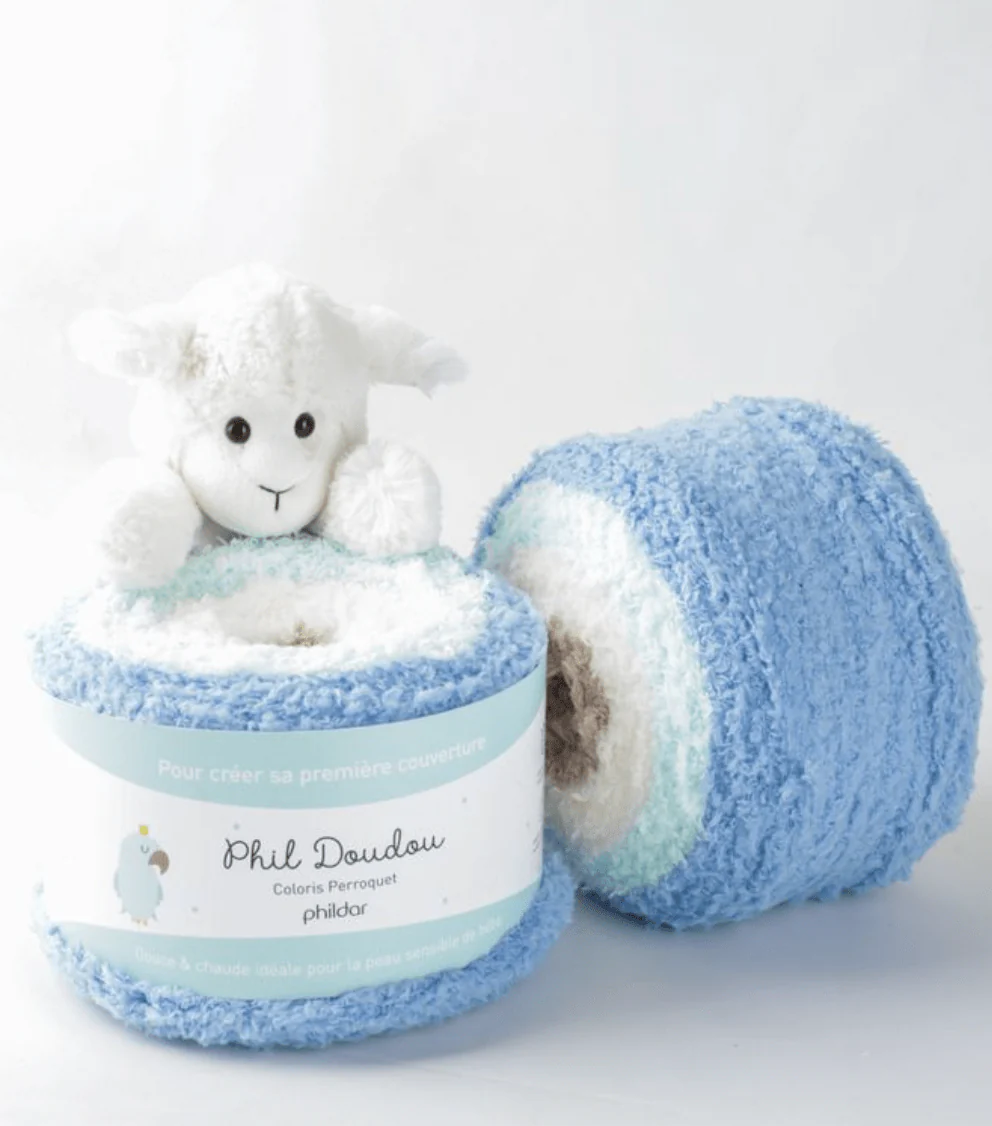 Phil Doudou, especial para bebe. Poliéster 100% con una terminación suave y frisada, adaptada a la piel sensible del recién nacido. Esta fibra es aislante, seca rápido y tiene la mejor resistencia al calor. El ovillo de 200grs es para un chal de 100 x 90 cm. Incluye Corderito extra suave (tuto o doudou). Regalo perfecto para un recién nacido.
