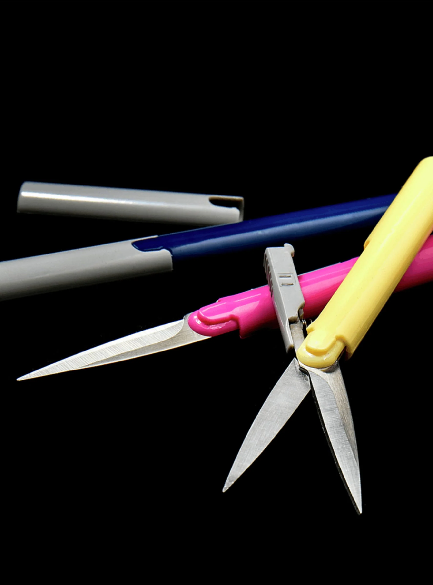 Lápiz/ tijera. Ideal para costura, bordado, quilt y uso general. Perfecto para recortes y reparaciones rápidas. Con tapa de seguridad con cierre. Para llevar en la cartera o bolso de manualidades.