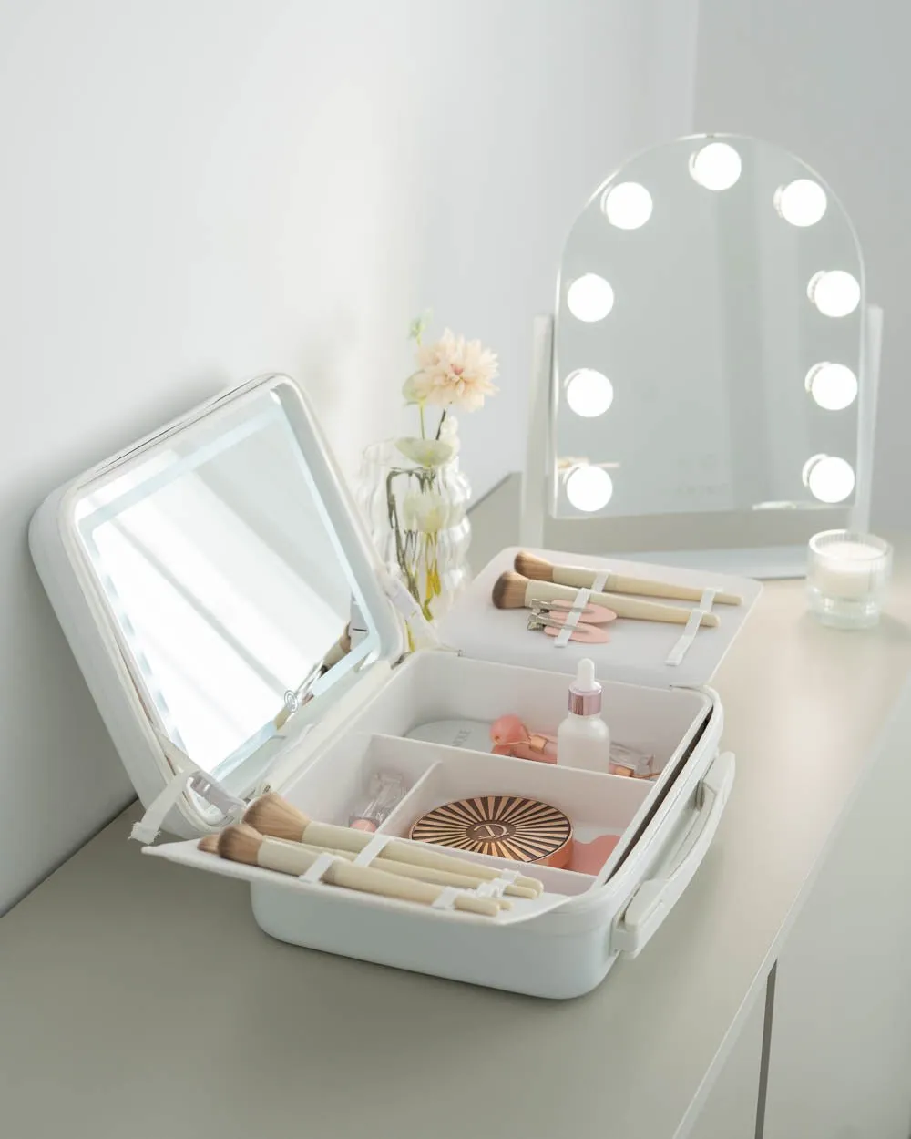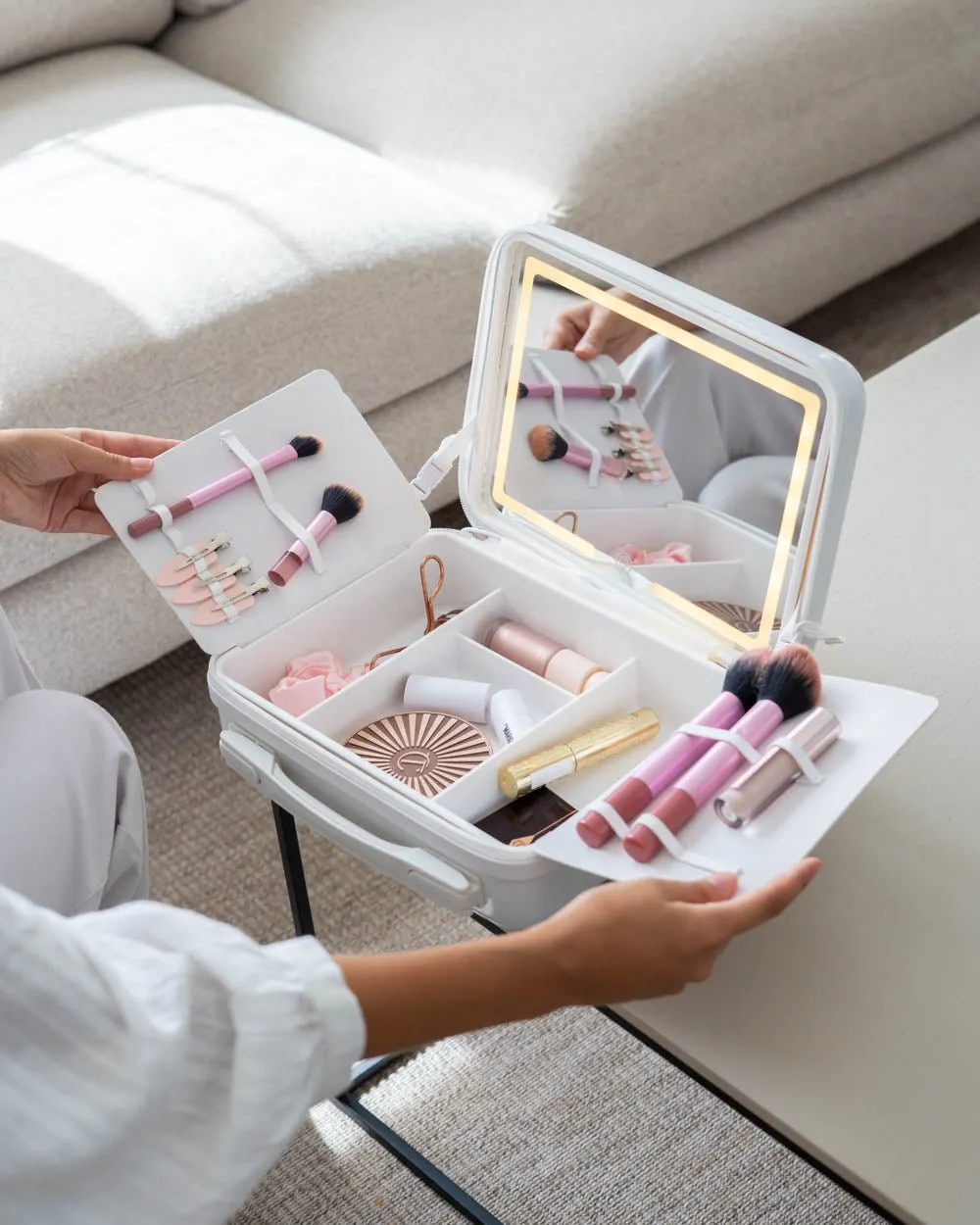 ¡Nuevo maletín para llevar tu maquillaje siempre contigo! Cuenta con un espejo en la tapa con 3 modos de luz ajustables, ideal para maquillarte en cualquier lugar. Incluye también compartimentos inferiores perfectamente organizados y solapas con bandas elásticas para mantener tus brochas y accesorios en su sitio.