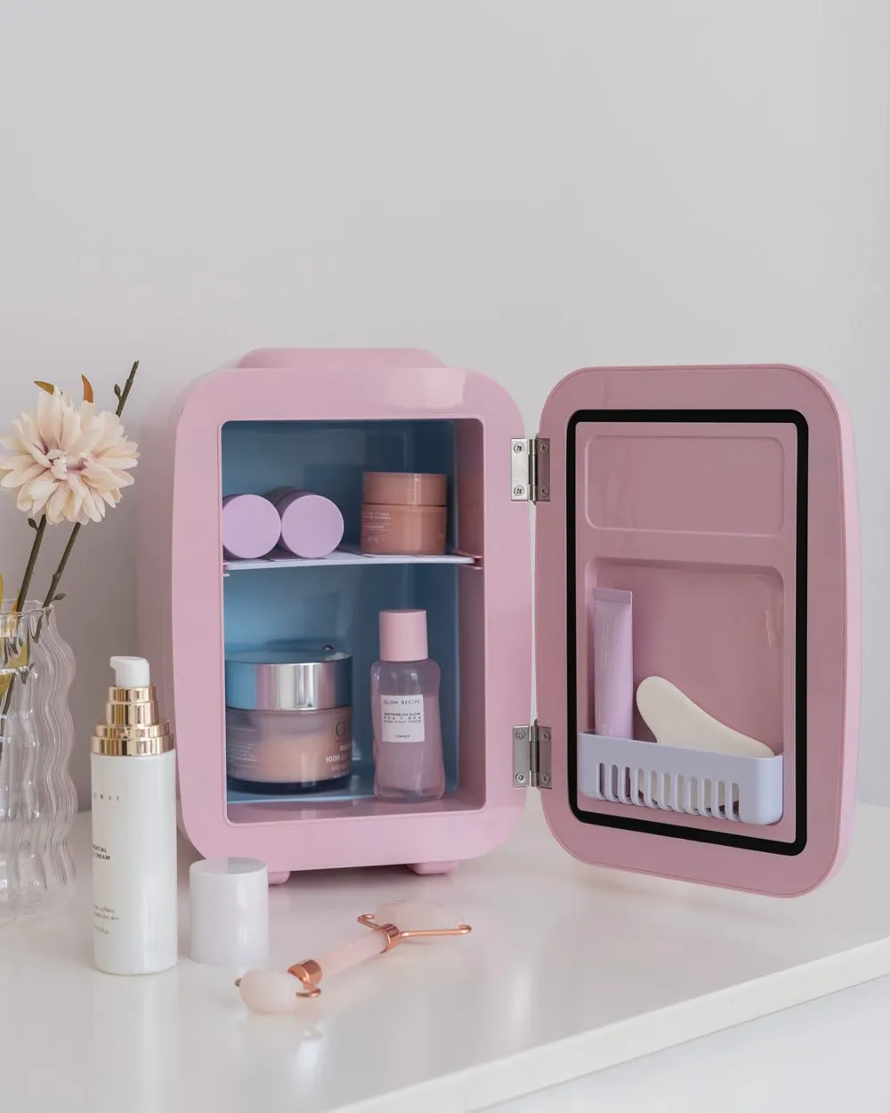 La mini nevera de 4 litros rosa combina un diseño retro y compacto perfecta para almacenar cosméticos, bebidas y pequeños snacks. Función de frío y calor. Sus baldas interiores extraíbles son perfectas para almacenar todos tus productos de belleza en diferentes formatos.