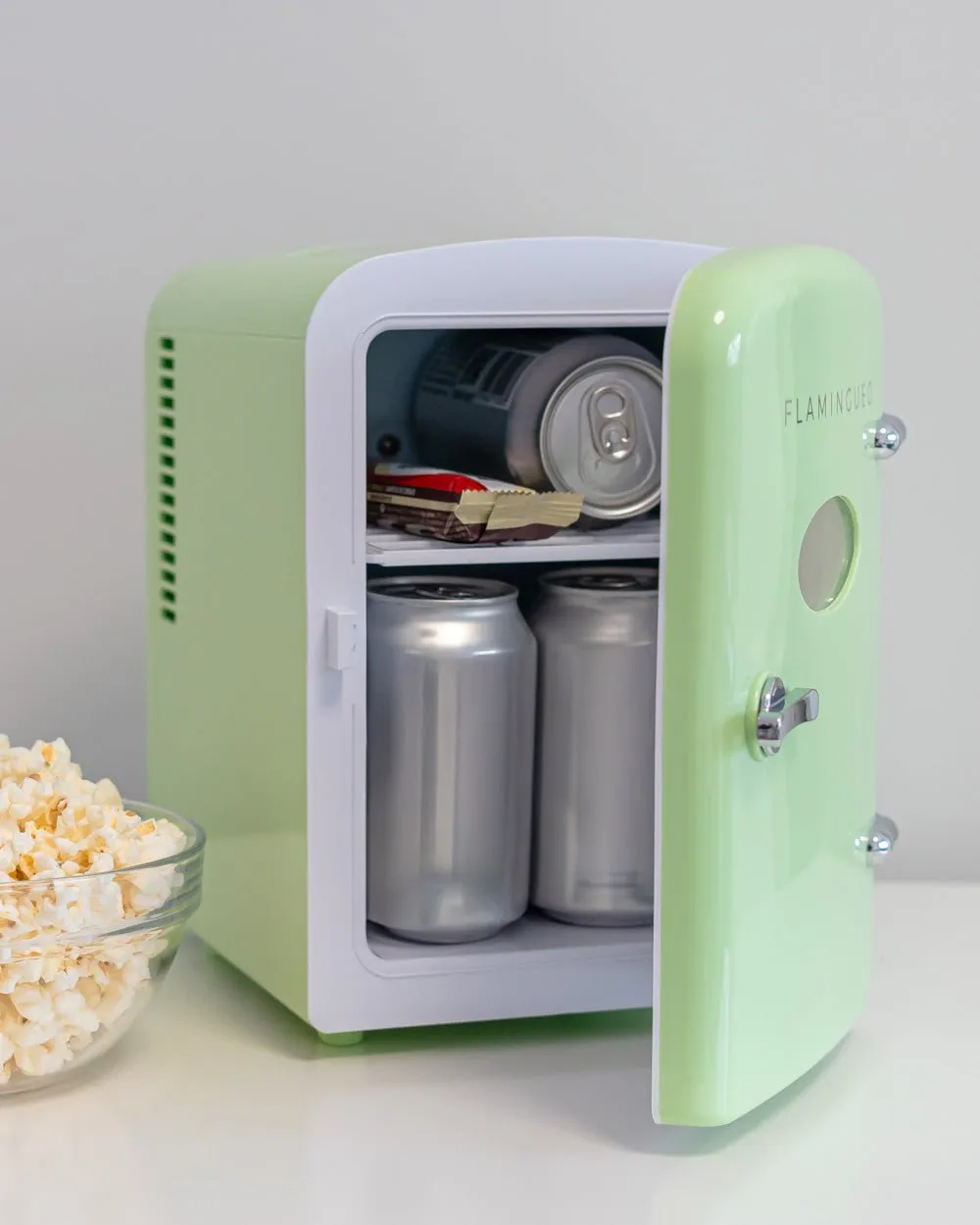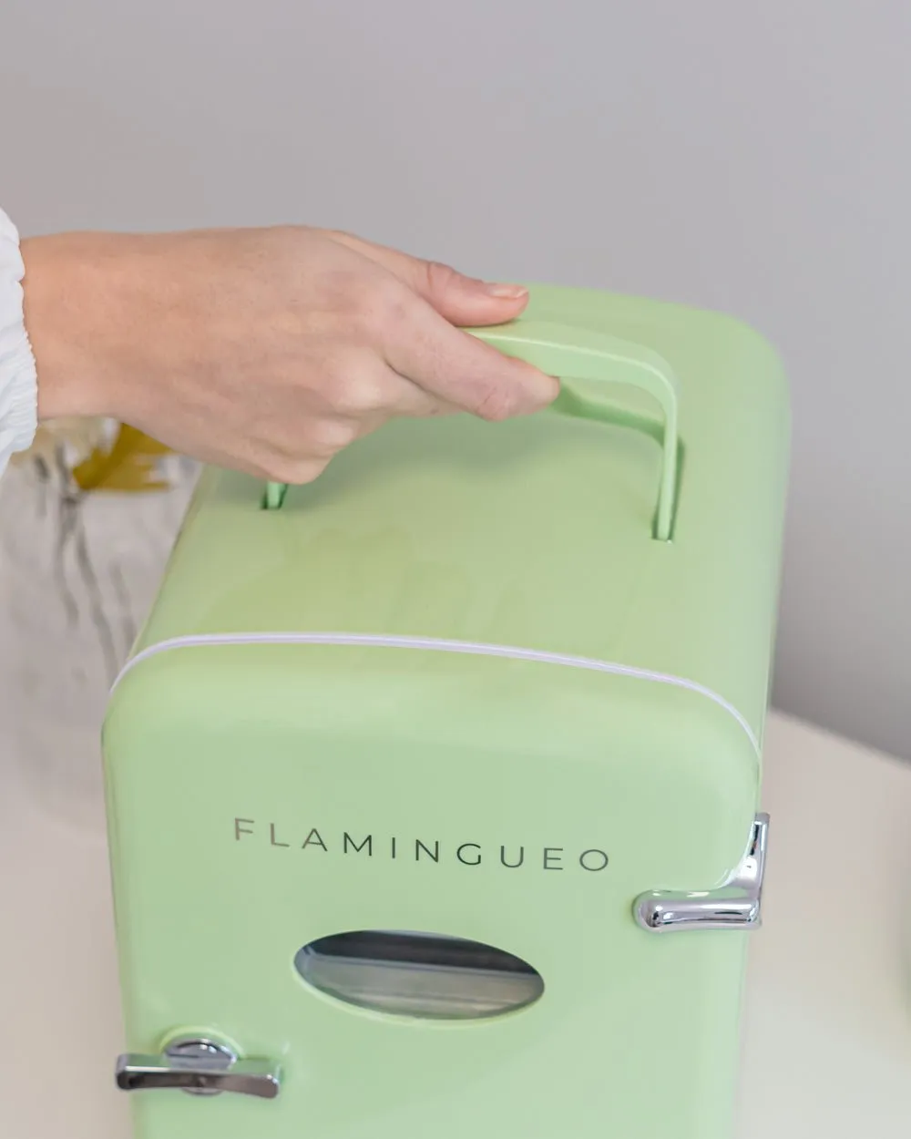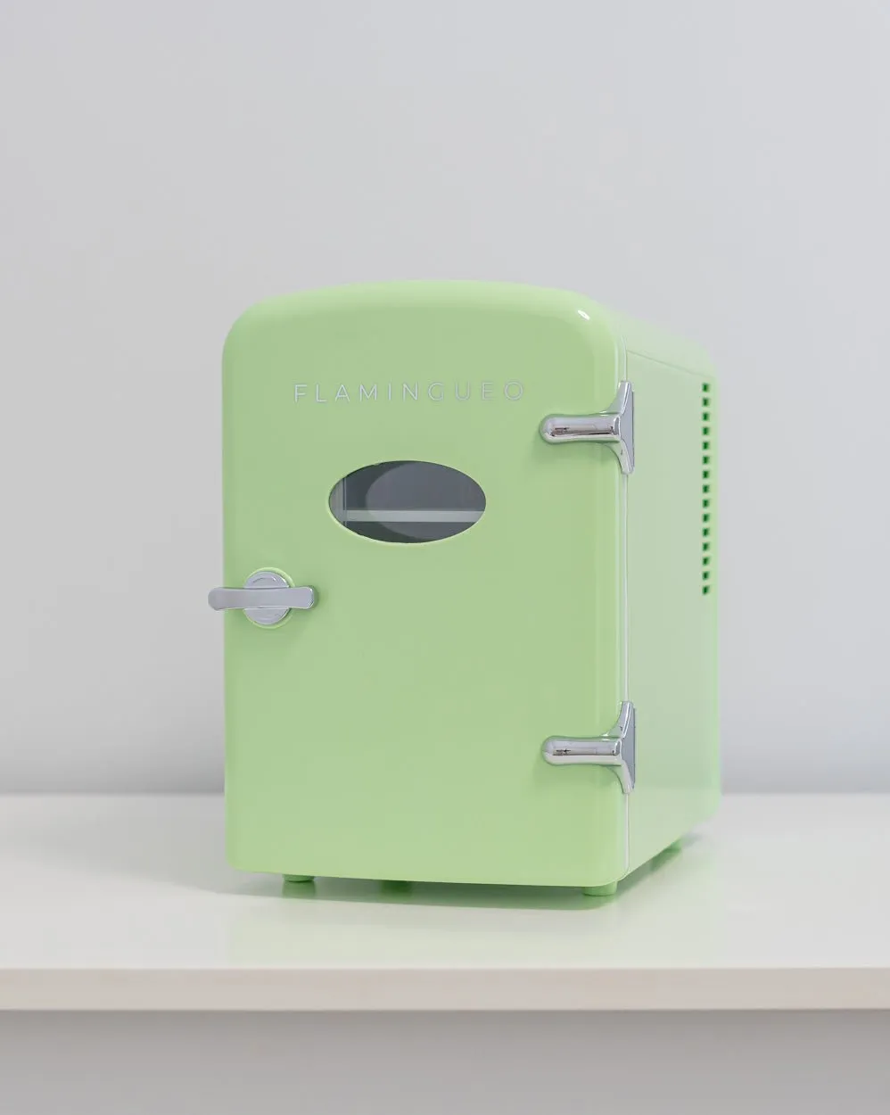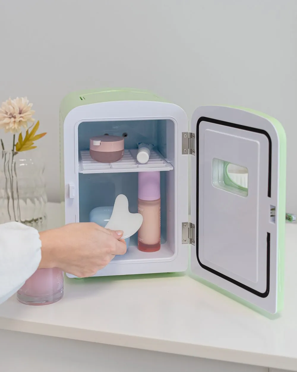 La mini nevera de 4 litros color verde clarito combina un diseño retro y compacto perfecta para almacenar cosméticos, bebidas y pequeños snacks. Función de frío y calor. Sus baldas interiores extraíbles son perfectas para almacenar todos tus productos de belleza en diferentes formatos.