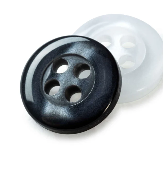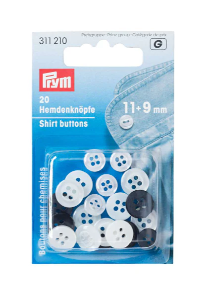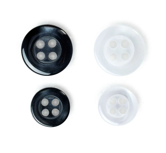 20 botones de camisa o blusa en un set que incluye botones negros antracita y blancos, de 4 agujeros y de 9 y 11 mm. Múltiples usos, son de material sintético y resisten hasta 60ºC de temperatura.
