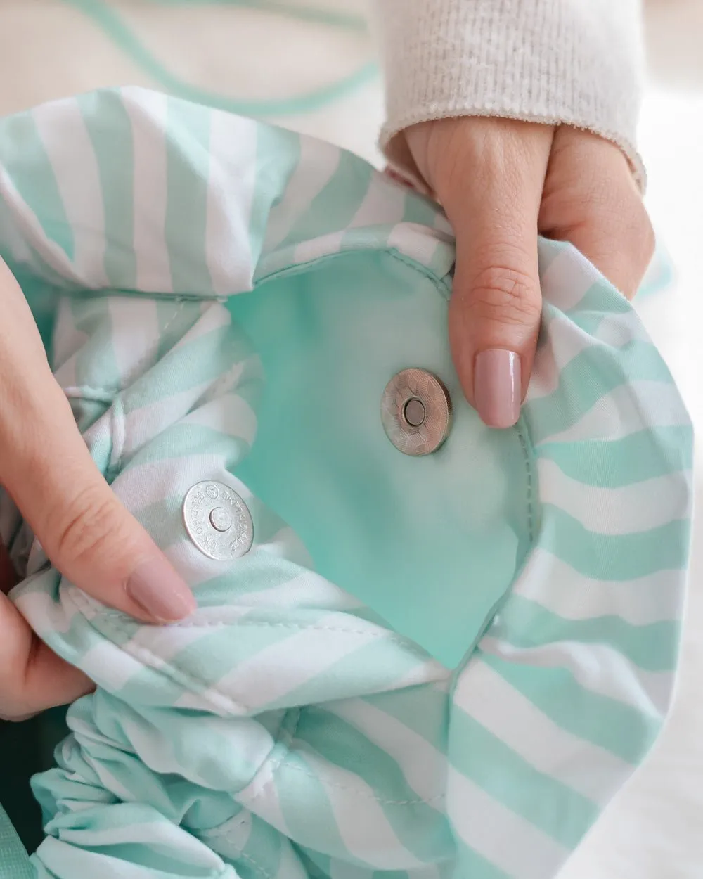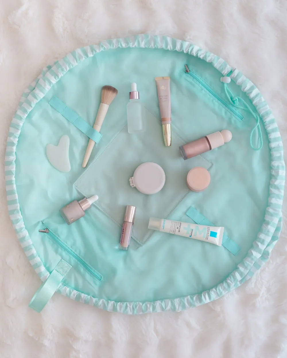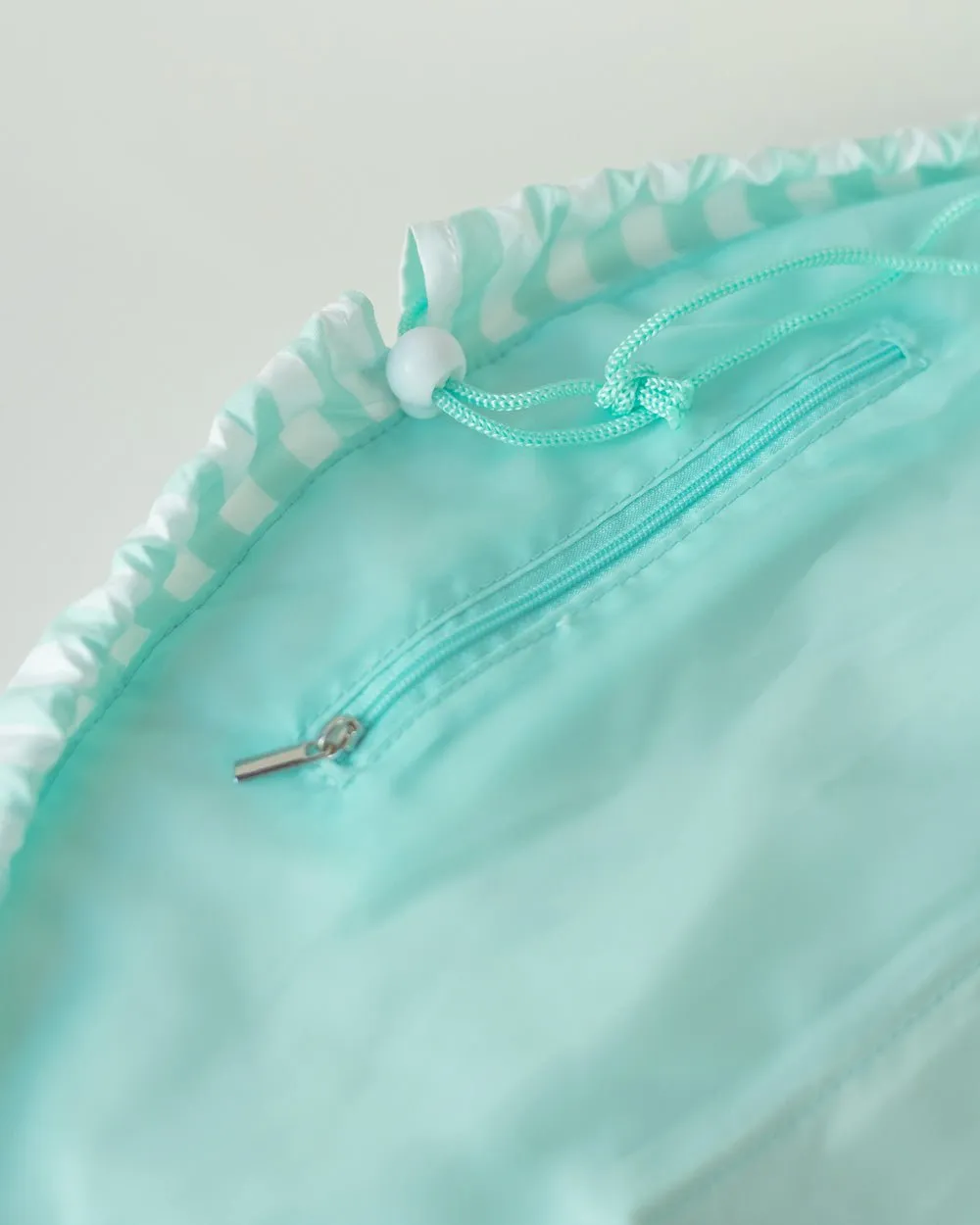Neceser de maquillaje y cosmética color aguamarina estilo bolsa con cordón ajustable. El accesorio perfecto para irte de viaje, ya que puede abrirse por completo para tener a la vista todo su contenido.
