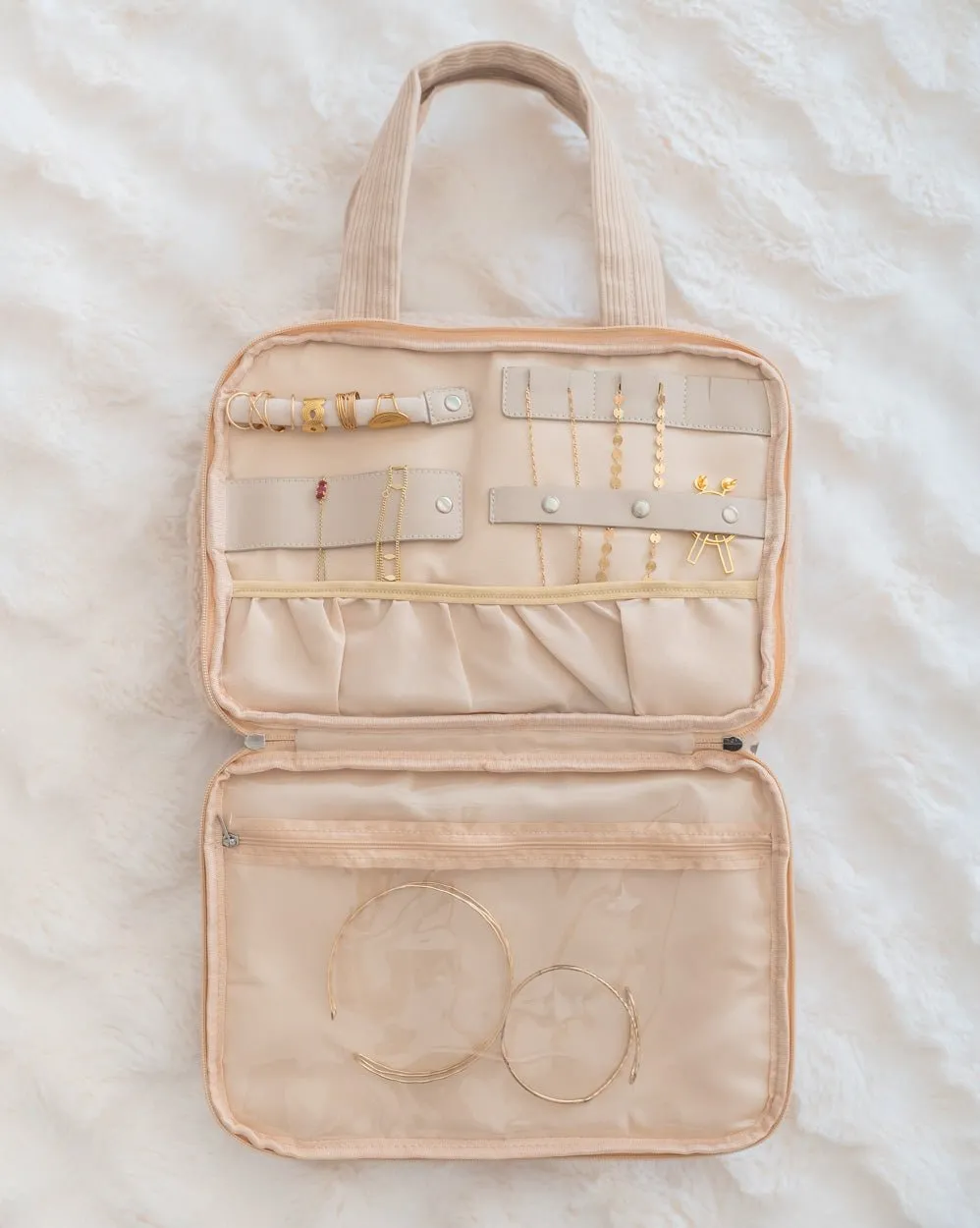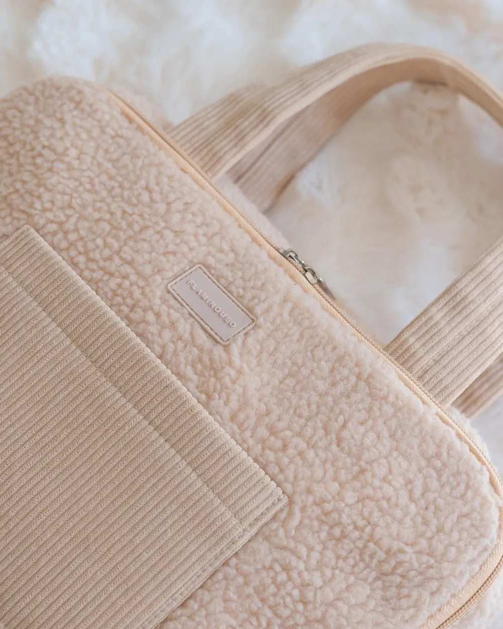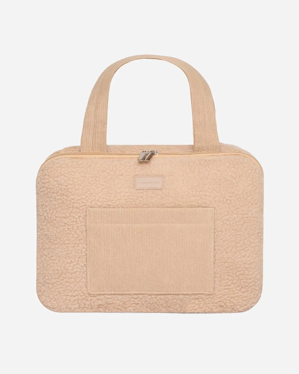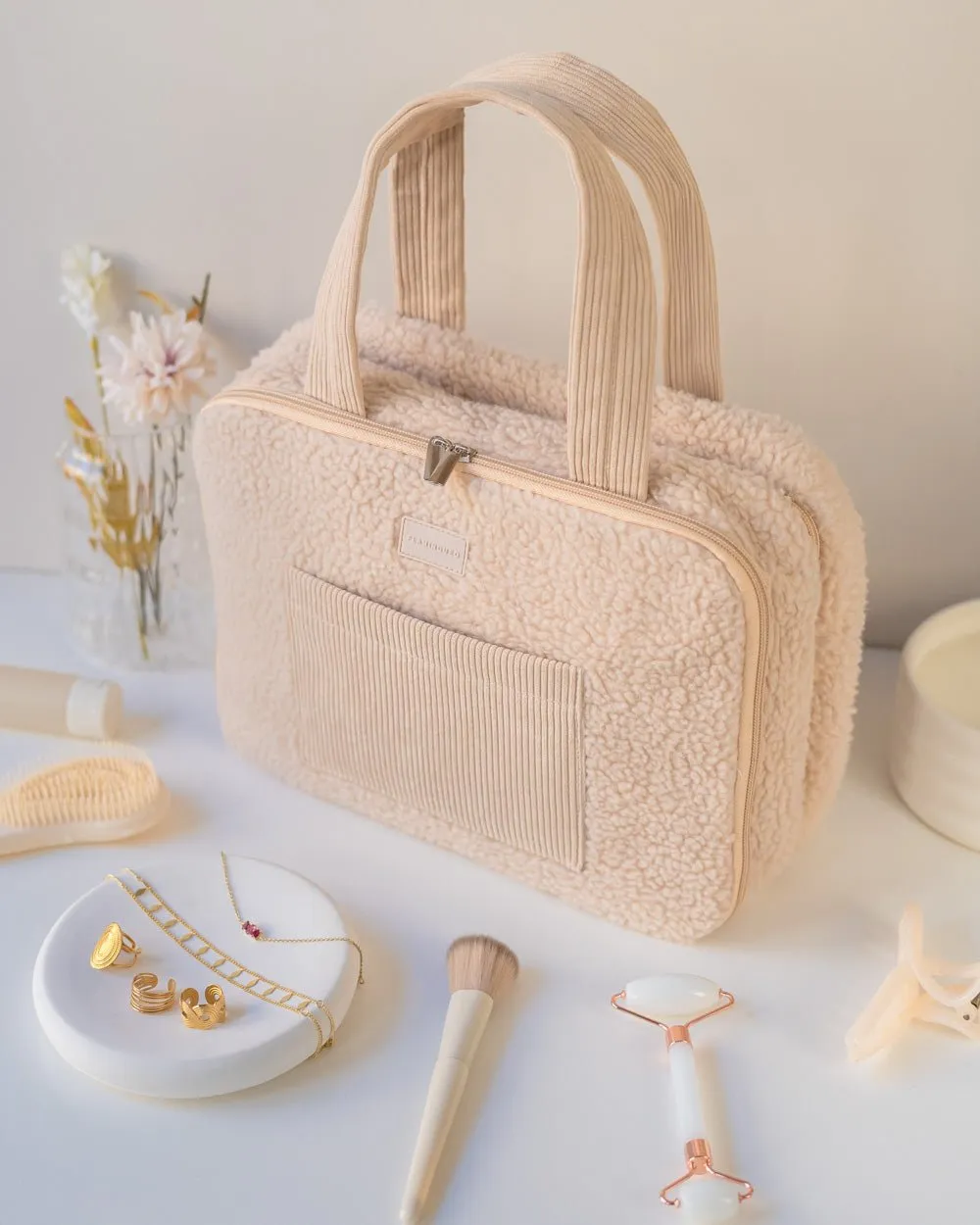Neceser grande plegable color marrón y tejido teddy super suave. Cuenta con varios compartimentos interiores para mantener tu maquillaje o tus joyitas siempre organizadas. ¡Ideal para llevar tus básicos de beauty protegidos siempre que salgas de viaje!