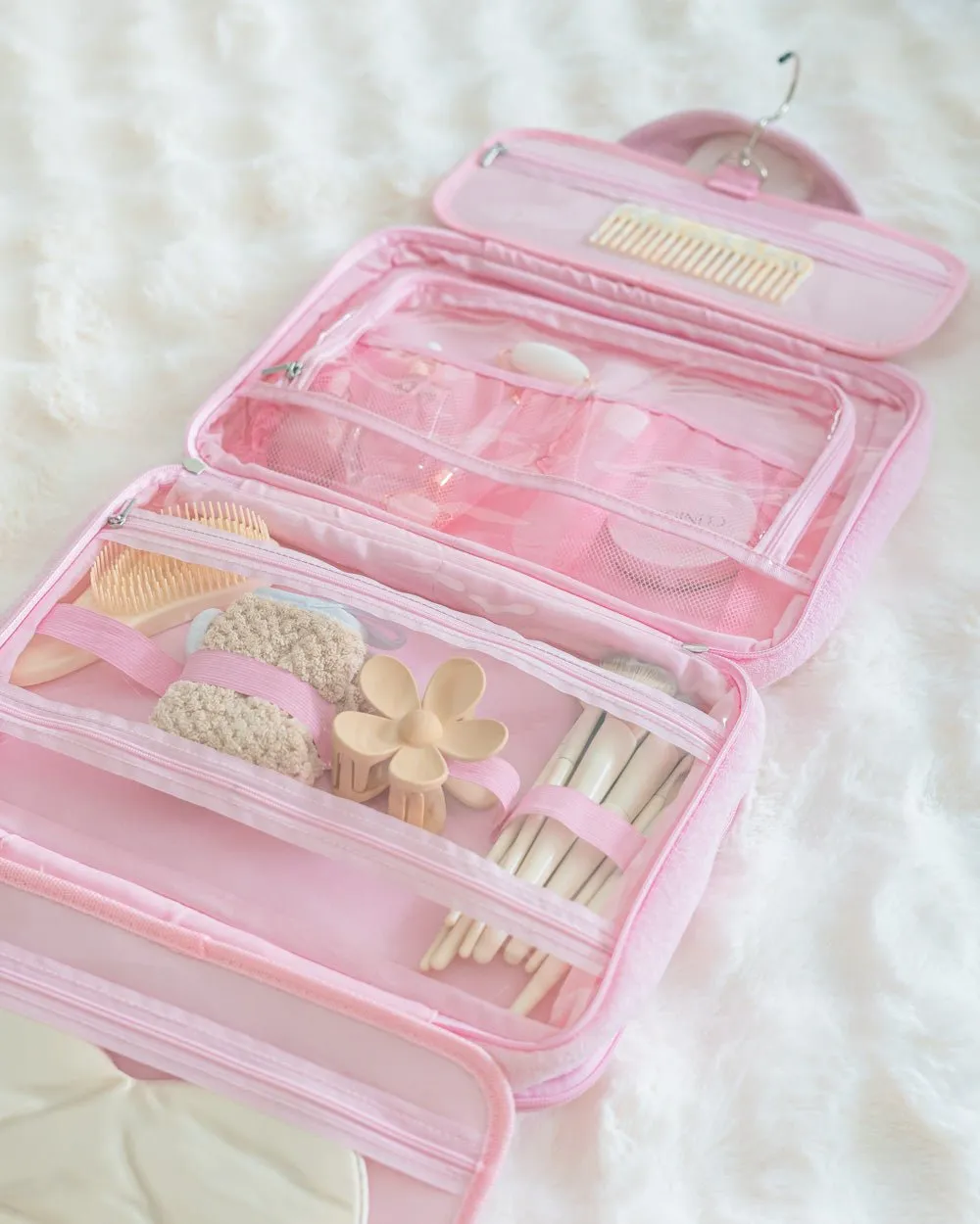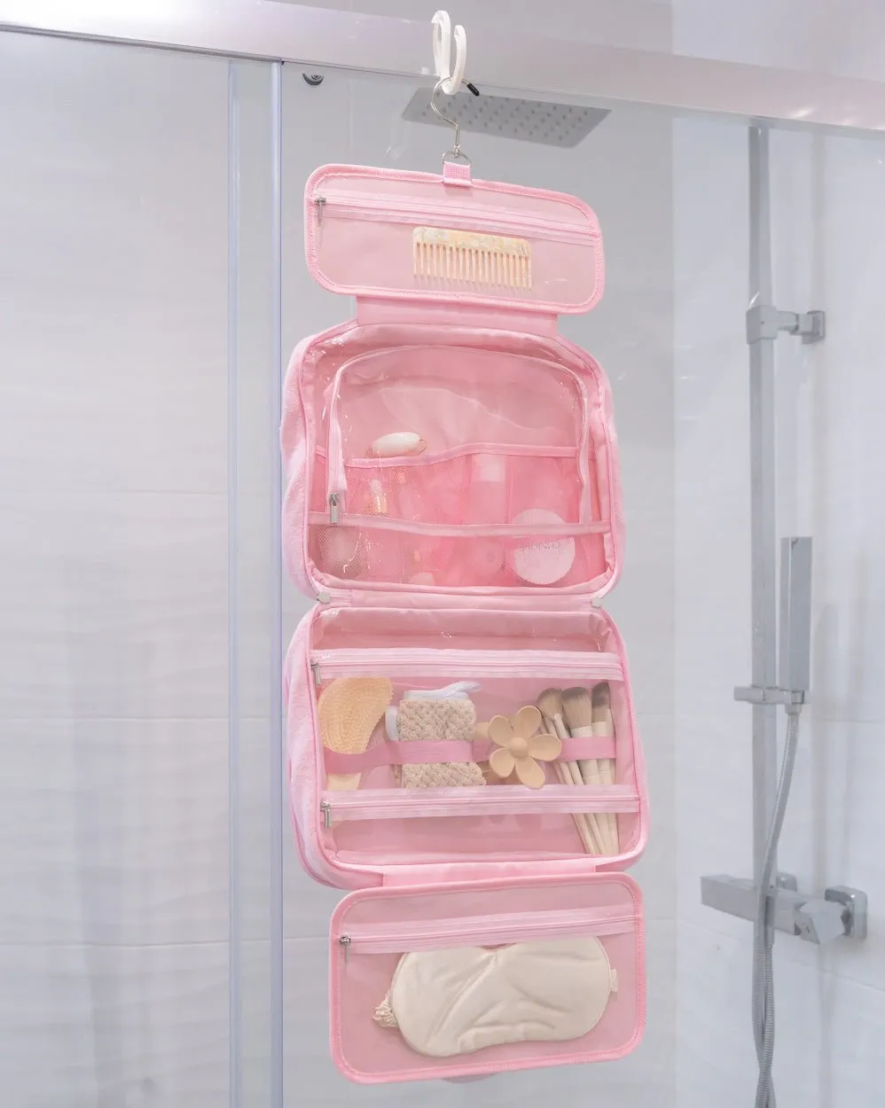 Neceser grande plegable color rosa super suave. Cuenta con varios compartimentos interiores para mantener tu maquillaje o tus joyitas siempre organizadas. ¡Ideal para llevar tus básicos de beauty protegidos siempre que salgas de viaje!